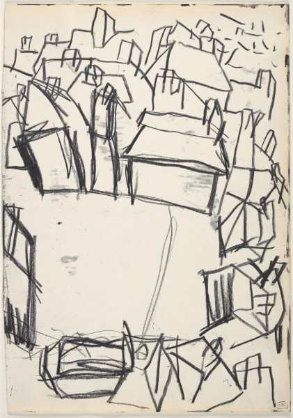 Uproszczony pejzaż architektoniczny Kazimierza Dolnego nad Wisłą, miasta, w którym żyła duża społeczność żydowska.