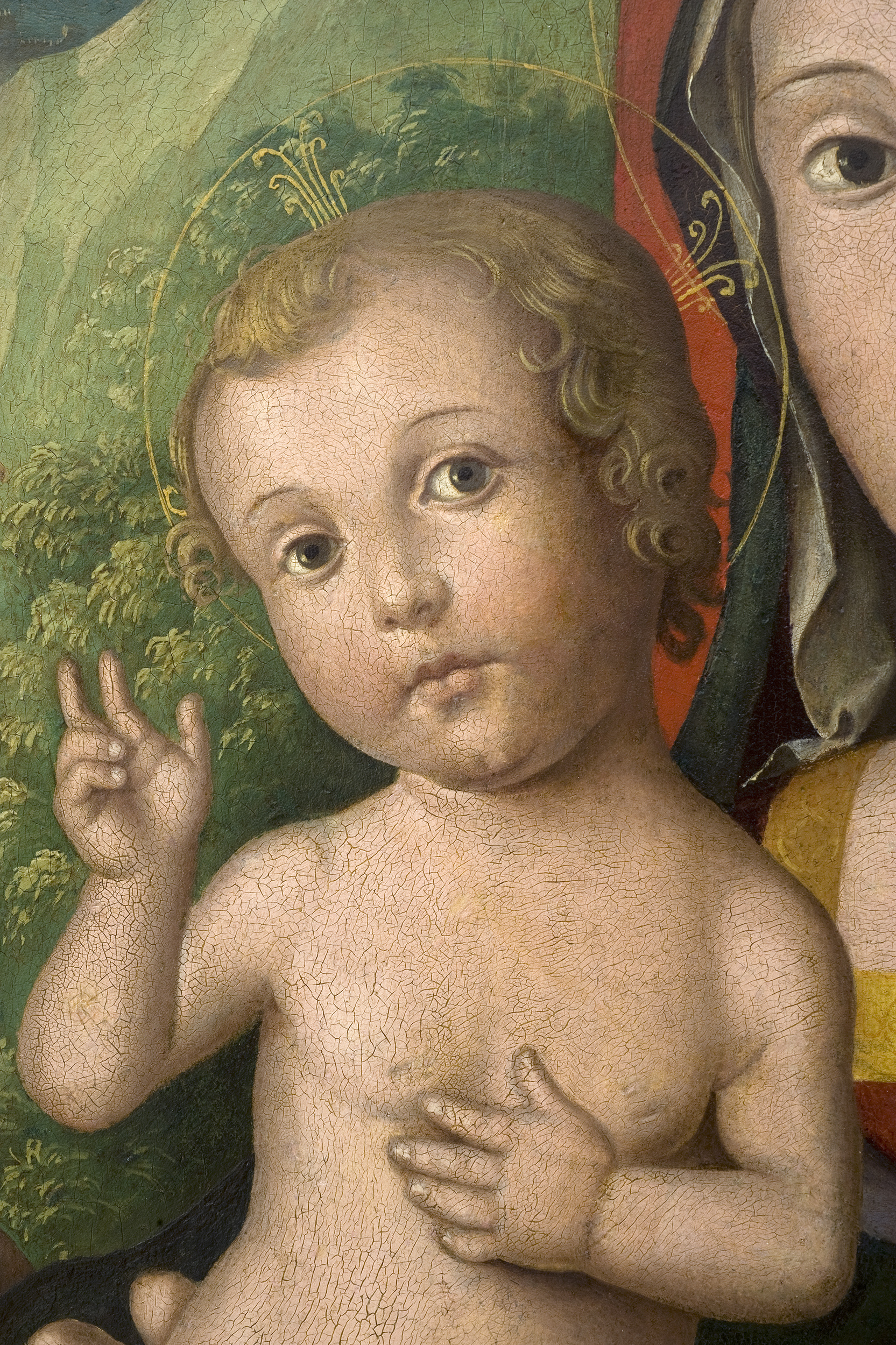Obraz Marca Palmezzana, ukazujący Madonnę obejmującą dłońmi Dzieciątko i stojącego poniżej św. Jana Chrzciciela, reprezentuje wenecką tradycję półfiguralnych kompozycji, które stały się znakiem rozpoznawczym sztuki przełomu XV i XVI w., wywodzącej się z kręgu Giovanniego Belliniego. Oszczędna i jasna kompozycja Madonny z Dzieciątkiem sprzyja koncentracji na jego głównym przesłaniu. Uwagę przykuwają melancholijne, wymowne spojrzenia Matki i Dzieciątka skierowane wprost na widza. Smutek maluje się również na dziecięcej twarzyczce św. Jana Chrzciciela. Zdawać by się mogło, że postaci zastygły w bezruchu w przeczuciu przyszłych zdarzeń. Maryja, prezentując Dzieciątko, ukazuje i potwierdza Jego ludzką naturę. Wskazuje bezpośrednio na wymiar przyszłej Ofiary, co miało ogromne znaczenie w czasach, kiedy pełnia człowieczeństwa Chrystusa pozostawała wciąż tematem dyskusji. W aspekcie teologicznym akcenty te przekładają się na uwyraźnienie prawdy cierpienia Chrystusa w godzinie Męki.