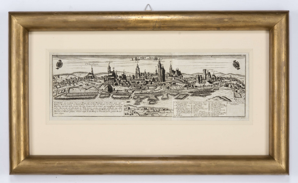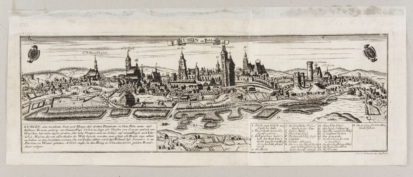 Zamieszczona w albumie Bodenehra panorama Lublina jest powtórzeniem ryciny Brauna i Hogenberga przedstawionej w Civitates Orbis Terrarum (1618). Jest rozkładana, odbita z dwóch płytek, o znacznie zmniejszonej wysokości w stosunku do pierwowzoru. Od panoramy Hogenberga/Brauna różni się detalami. Nad wieżami kościoła Jezuitów i Bramy Krakowskiej widnieje wstęga z napisem: LUBLIN In Pohlen. Po bokach, w miejscach kartuszy herbowych są umieszczone małe, „unoszące” się, przekrzywione tarcze. W dolnej partii wprowadzono dwa prostokątne pola przesłaniające część przedpola kompozycji, zawierające informacje o Lublinie i legendę w języku niemieckim.