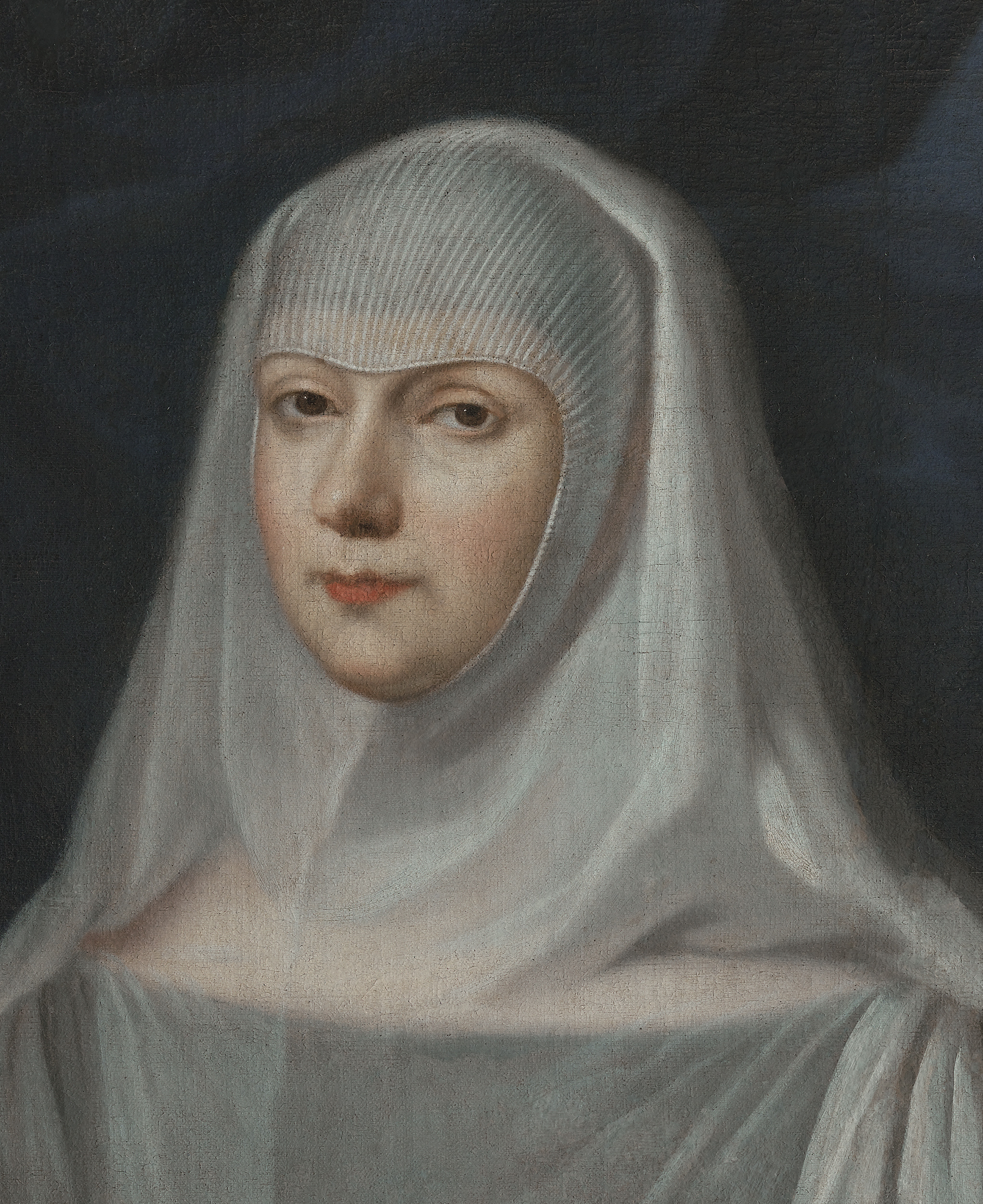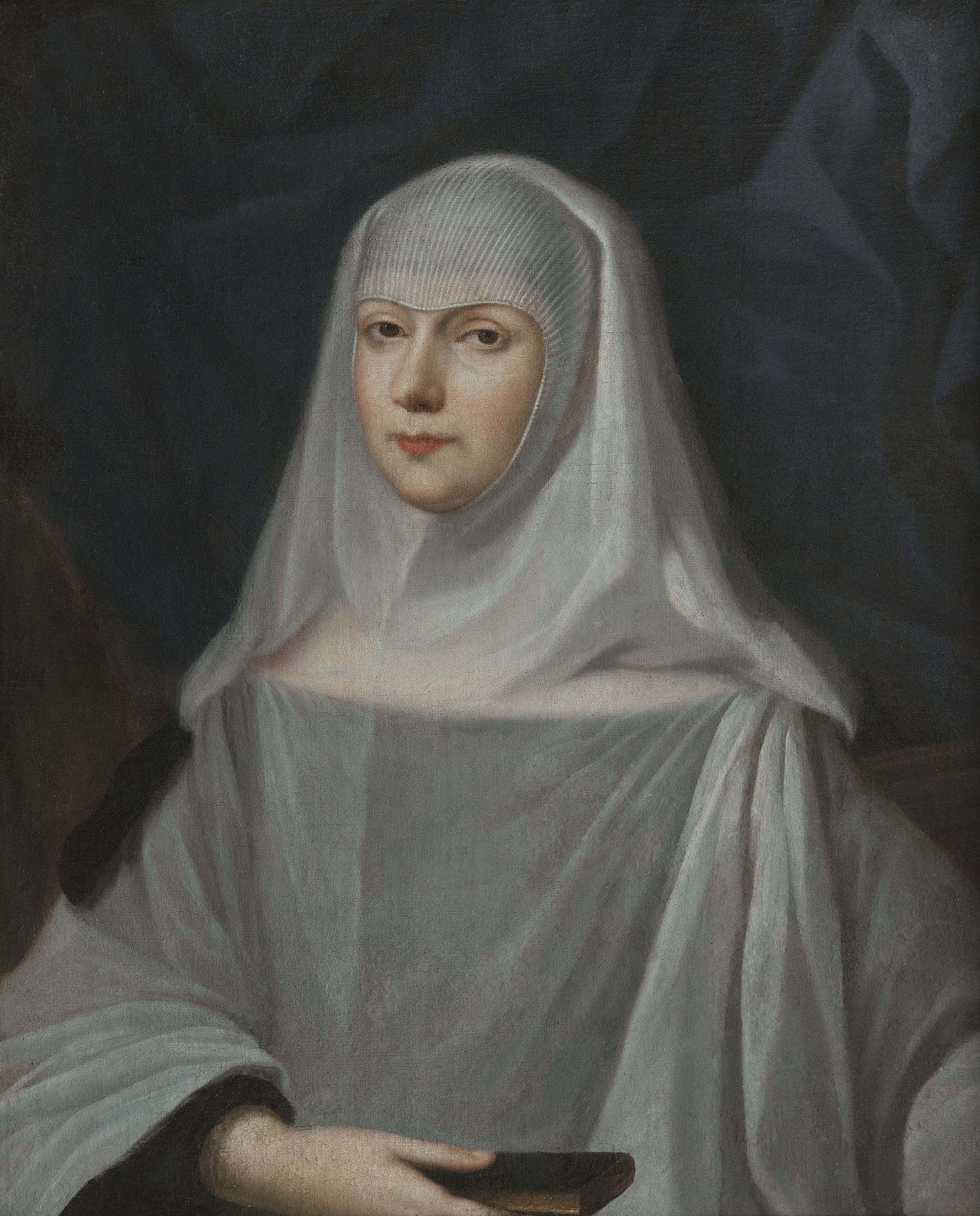 Obraz przedstawia kobietę, której strój nawiązuje do zakonnego habitu. Powściągliwe spojrzenie i ściśnięte usta nie zdradzają lekkiej nawet emocji. Skromna jest także paleta użytych w kompozycji barw. Kobieta ubrana jest w szarobłękitną szatę, a głowę spowija ciasno okalający twarz i spadający na ramiona i piersi woal. W prawej ręce trzyma książeczkę oprawną w czarny materiał. Za tło ma błękitną zasłonę.