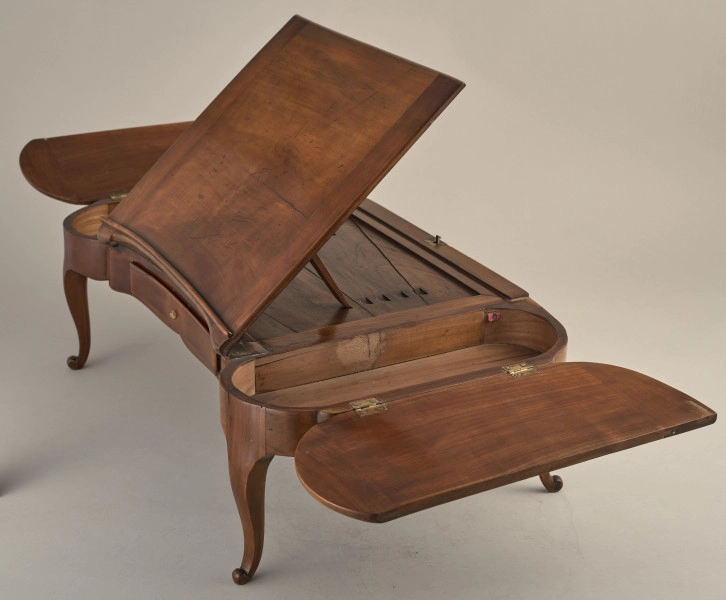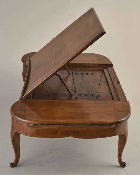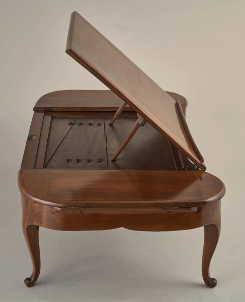 Pulpitów używano do czytania lub pisania. Mebel zawdzięcza nazwę łacińskiemu „pulpitum” stanowiącemu odpowiednik greckiego „proskenion” w teatrze starożytnym. Prezentowany pulpit stołowy należał do dawnych zbiorów zamkowych. Niewykluczone, że przywiozła go Izabela z Czartoryskich Lubomirska, która pod koniec życia zgromadziła w Łańcucie wyposażenie pochodzące ze swoich warszawskich rezydencji. Fornirowanemu meblowi nadano obłe kształty typowe dla stylu Ludwika XV – nazywanego imieniem monarchy francuskiego panującego w latach 1715 – 1774. Umieszczona na pulpicie sygnatura jednoznacznie wskazuje na wykonawcę, którym był ebenista Pierre Migeon (1696-1758). Ebenistami nazywano artystów-rzemieślników wytwarzających wysokiej klasy fornirowane, intarsjowane meble. Pracownia rodziny Migeon mieściła się w Paryżu przy Rue de Charenton. Działający głównie w drugim ćwierćwieczu XVIII w. Pierre Migeon był jednym z prekursorów stosujących w meblarstwie europejskim mahoń. Opisywany sprzęt jest typowym dla wytwórcy dziełem. Mistrz, wykorzystując tradycyjne formy mebli, zdobił je w nowatorski sposób starannie dobranymi cienkimi okleinami. Zazwyczaj nie stosował przy meblach modnych wówczas odlewów z brązu. W czasach, gdy popularne było łączenie okleiny z różnych gatunków drewna tworzących barwne intarsje, ebenista często wykańczał powierzchnie swoich wyrobów monochromatycznie dobranymi lub jednorodnymi fornirami. Uzyskiwał przez to efekt powściągliwej niewymuszonej elegancji. Jego wyroby wyróżniały się wygodą użytkowania i praktycznością, czego dowodem jest prezentowany pulpit stołowy.