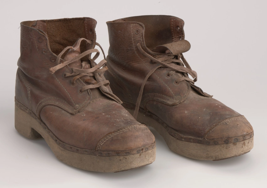 Wysokie drewniane podeszwy z obcasami chroniły zarówno przed zimnem, jak i niedogodnościami dróg. Zrobione z litego, surowego kawałka drewna, nie były, jak można wnosić ze stanu zachowania, podklejone cieńszą gumową czy skórzaną podeszwą, ani specjalnie zabezpieczone. Jedynie obcasy i przód buta wzmocnione zostały płaskimi metalowymi flekami w kształcie półksiężyca, przybitymi czterema gwoździami. Te skórzane buty z drewnianą podeszwą pokazują, jak starannie przygotowywał się Oberländer do dalekiej drogi.