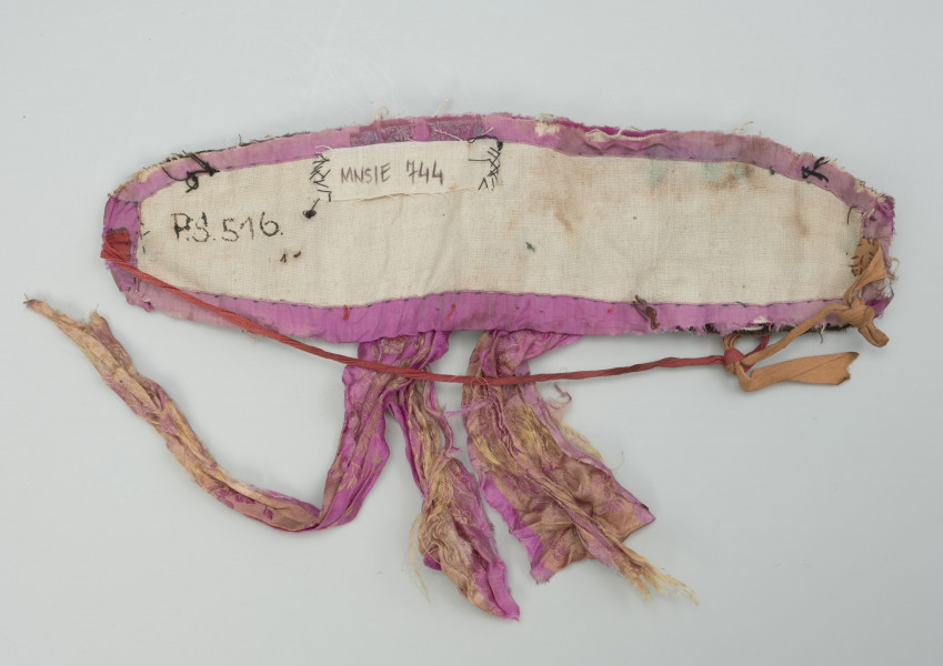 haft płaski kładziony, jedwabna wstążka, cekiny, płótno lniane, aksamit