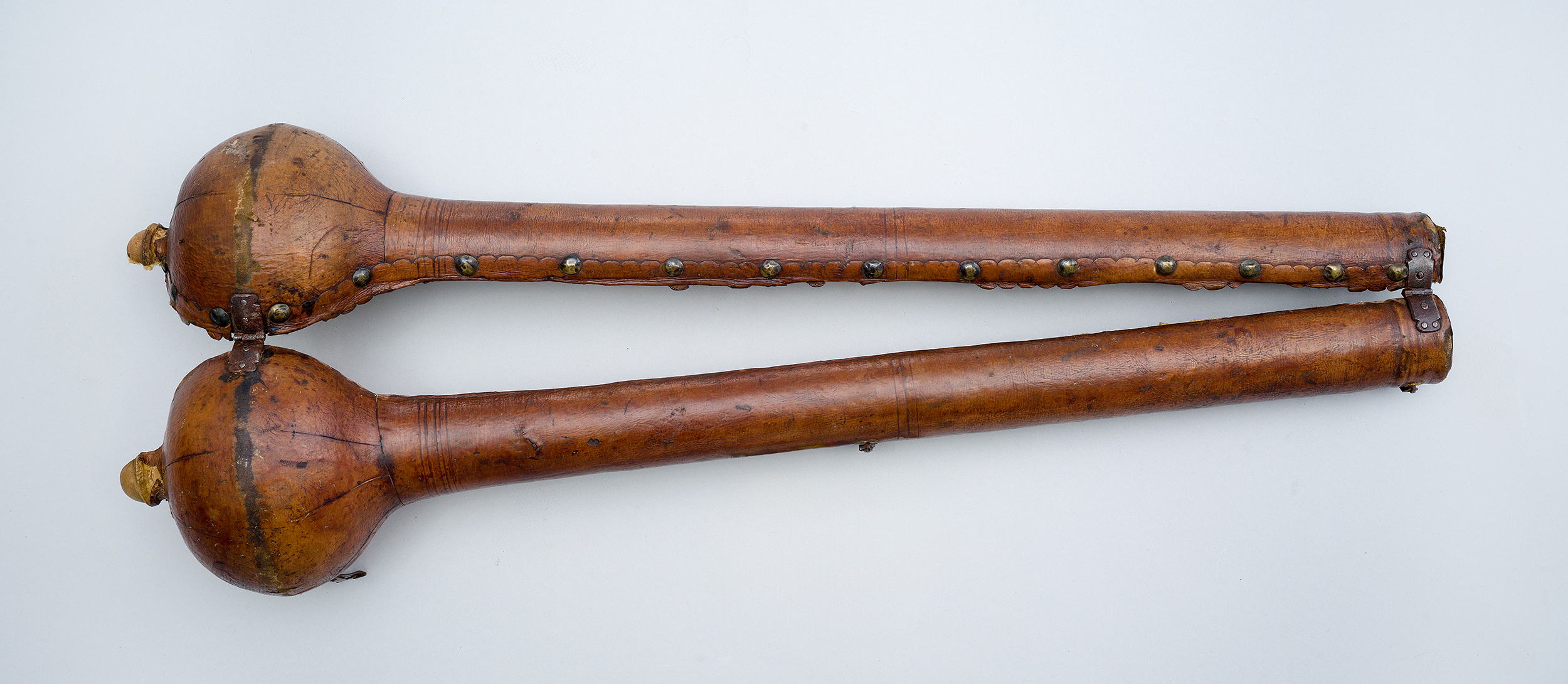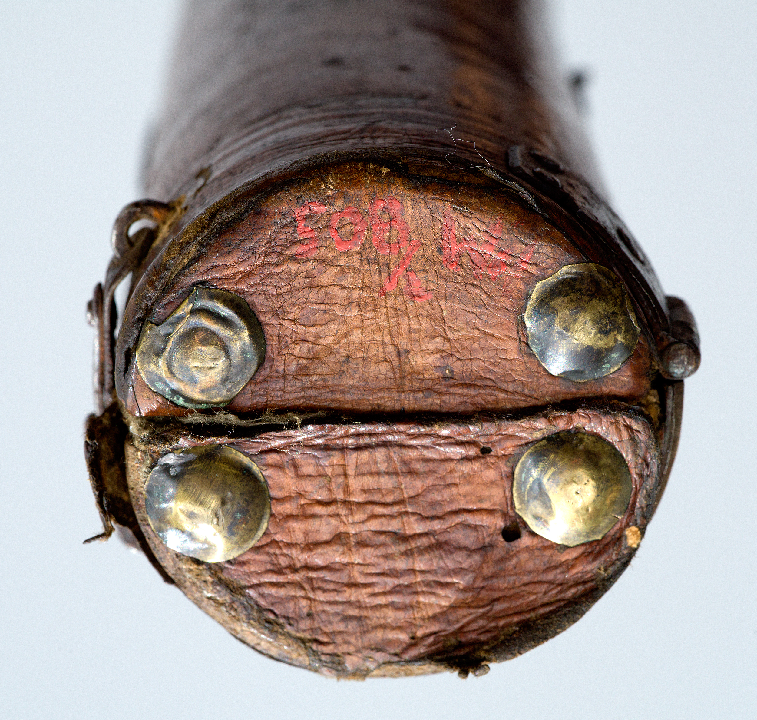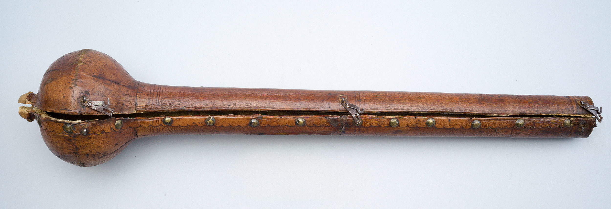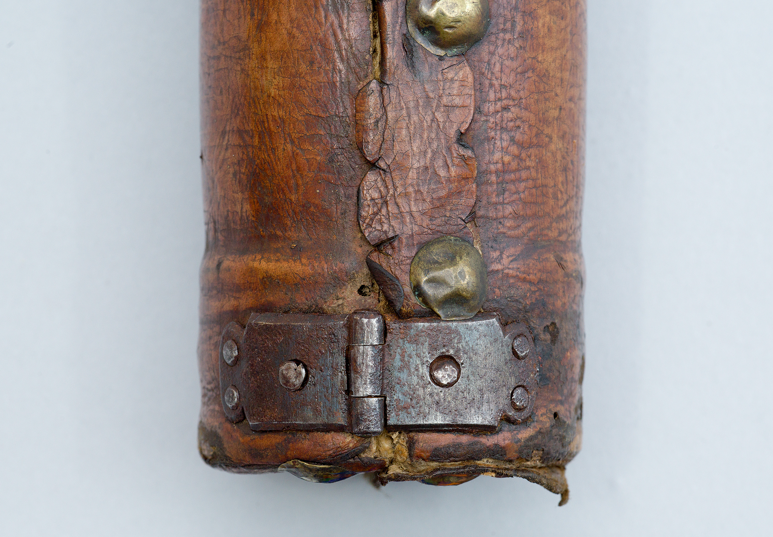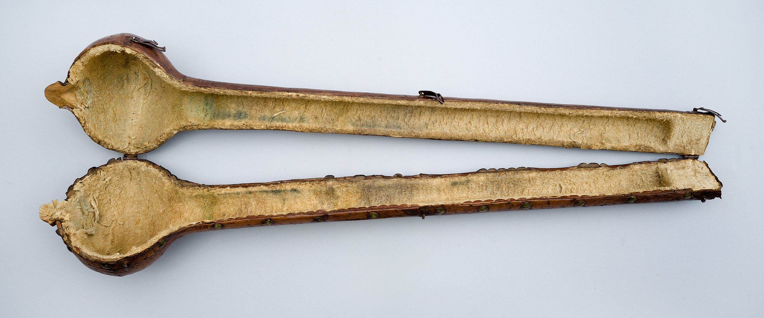 Futerał – z zewnątrz kryty brązową skórą, wewnątrz grubą tkaniną bawełnianą – składa się z dwóch części. Z jednej strony spięty jest zawiasami, a z drugiej – zapinany na skobelki z haczykami.