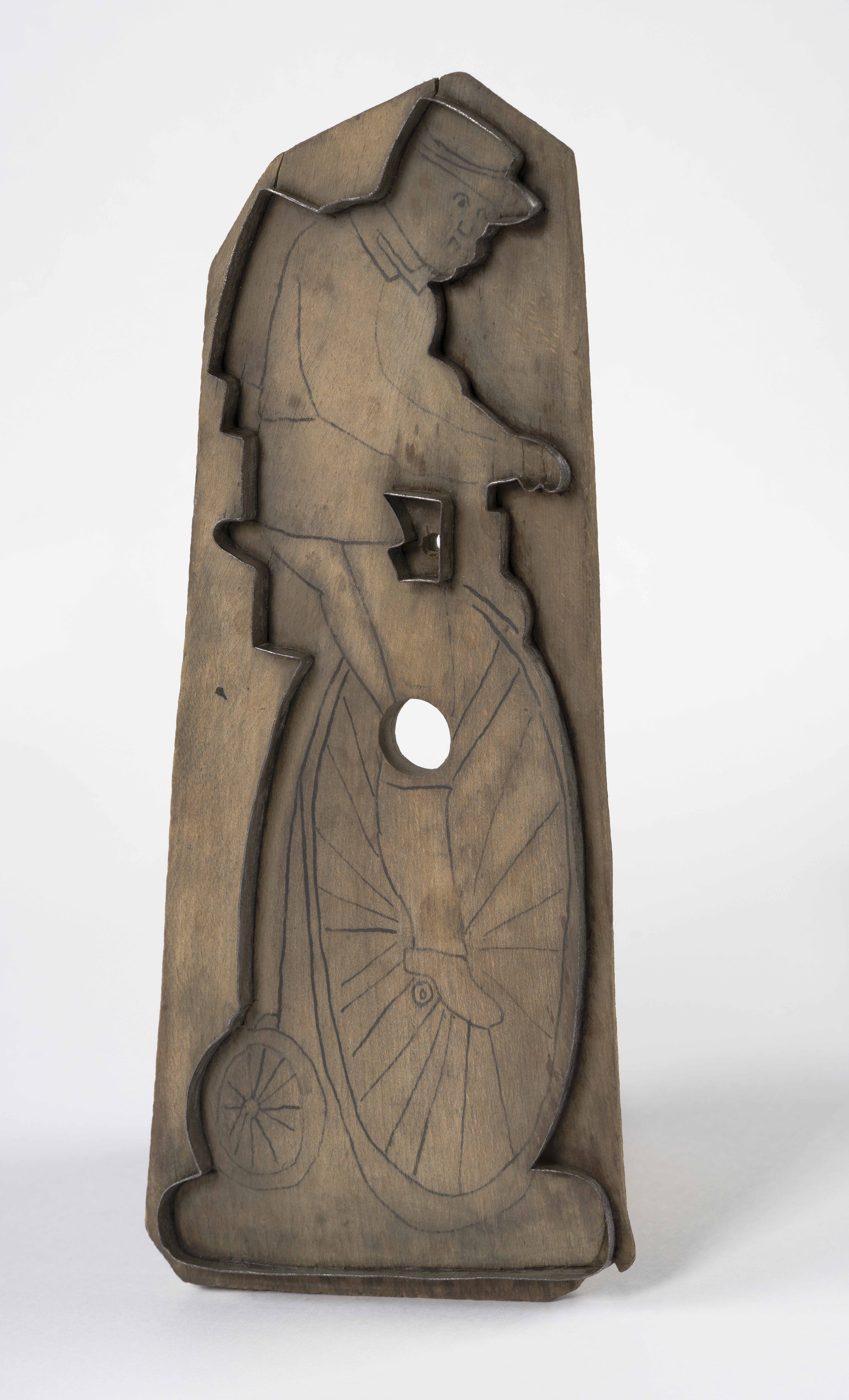 Jest to jednostronna forma piernikarska do wycinania ciastek. Znajduje się na niej przedstawienie rowerzysty na welocypedzie, czyli rowerze o przednim kole bardzo dużym i o wiele mniejszym tylnym. Kierujący pojazdem ma na plecach tornister, a na głowie czapkę z daszkiem. Wewnętrzny rysunek nie był wyryty, a więc piernik po upieczeniu miał tylko ogólny zarys. Możliwe, że wzór był wykorzystywany przy nakładaniu lukru na gotowy wypiek. Jest to jednak tylko jedna z możliwości. Forma ta stanowi przykład odmiennej techniki otrzymywania pożądanego kształtu. Zamiast wciskania ciasta w formę, wystarczyło rozwałkować placek i z niego wycinać konkretne kształty.