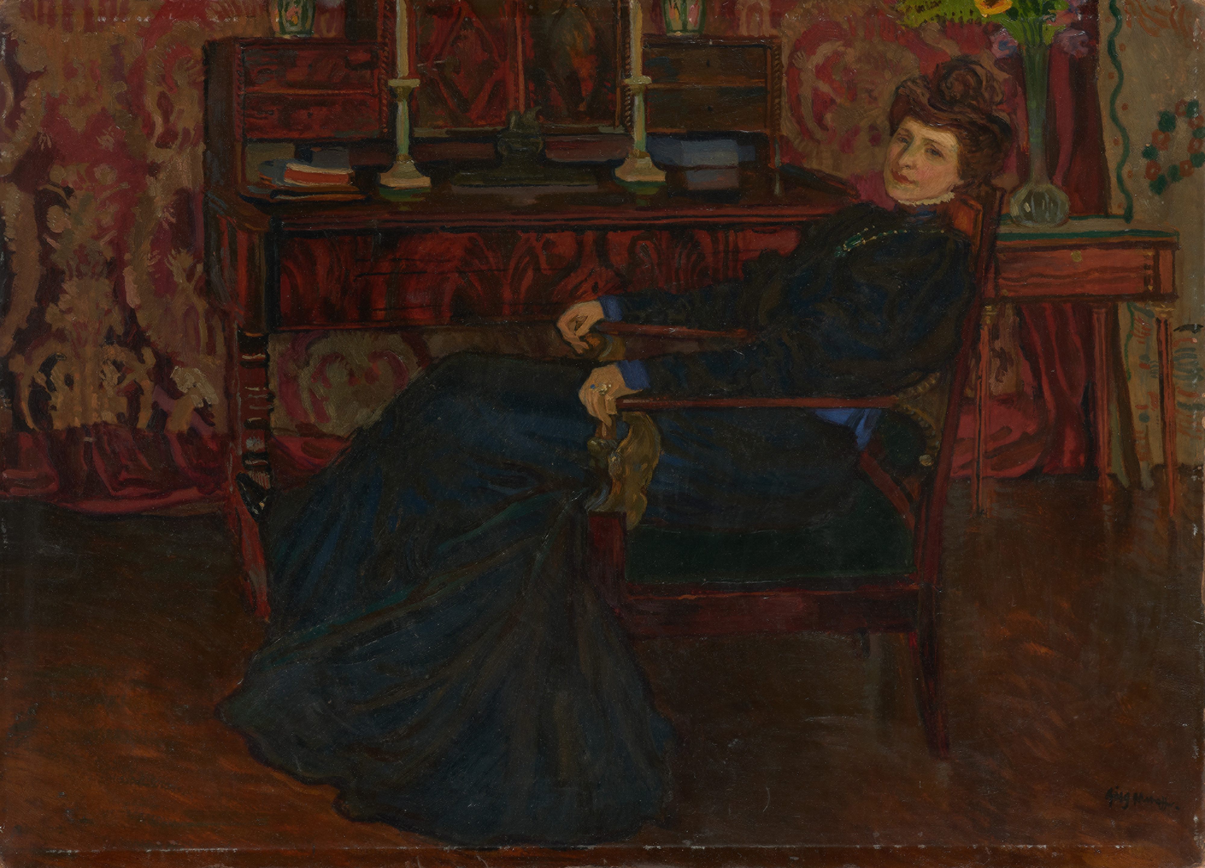 Wizerunek siedzącej wygodnie w fotelu żony artysta zaprezentował na tle domu. Można z niego wyczytać ciepłe spojrzenie, pogodny wyraz twarzy z zaznaczonym lekkim rumieńcem. Ukochana ubrana jest w czarną, elegancką suknię, włosy ma upięte w kok. Kobieta siedzi na tle przedmiotów domowych, które stanowią ważny element przedstawienia dla artysty. Odnajdujemy tu konkretne meble, książki, lichtarze, wazony – wszystko skrupulatnie pokazane i ujęte jest w dość stonowanej kolorystyce ograniczonej głównie do brązów i czerni. Na tym tle kontrastuje twarz i dłonie żony, a na drugim planie książka i świeczniki. Kompozycję, mimo kilku planów, daje się odczuć jako płaską. Co jednak zwraca szczególną uwagę, zarówno meble, jak i ściany pokryte są wzorami – zostały potraktowane malarsko, co sprawia, że przedmioty życia codziennego nabierają charakteru dzieł sztuki.