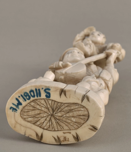 Japońska figurka ulicznego kuglarza – sztukmistrza, grającego na instrumencie, trzymającego na ramionach ponad głową chłopca – linoskoczka. W ręku kuglarz trzyma balans z piór. Chordofony to grupa instrumentów muzycznych, w których źródłem dźwięku jest drgająca struna, rozciągnięta pomiędzy dwoma punktami. Instrument zbudowany jest z drewnianego pudła rezonansowego oraz strun i główki.. Kuglarze to dawni wędrowni artyści, bawiący publikę swymi cyrkowymi sztuczkami i iluzją. Japońska produkcja małych, rzeźbionych figurek wzrosła około 1880 roku, były to bibeloty przeznaczone na eksport do Europy. Przedmioty ozdobne tego typu znajdowały swoje zastosowanie jako ozdoby biurek i mebli, zwane były okimono lub netsuke, stały się popularne wśród rosnącego rynku kolekcjonerstwa w Polsce i Europie. Japonia, sygnowane Ichigyoki (?), druga połowa lub koniec XIX wieku.