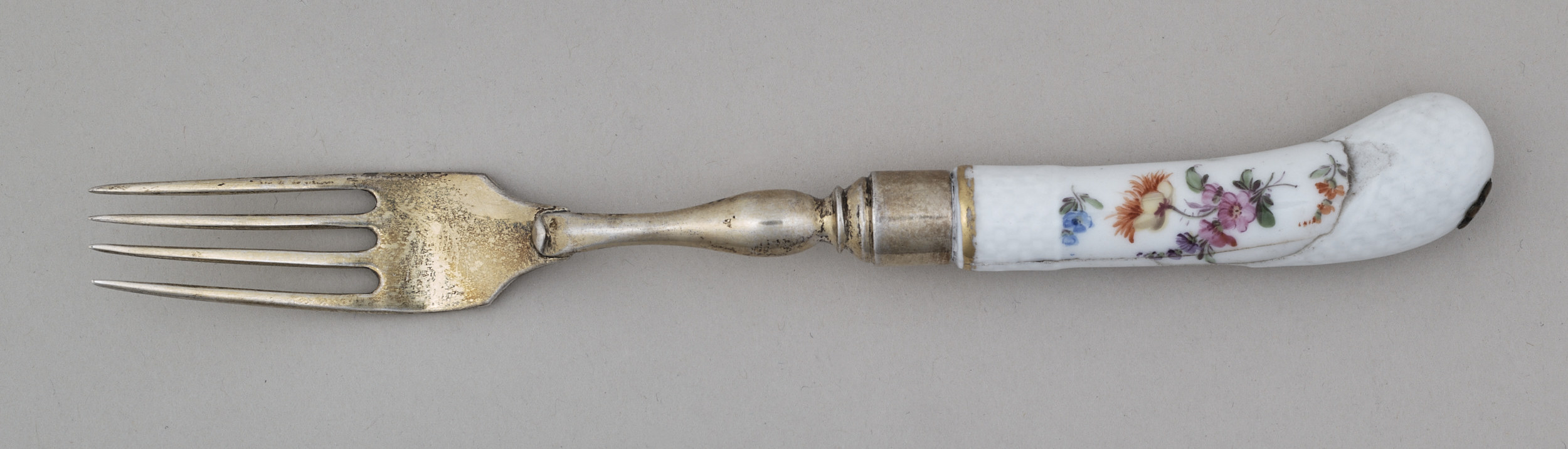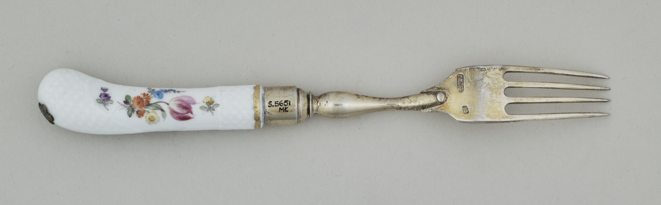 Widelec śniadaniowy, czterozębny. Zęby wygięte, zwężające się przy zakończeniu. Trzonek z nakładką ze srebra złoconego z białej porcelany, wygięty w prawo, ozdobiony plastycznie po obu końcach wypukłym zarysem szachownicy. Posiada dekorację malarską po obu stronach w postaci kolorowych kwiatów. Na awersie bukiet złożony z malw, róży polnej i fioletowego groszku. Na rewersie różowy tulipan, nagietki i niebieska ostróżka oraz chaber. Na zębach od spodu punca „Malcz” i próba „12”.