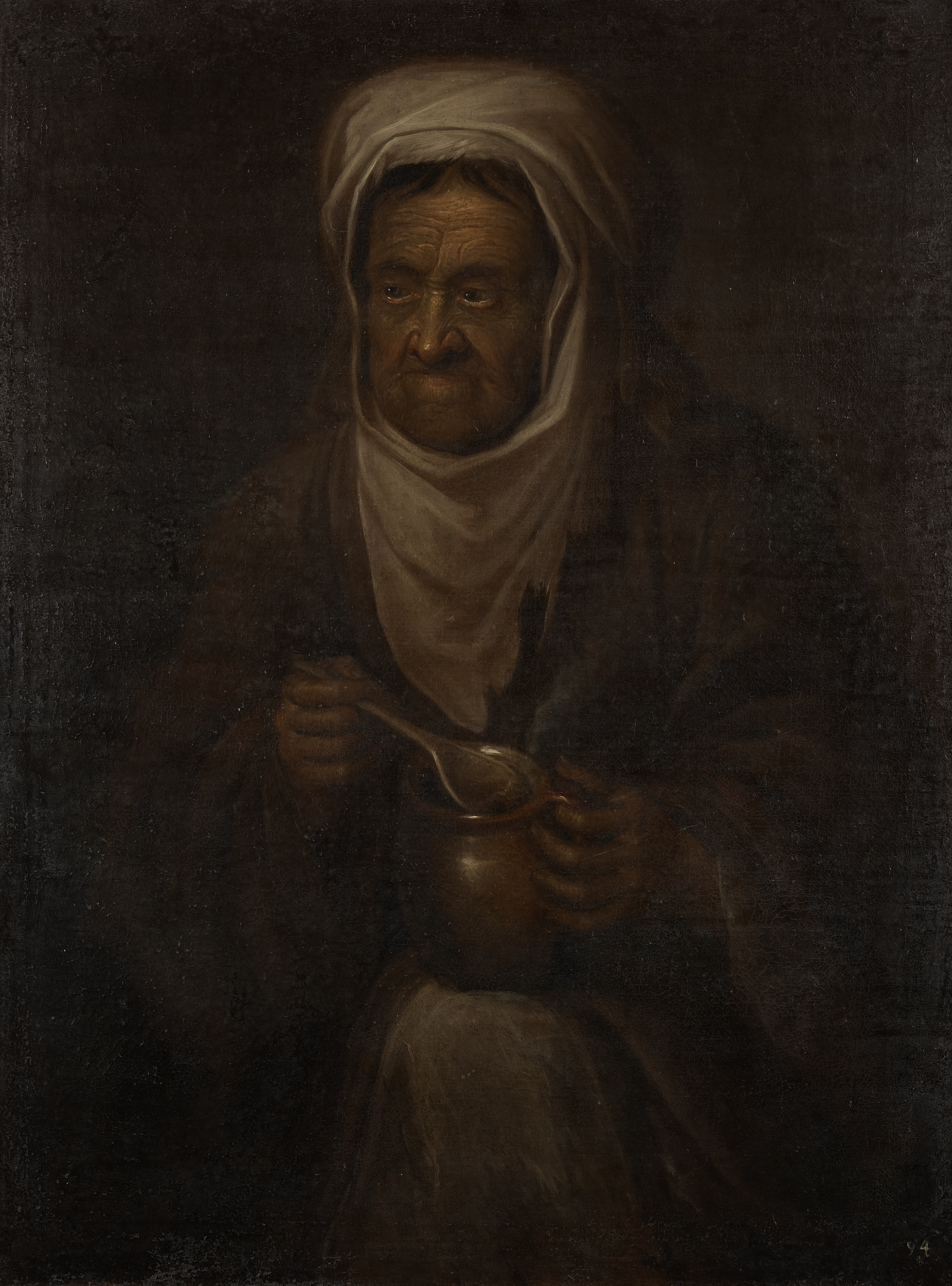 Obraz z kolekcji Potockich, dawnych właścicieli zamku łańcuckiego, przedstawia portret starej kobiety na neutralnym tle. Portretowana ukazana do kolan, siedząca, na kolanach trzyma gliniany (kamionkowy) garnek, z którego unosi się niebieskawa para, ujmując go za ucho lewa ręką, w prawej trzyma drewnianą łyżkę, sięgając nią do garnka. Twarz kobiety o starannym, bardzo plastycznym modelunku, z zaznaczeniem głębokich bruzd sięgających od nosa do ust, usta bezzębne. Przekrwione białka oczu, kolor oczu wyblakły (oznaka starości). Głowa i szyja kobiety spowita w chustę – czepek, spod którego wymykają się na ciemne kosmyki włosów. Skóra na twarzy pomarszczona jak pergamin o ciemnej, złotawej karnacji. Staruszka ubrana jest, a właściwie otulona, w brązowy płaszcz – suknię, rozchylającą się na kolanach i ukazującą białą koszule. Suknia układa się w liczne fałdy, miękko otulające portretowaną – wydobyte za pomocą czerni. Na odwrocie obrazu napis „Anna aetatis 102 ano Varsavia picta ano 1713 Bergman”. Niestety nic nie wiemy o malarzu, który się uwiecznił na płótnie, a sposób przedstawienia starości świadczy o jego dużym kunszcie. Obraz ujęty w drewniana, złoconą profilowaną ramę eksponowany jest w korytarzu północnym parterowym zamku.