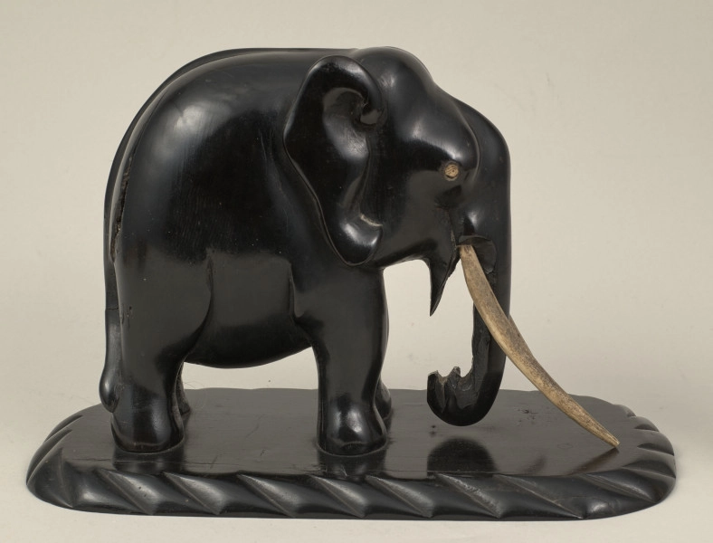 Figurka słonia wykonanego z drewna hebanowego i kości zwierzęcej, datowana na XIX wiek. Ze względu na pochodzenie użytych materiałów oraz tematyki można przypuszczać, że rzeźba pochodzi z Dalekiego Wschodu (Chiny?). Symbol słonia może być odczytywany wielorako - w języku chińskim słowo „xiang” oznacza „słoń” i „szczęście”. To egzotyczne zwierzę było cennym trofeum ze względu na swoją rzadkość i cenę, nie tylko dla ówczesnych myśliwych ale również dla kolekcjonerów pamiątek – stąd popularność figurek słoni w kolekcjach europejskich. Ze słoniami zetknął się nawet Marco Polo, który w swej relacji wspomniał władcę Mongołów podróżującego w drewnianej komnacie zainstalowanej na czterech słoniach.