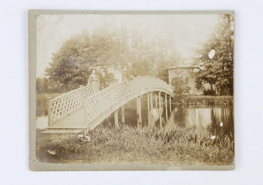 Grupa osób na mostku w parku nałęczowskim