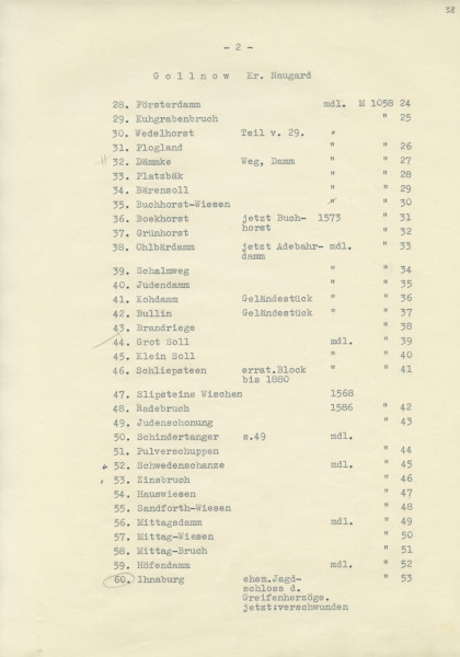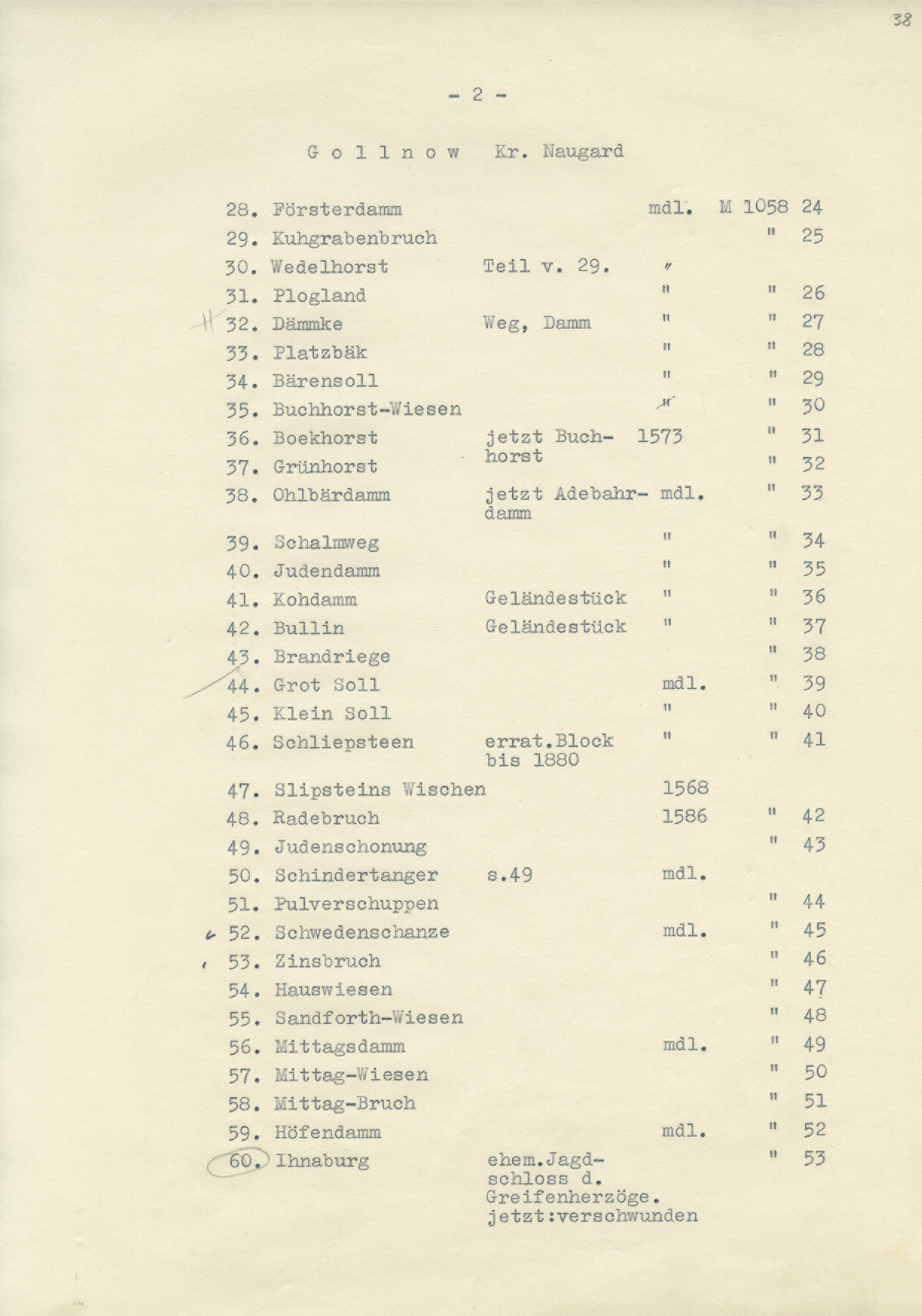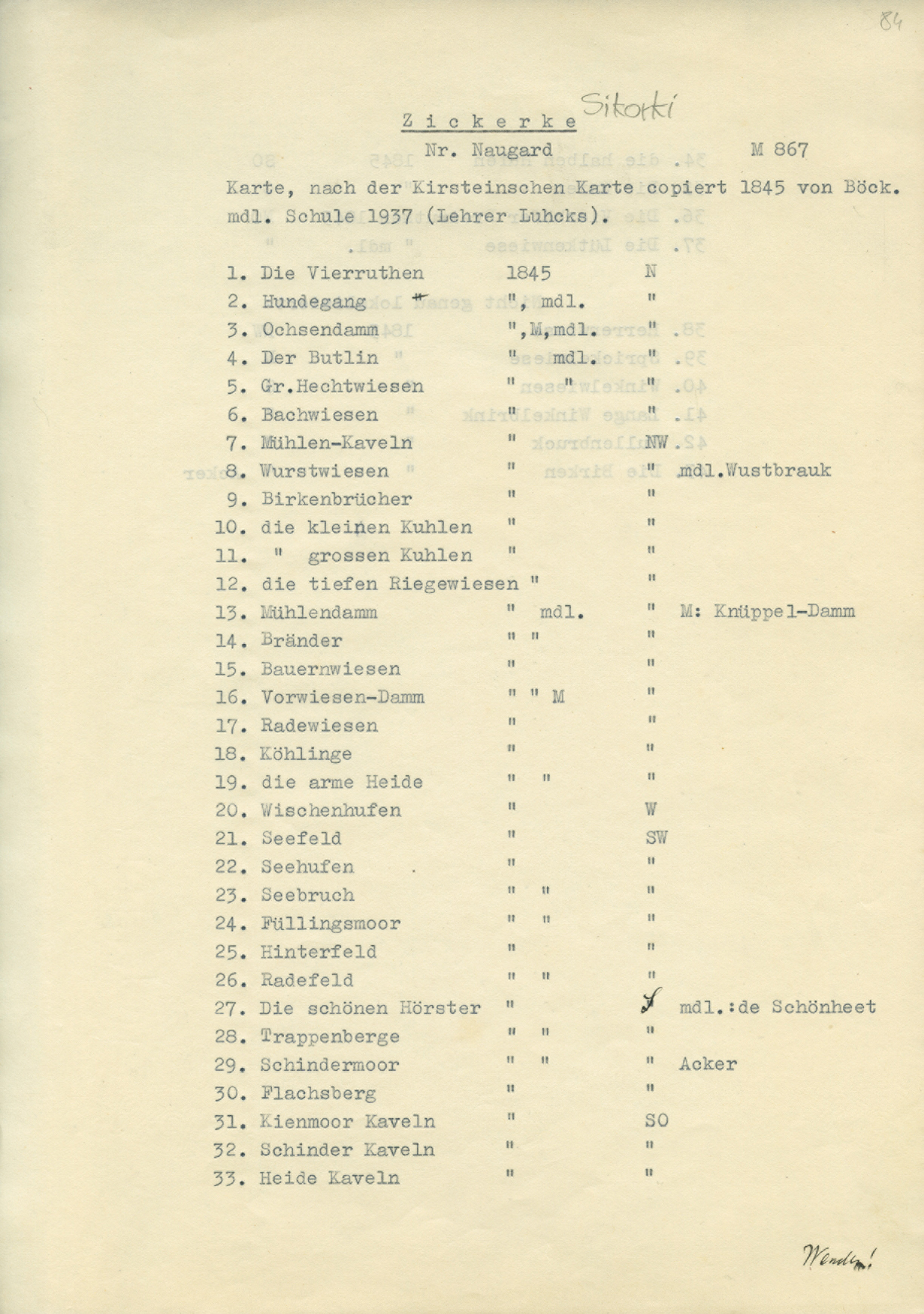Spis został wykonany w ramach zainicjowanego przez pomorskiego językoznawcę dr. Roberta Holstena (1862–1954) projektu, polegającego na zebraniu przez nauczycieli i regionalistów z przedwojennej prowincji Pomorze (od Rugii do Lęborka) współczesnych ludowych i archiwalnych nazw obiektów fizjograficznych naturalnych i antropogenicznych oraz miejsc zamieszkanych i niezamieszkanych. Zgromadzony zespół archiwaliów (spisy i mapy, na których naniesiono lokalizację obiektów – Flurnamen Sammlung) obejmuje niematerialne dziedzictwo kulturowe regionu w zakresie onomastyki.