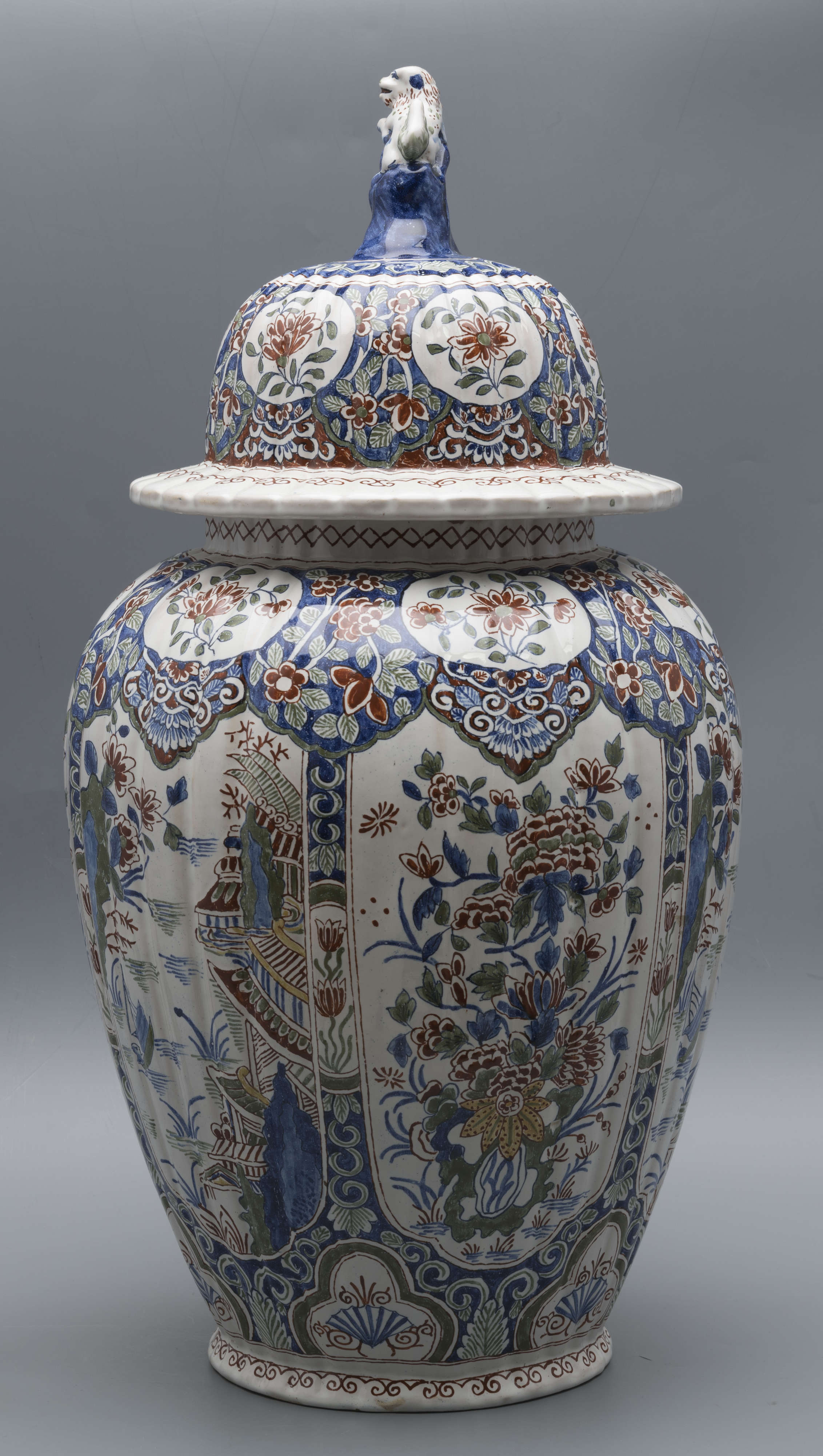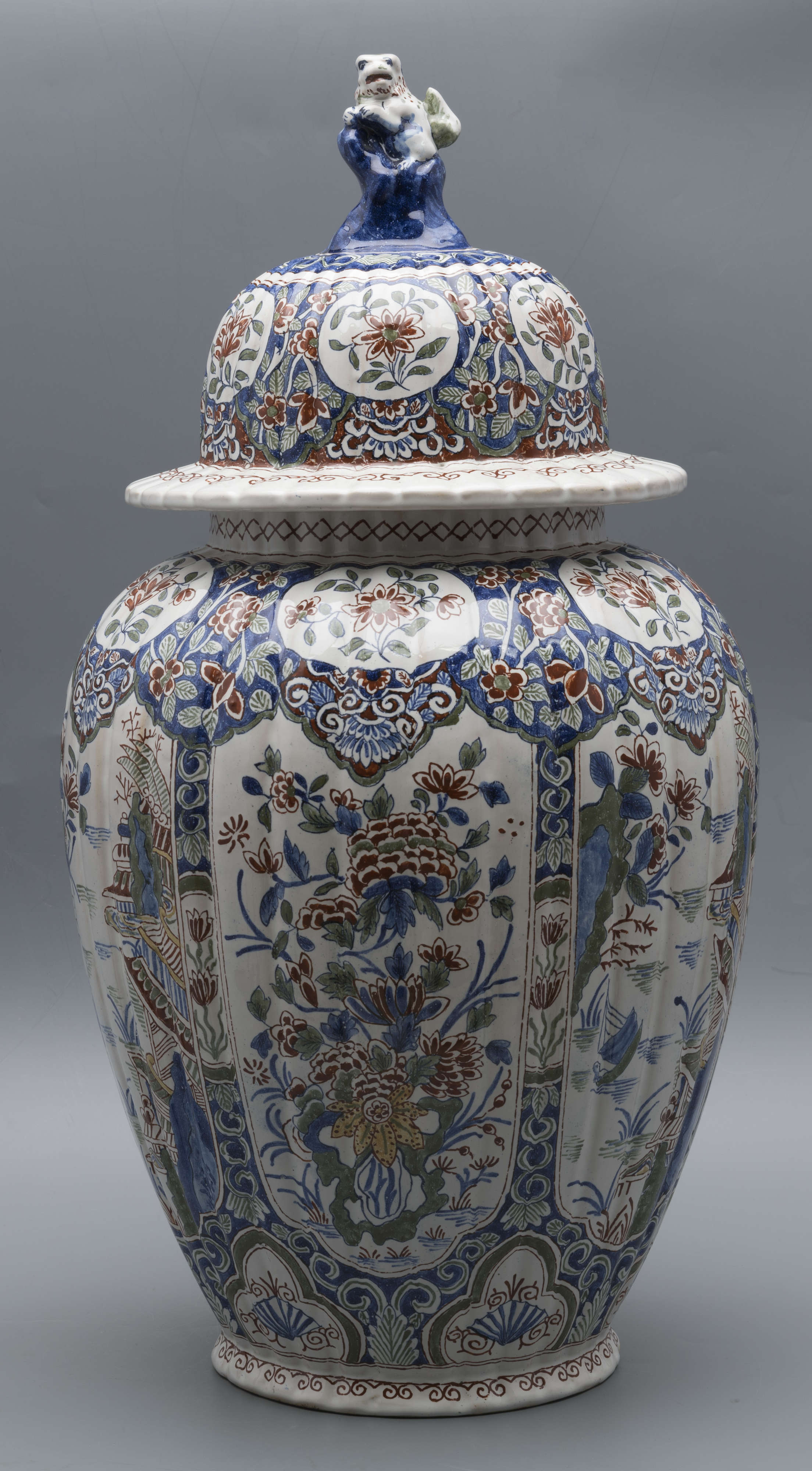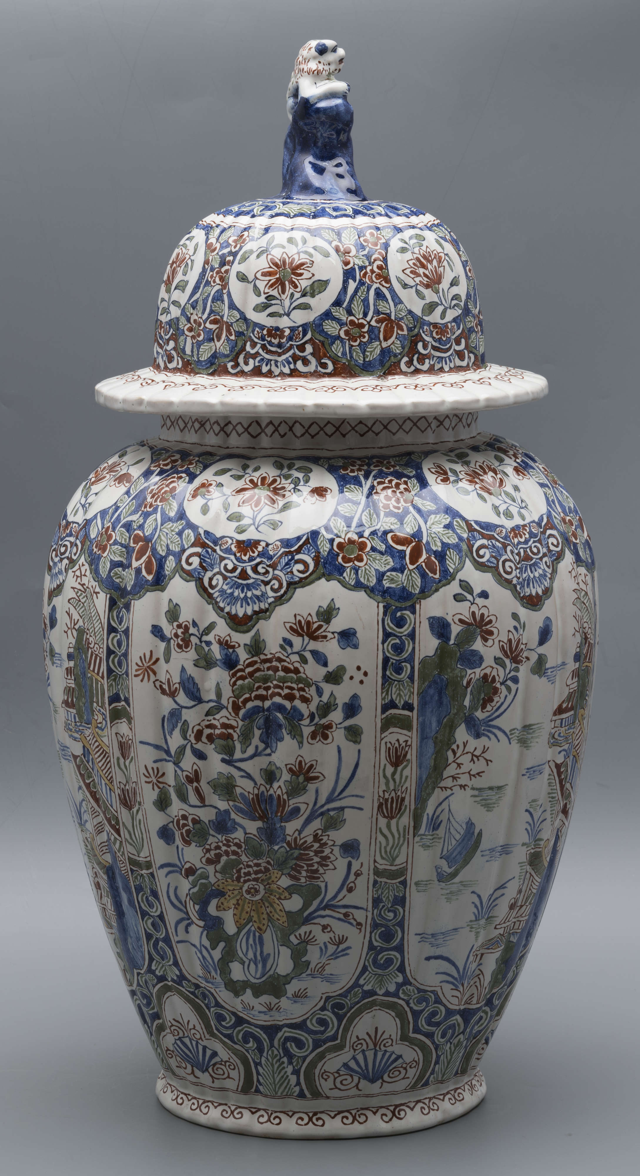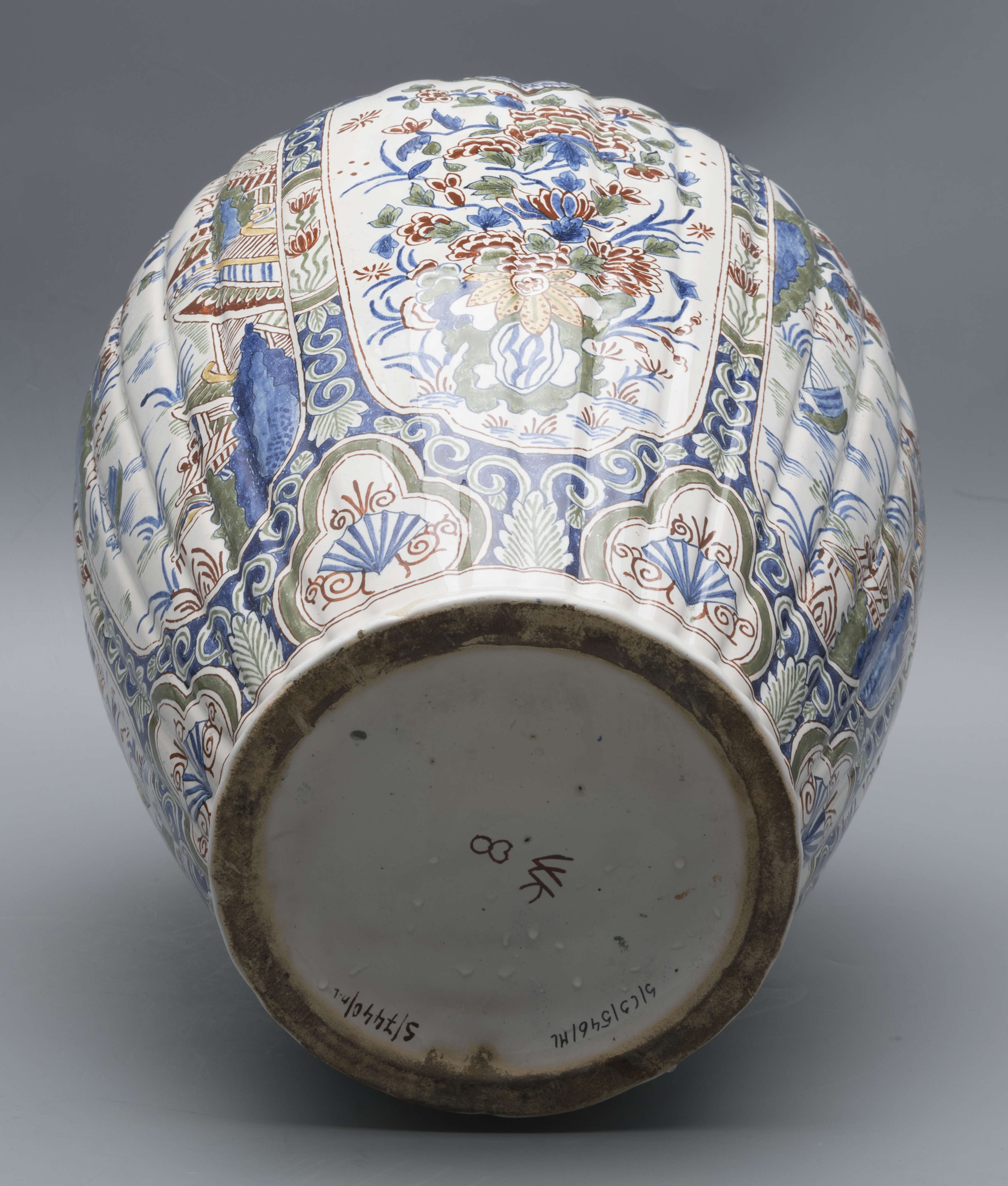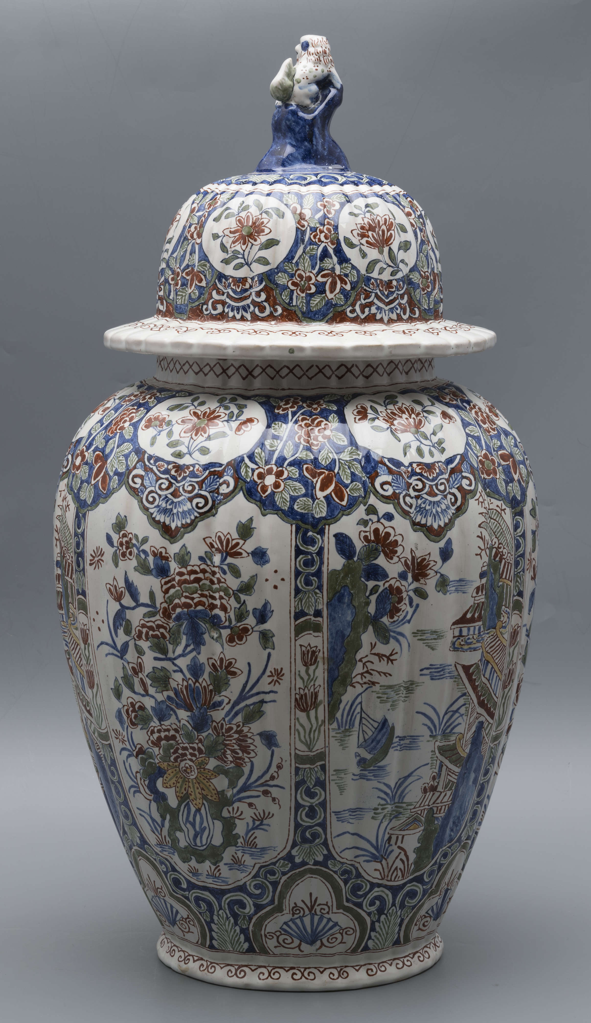 W XVII wieku wzrósł poziom zamożności społeczeństwa holenderskiego i w związku z tym powstała potrzeba otaczania się cennymi i pięknymi przedmiotami. Warsztaty ceramiczne produkowały tak zwane garnitury składające się z nieparzystej liczby naczyń – trzech, pięciu, siedmiu – o różnych kształtach, lecz identycznej dekoracji. Ustawiano je symetrycznie na gzymsach drzwi, szaf, kominków, aby bogactwem kształtów i malowanych wzorów ożywiały wnętrze. Prezentowany wazon należał pierwotnie do takiego kompletu. Powstał w najsłynniejszym holenderskim ośrodku produkcji ceramiki w okresie, gdy całą Europę opanowała moda na chińską porcelanę. W XVI wieku emigranci z Italii przynieśli do Niderlandów sztukę wyrobu majoliki – szlachetnej ceramiki pokrytej białym szkliwem i barwnie malowanej. W 1615 roku odbyła się w Delft wielka aukcja, na której tutejsi rzemieślnicy mogli kupić, a przynajmniej obejrzeć, różnorodne przykłady chińskiej porcelany. Te źródła inspiracji wpłynęły na wspaniały rozwój własnej produkcji o indywidualnym charakterze, bogactwie form i dekoracji oraz wysokim poziomie technicznym. Co ciekawe – wizualne podobieństwo do chińskich importów sprawiło, że biało szkliwione, malowane fajanse nazywane były w Holandii porcelaną.