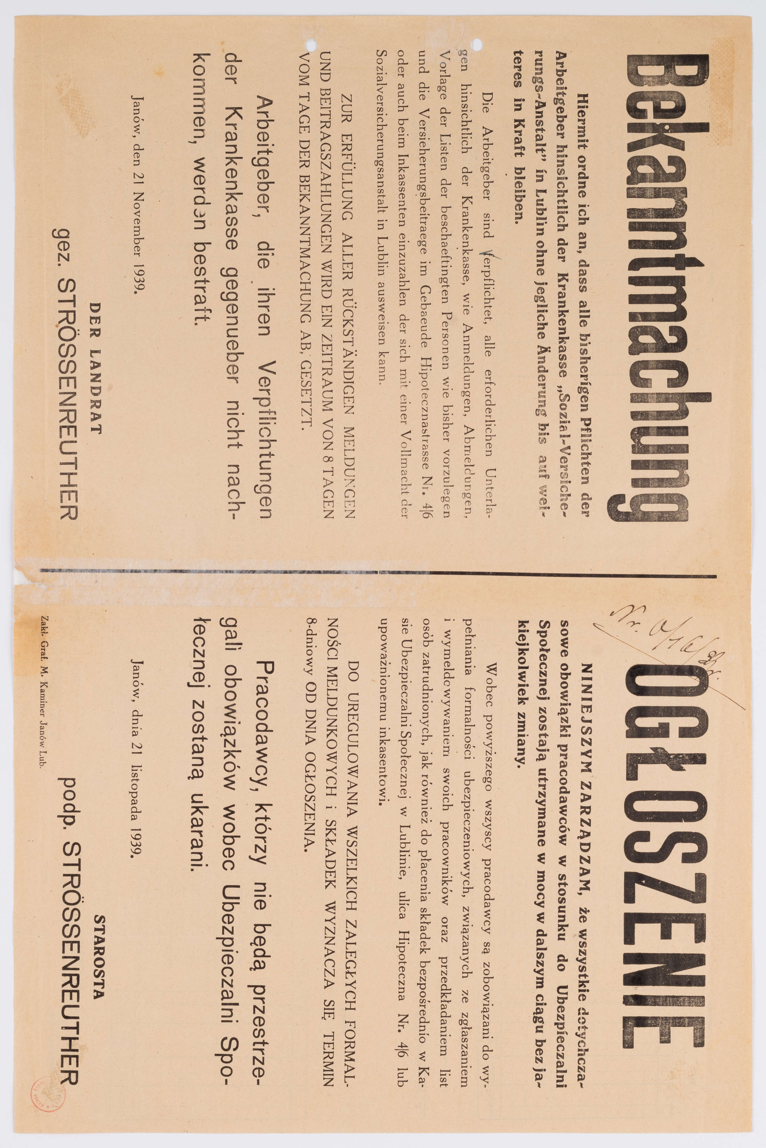 Ogłoszenie o obowiązku ubezpieczania pracowników przez pracodawców w Ubezpieczalni Społecznej.