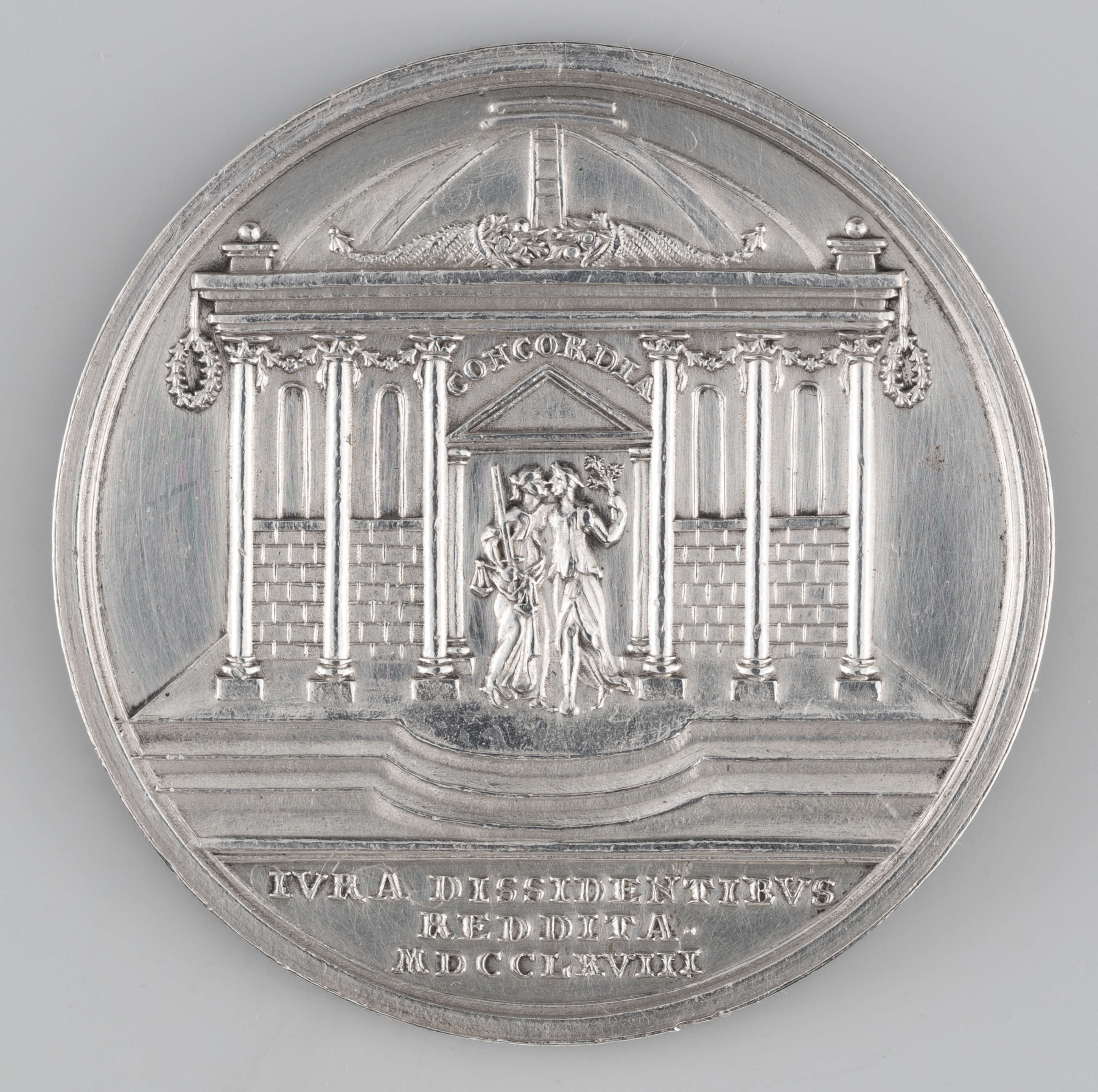 Przywrócenie praw dysydentom w Polsce było w Europie wydarzeniem doniosłym. Upamiętnia je medal powstały w Norymberdze, w pracowni uznanego medaliera Johanna Leonarda Oexleina (1715–1787). Nie wiadomo, z czyjej inicjatywy powstała ta praca. Jej awers przedstawia popiersie króla Stanisława Augusta Poniatowskiego w zbroi z narzuconym na nią płaszczem gronostajowym i dookolnym napisem, w tłumaczeniu: „Stanisław August, z Bożej łaski król Polski, wielki książę litewski”. Przedstawienie władcy być może jest wzorowane na anonimowym portrecie z około 1765 roku lub powstałym po tej dacie w Paryżu miedziorycie Antoine’a de Marcenaya de Ghuya. Na stronie odwrotnej widnieje budowla stylizowana na antyczną Świątynię Zgody – opisana na portalu słowem: „CONCORDIA”. Przed jej wejściem stoją dwie całujące się postacie, symbolizujące Sprawiedliwość i Pokój. Umieszczony poniżej łaciński napis wskazuje na motyw powstania medalu, w tłumaczeniu: „Prawa dysydentom przywrócone, 1768”.