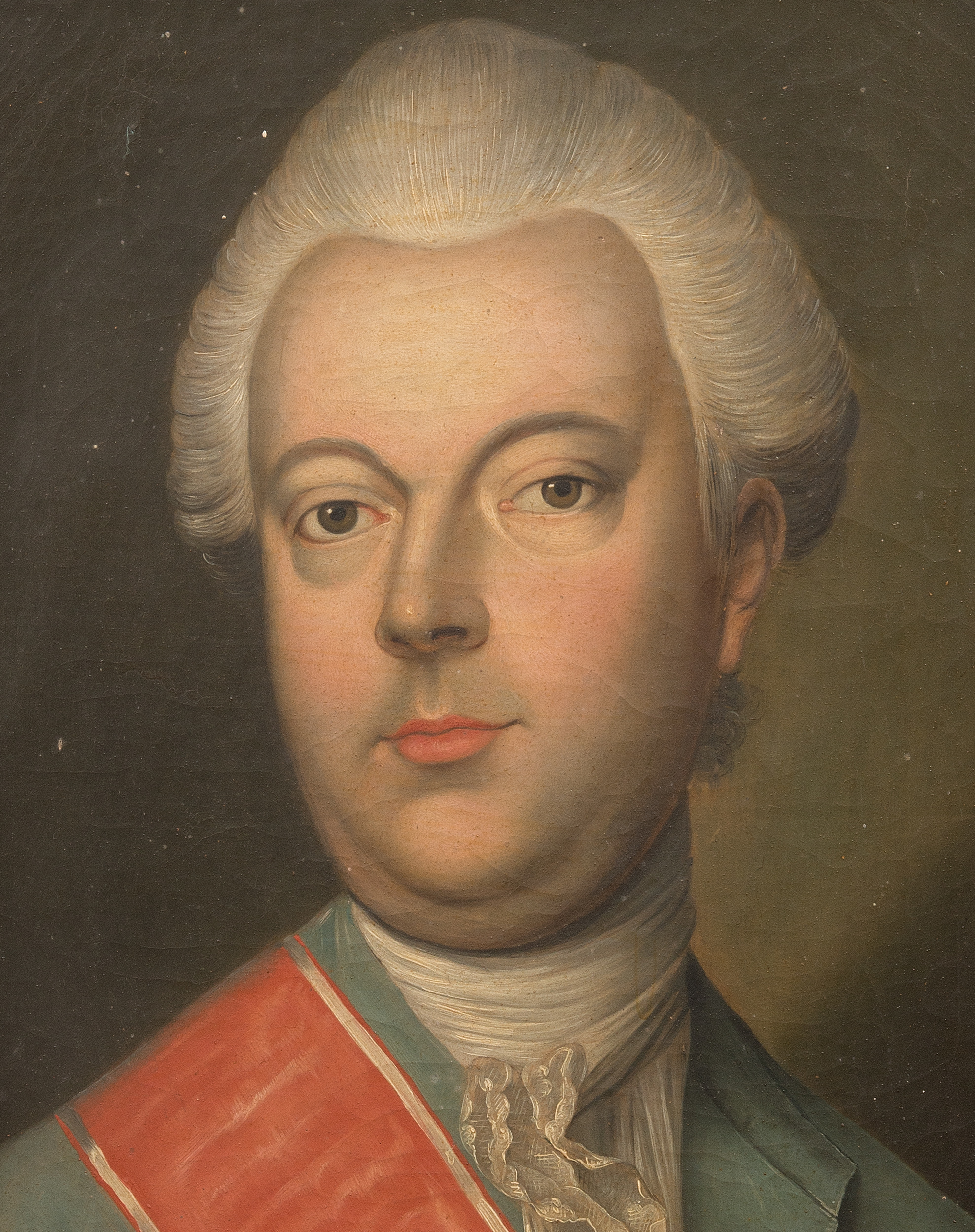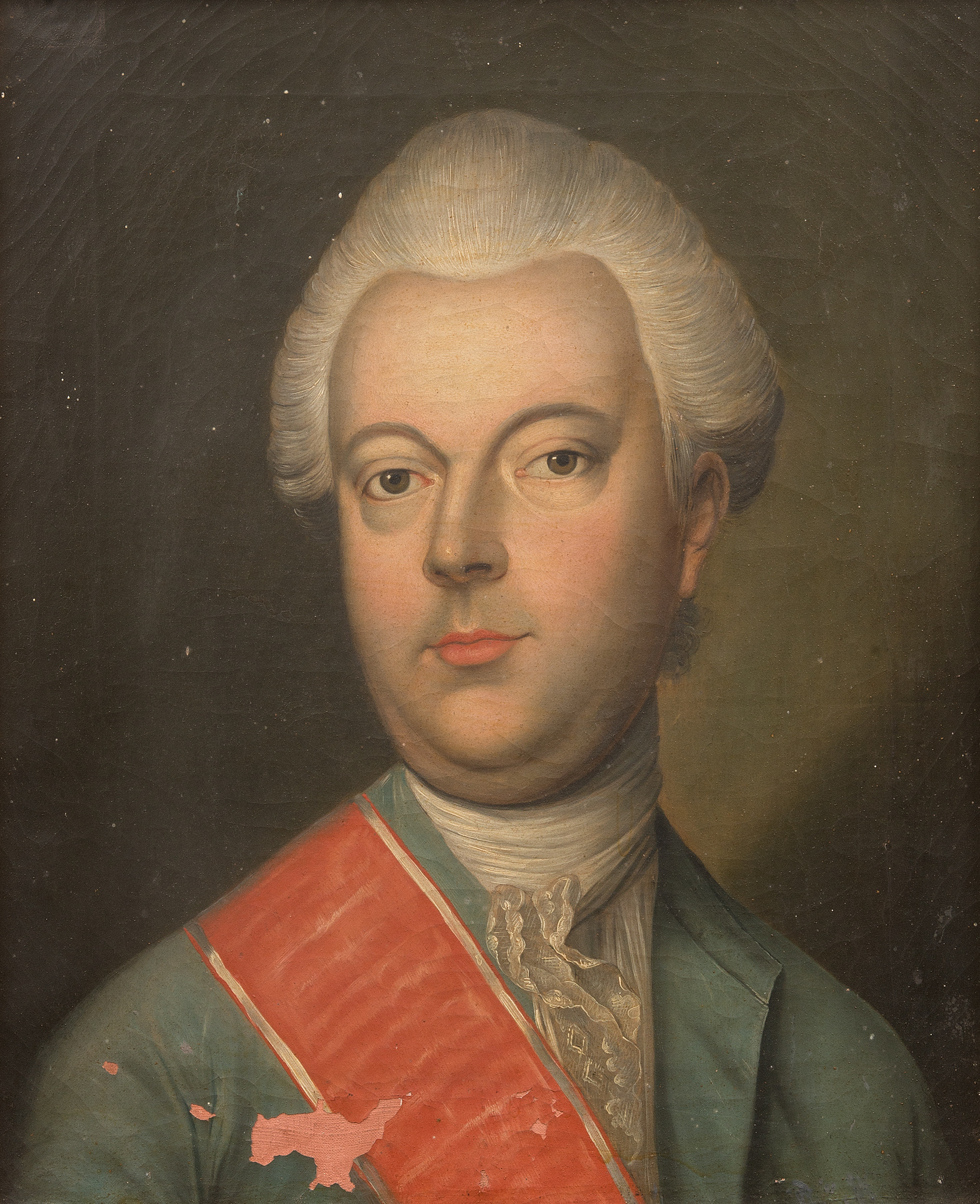 Na obrazie ze zbiorów wilanowskich został ukazany jako mężczyzna w średnim wieku, zgodnie z nakazami ówczesnej mody w pudrowanej peruce na głowie (skierowanej nieco w lewo), ubrany w jasny frak, w kolorze zielononiebieskim, przepasany wielką czerwoną wstęgą Orderu Świętego Stanisława. Wkoło szyi portretowany ma zawiązany biały fular z niewielkim, dość skromnym koronkowym żabotem. Tło gładkie, w odcieniach szarości i zgaszonej zieleni.