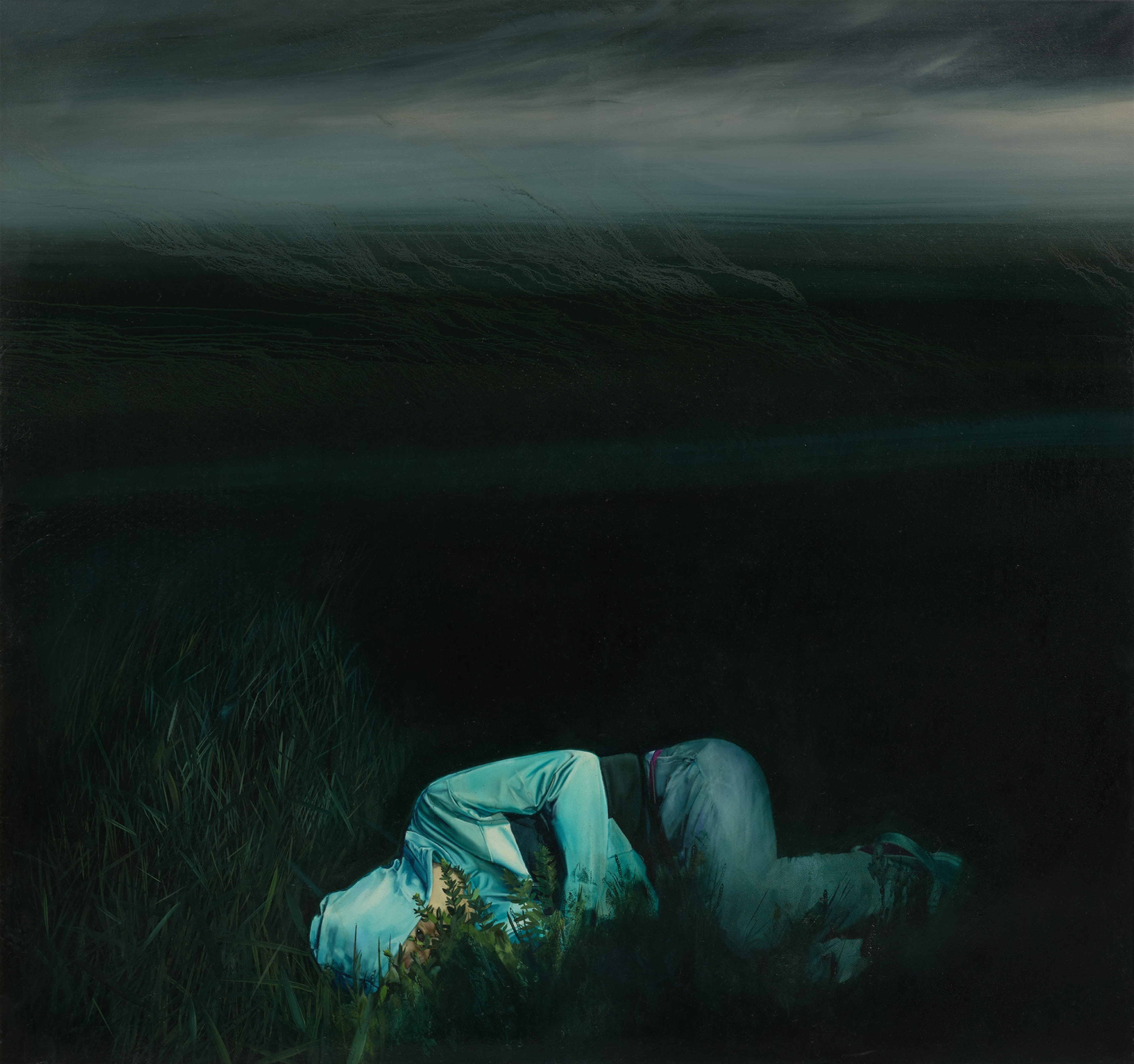 Podstawowym medium sztuki, w którym wypowiada się Katarzyna Szeszycka (ur. 1983) jest malarstwo. Artystka z powodzeniem łączy umiejętności warsztatowe i perfekcyjne opanowanie klasycznych technik malarskich z niekonwencjonalnymi działaniami artystycznymi realizowanymi na pograniczu z innymi gatunkami sztuki takimi, jak fotografia, film wideo, czy akcje artystyczne w przestrzeniach publicznych. Obraz Szeszyckiej stanowiący środkową część tryptyku, podobnie jak dwie pozostałe jego części, został namalowany w 2012 roku. Do zbiorów Muzeum Narodowego w Szczecinie trafił po zorganizowanej tu, w tym samym roku, wystawie pt. „Pełnia–Realizacja” zrealizowanej dzięki współpracy artystki z fotografem Konradem Królikowskim i w całości poświęconej Rokicie – niewielkiej zachodniopomorskiej miejscowości, z której pochodzi Szeszycka. Bohaterką poetyckiej opowieści o peryferyjnej osadzie, w której wychowała się artystka, była ona sama i inni mieszkańcy Rokity. Fotografie wykonane podczas licznych sesji zdjęciowych z udziałem mieszkańców tej miejscowości posłużyły Szeszyckiej jako materiał wyjściowy dla serii wielkoformatowych obrazów wykonanych farbami olejnymi na płótnie. Obraz z kolekcji Muzeum Narodowego w Szczecinie jest w istocie autoportretem. Pierwowzorem zakapturzonej, leżącej na leśnej polanie postaci jest sama artystka – autorka, narratorka i uczestniczka projektu.
