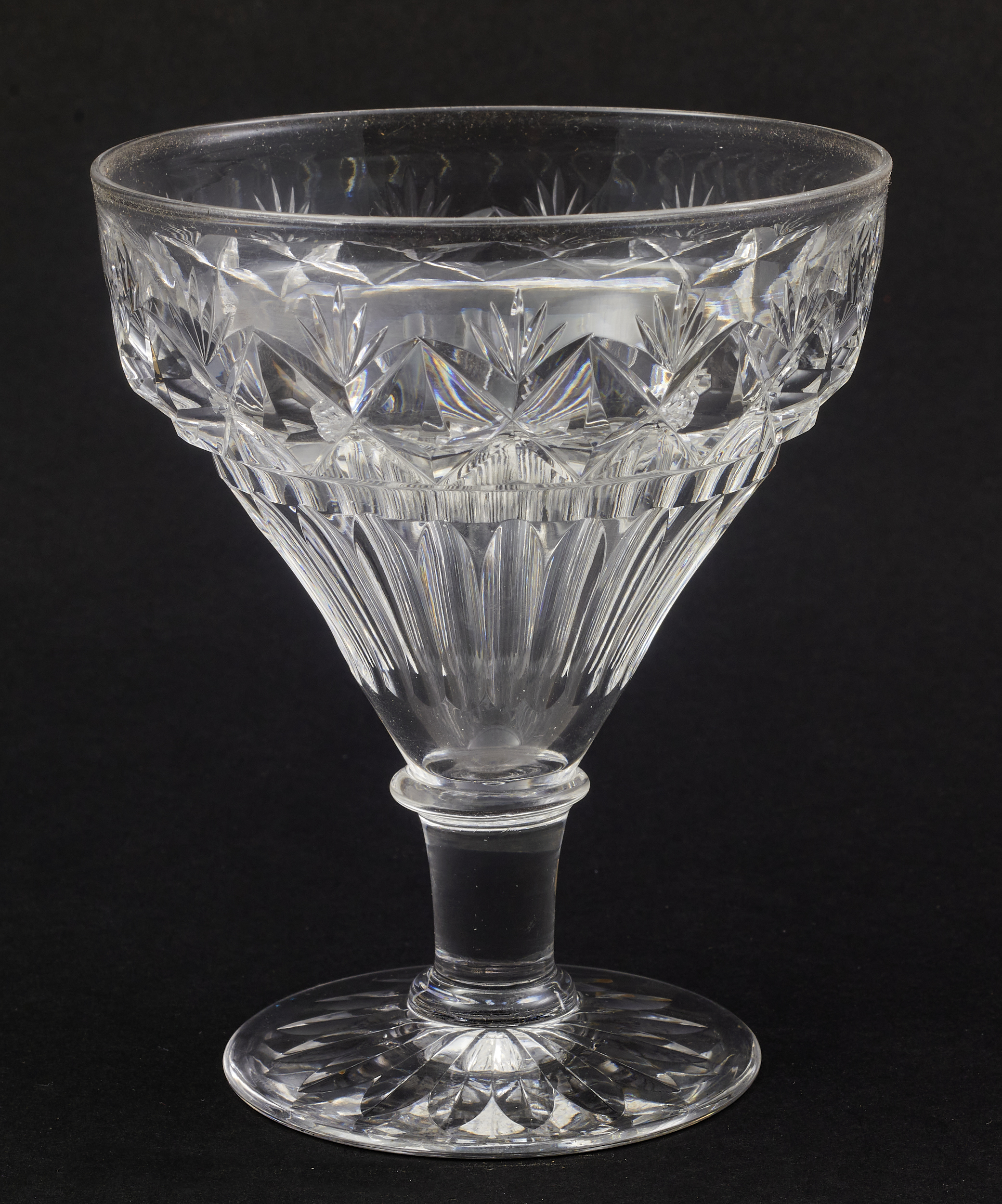 Kieliszek duży, wykonano ze szkła kryształowego. W zbiorach łańcuckich znajduje się także jeszcze pięć takich kieliszków. Zostały wykonane na przełomie XIX-XX wieku w Anglii, w stylu secesyjnym.