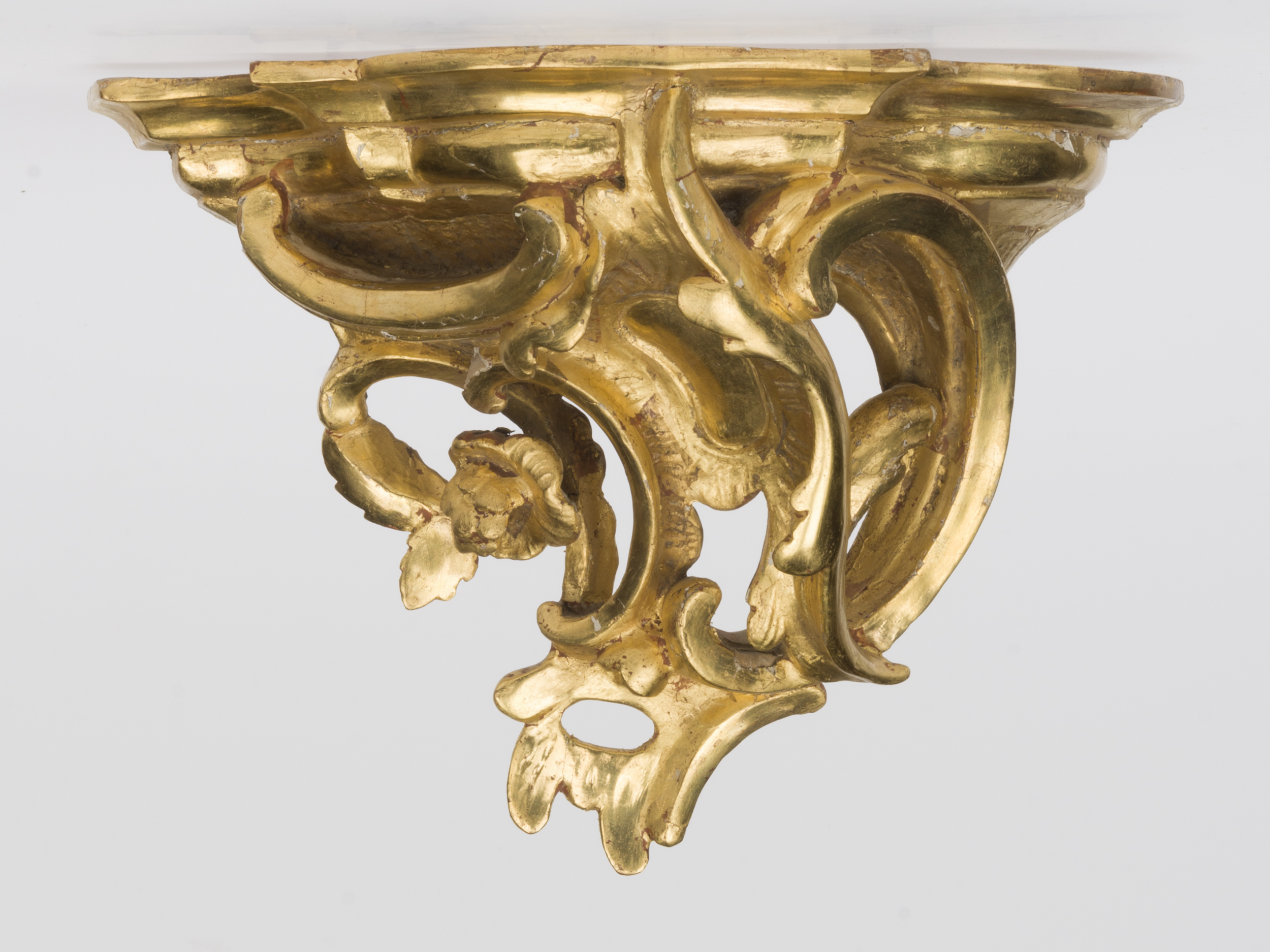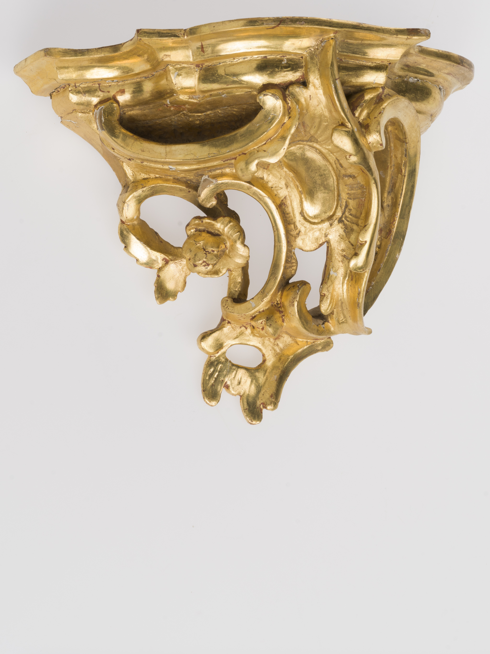 Niewielka konsolka ścienna, w formie rozbudowanej kompozycji z motywem rocaille. Część wspornikowa u góry szersza, zwęża się ku dołowi dając zarys odwróconej piramidy. Składa się z suchych, cienkich, mocno ażurowych form, w większości o kształcie ceownicy. Górna partia ozdobiona została pośrodku niedużym nerkowatym w kształcie kartuszem, a nieco poniżej z lewej strony – sześciopłatkowym kwiatkiem. Całość podtrzymuje blacik o nieregularnym zarysie i podwójnie fazowanej krawędzi u góry wklęsłej, poniżej wypukłej.