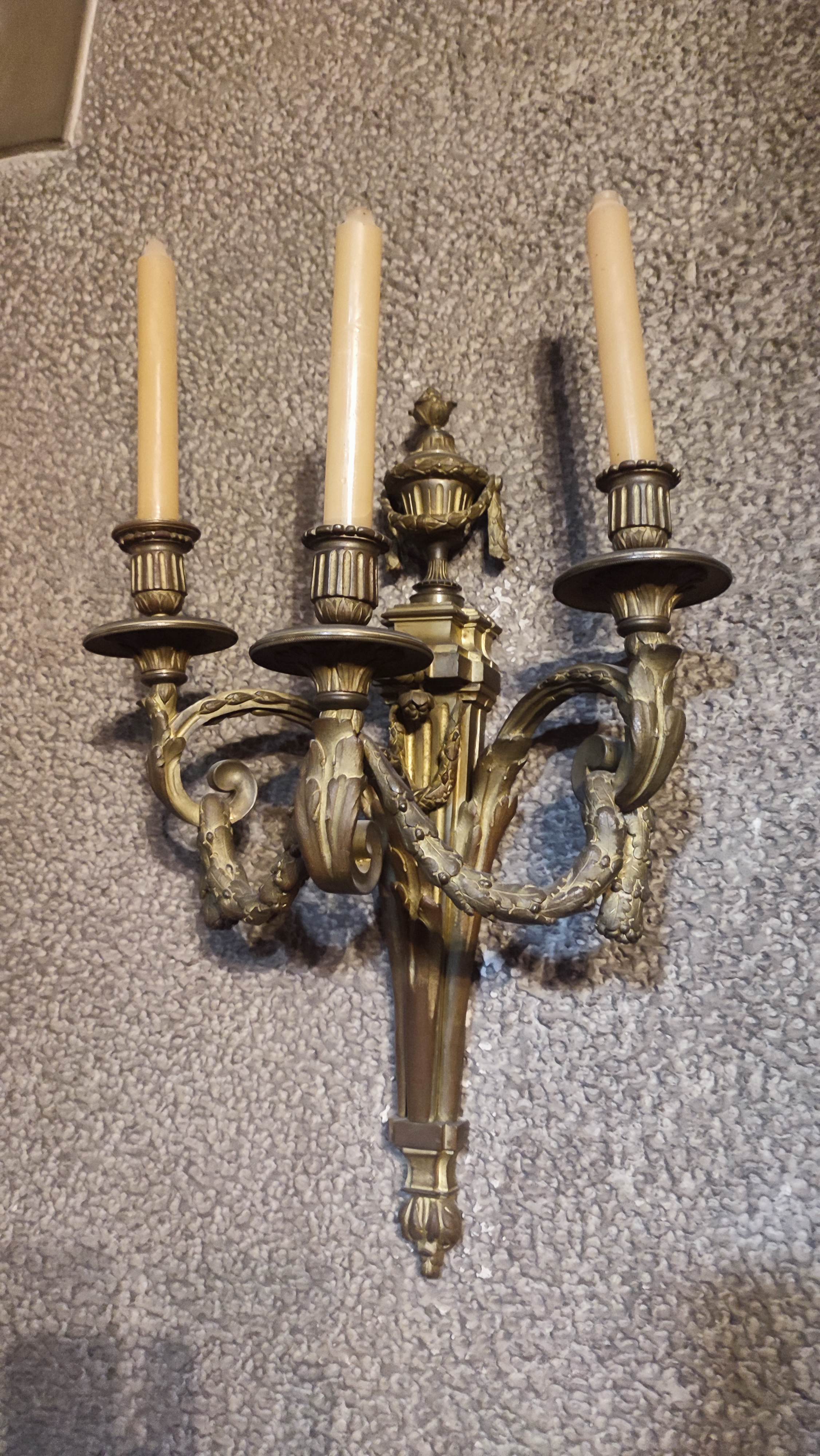 Kinkiet w stylu klasycystycznym wykonany z brązu - trzy świecowy. Dodatkowo kinkiet ten złocony był na gorąco. Kinkiety w latach dawnych wykorzystywane były do punktowego doświetlenia rezydencji jak również przestronnych wnętrz mieszkalnych. Do grzbietów ramion tego kinkietu przytwierdzone są duże metalowe profitki z kieliszkami w których osadzano świece woskowe. Ramiona tj. spody profitek ozdobione są stylizowanymi liśćmi akantu. Czas powstania tego kinkietu to XIX w. Przejęty po Potockich z Łańcuta w 1944 r. w chwili upaństwowienia się muzeum.