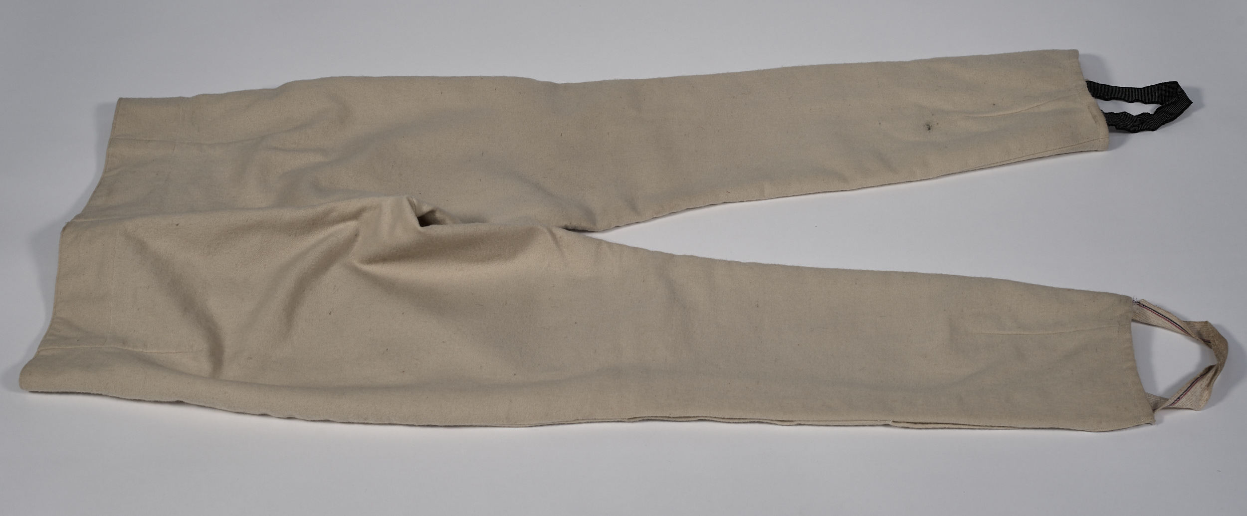 Spodnie stangreckie z białego sukna przeznaczone do długich stangreckich butów i galowej liberii. Spodnie z klapą zapinaną z przodu, na brzegach z każdej strony na 3 guziki. Nogawki od połowy na zewnętrznych szwach pęknięte, zapinane powyżej kolan na trzy guziku, na dole nogawki podszyte gumami do zakładania pod stopy. XIX/XX wiek.