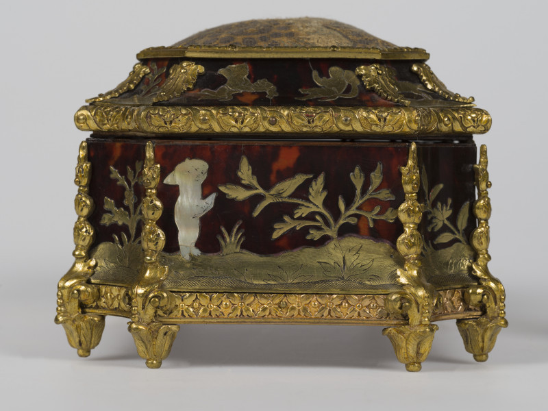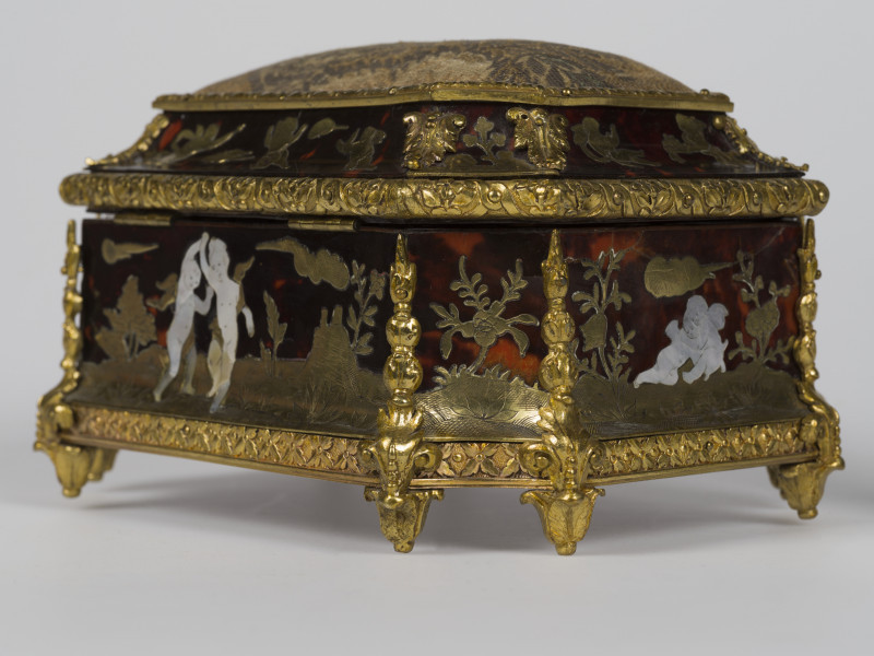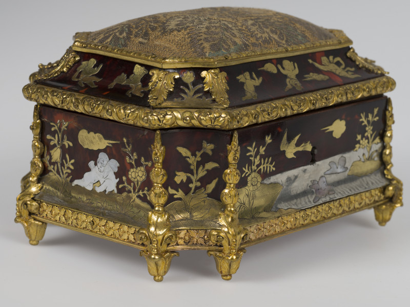 Jest to druga z dwu mniejszych szkatułek, należących do kompletu „gotowalni królowej Janowej” zakupionej przez Stanisława Kostkę Potockiego w 27 lutego 1808 r. w paryskim magazynie De Tournier dla małżonki Aleksandry z książąt Lubomirskich w celu wzbogacenia ekspozycji apartamentów królewskich pałacu wilanowskiego. Jako pierwowzór posłużyły ebeniście obrazy Francesco Albaniego z cyklu zakupionego przez Ludwika XIV w 1685 r. do królewskiej kolekcji. Wieko szkatułki pełni funkcję poduszki do szpilek pokrytej kawałkiem tkaniny brokatowej o dużym raporcie, natomiast na ściankach umieszczono epizody z życia amorków pochodzące z obrazu „Adonis przywiedziony przez amorki do Wenus czyli Woda”
