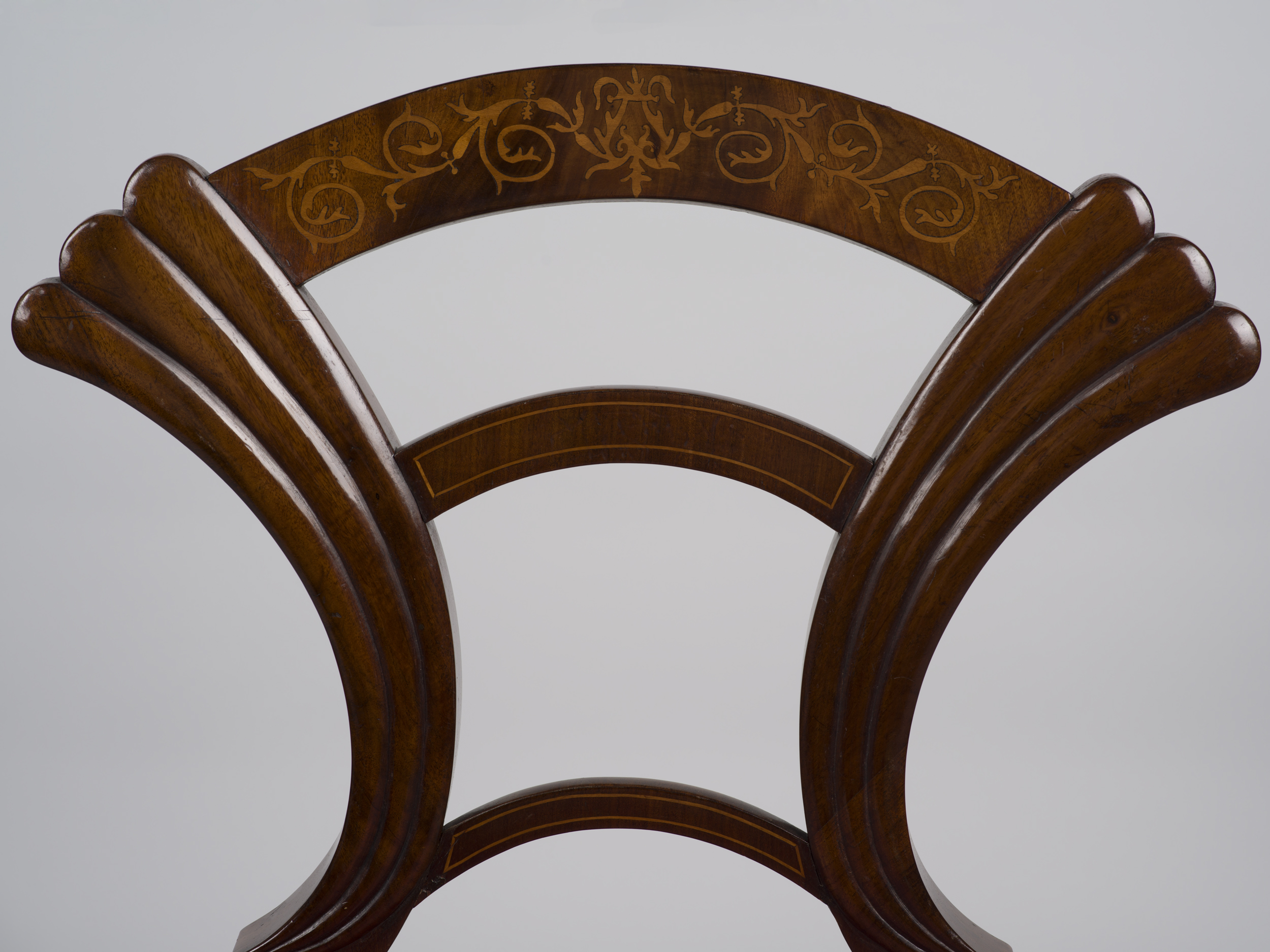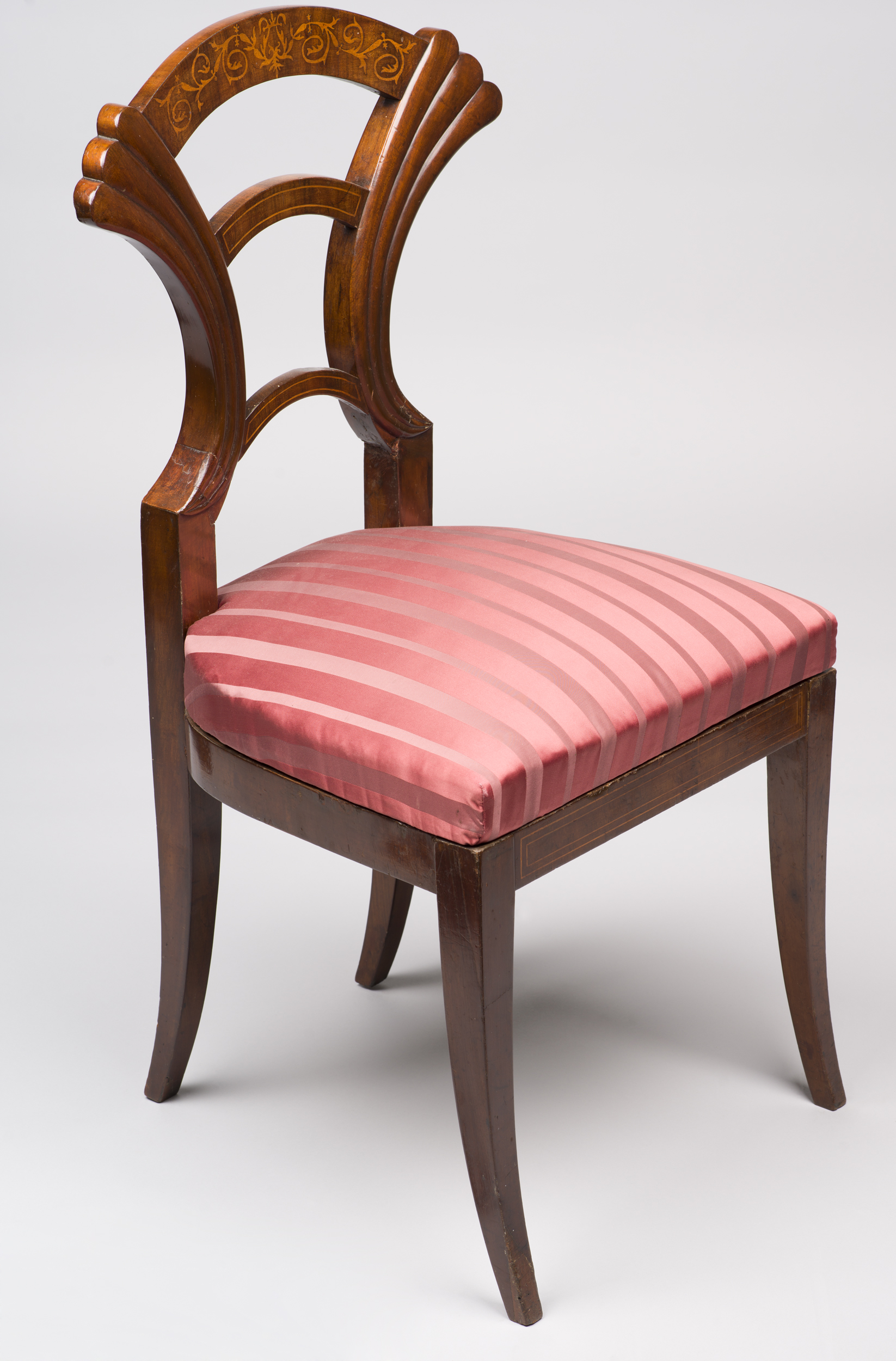 Krzesło na kwadratowych w przekroju, zbieżnych i szablasto wygiętych ku przodowi i tyłowi nogach, z wachlarzowo ukształtowanym oparciem i podkowiastym, tapicerowanym siedziskiem. Carga prosta, od przodu ozdobiona prostokątną, intarsjowaną ramką. Tylne nóżki o węższym rozstawie niż przednie, wyprowadzone nieco ponad powierzchnię siedziska. Do nich przytwierdzono oparcie złożone z dwóch rozchylonych i rozszerzających się ku górze skrzydeł ozdobionych trzema płaskimi półwałkami. Oba te elementy zostały połączone trzema półkolistymi listwami o zmiennej szerokości, wzrastającej ku górze. Górna listwa ozdobiona jest intarsjowanymi gałązkami tworzącymi symetryczne arabeski złączone pośrodku stylizowanym motywem liry. Dolne listwy ozdobiono motywem prostych ramek. Tapicerowane siedzisko krzesła obito malinowym jedwabiem w paski z wytwórni w Milanówku. Mebel stanowi przykład dojrzałego biedermeieru, dalekiego od prostych, ciężkich, klasycyzujących form jego wczesnej fazy. Ażurowa konstrukcja oparcia o bardzo typowym dla biedermeieru wachlarzowym zarysie została pokryta dekoracją dodającą optycznej lekkości, zarówno w partiach rzeźbionych jak i pokrytych delikatną jasną intarsją. Krzesło stanowi element kompletu mebli salonowych, na który składa się poza nim jeszcze dziewięć krzeseł, kanapa i stół. Zakup Muzeum Narodowego w Warszawie od osoby prywatnej w 1963 r., przekazany następnie do zbiorów wilanowskich.