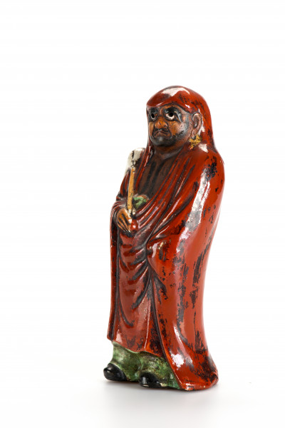 Daruma - pierwszy patriarcha zen Bodaidaruma (sanskryt: Bodhidharma) uważany jest za twórcę buddyzmu chan (zen). Był indyjskim mnichem buddyjskim, żyjącym na przełomie V i VI w. Po latach wędrówek osiadł w klasztorze Shaolin. Z jego postacią związanych jest wiele legend. Aby oprzeć się senności w trakcie medytacji obciął sobie powieki. Tam gdzie upadły na ziemię wyrosły pierwsze krzewy herbaty. Inna legenda mówi, że na skutek długiej medytacji w jednej pozycji jego nogi miały uschnąć i odpaść. Bodhidharma często pojawiał się w malarstwie tuszowym czy drzeworycie. Jego przedstawienia charakteryzuje srogi wyraz twarzy, podkreślany przez szeroko rozwarte oczy pozbawione powiek, pod opadającymi bujnymi brwiami oraz zarost. W miejscu źrenic naszej figurki zostały wywiercone dziurki, by pogłębić przenikliwość spojrzenia Bodhidharmy. Jego płaszcz z kapturem jest czerwony, rozchylony, ukazuje owłosioną pierś. W prawej dłoni trzyma białą yukę, opartą o prawe ramie.