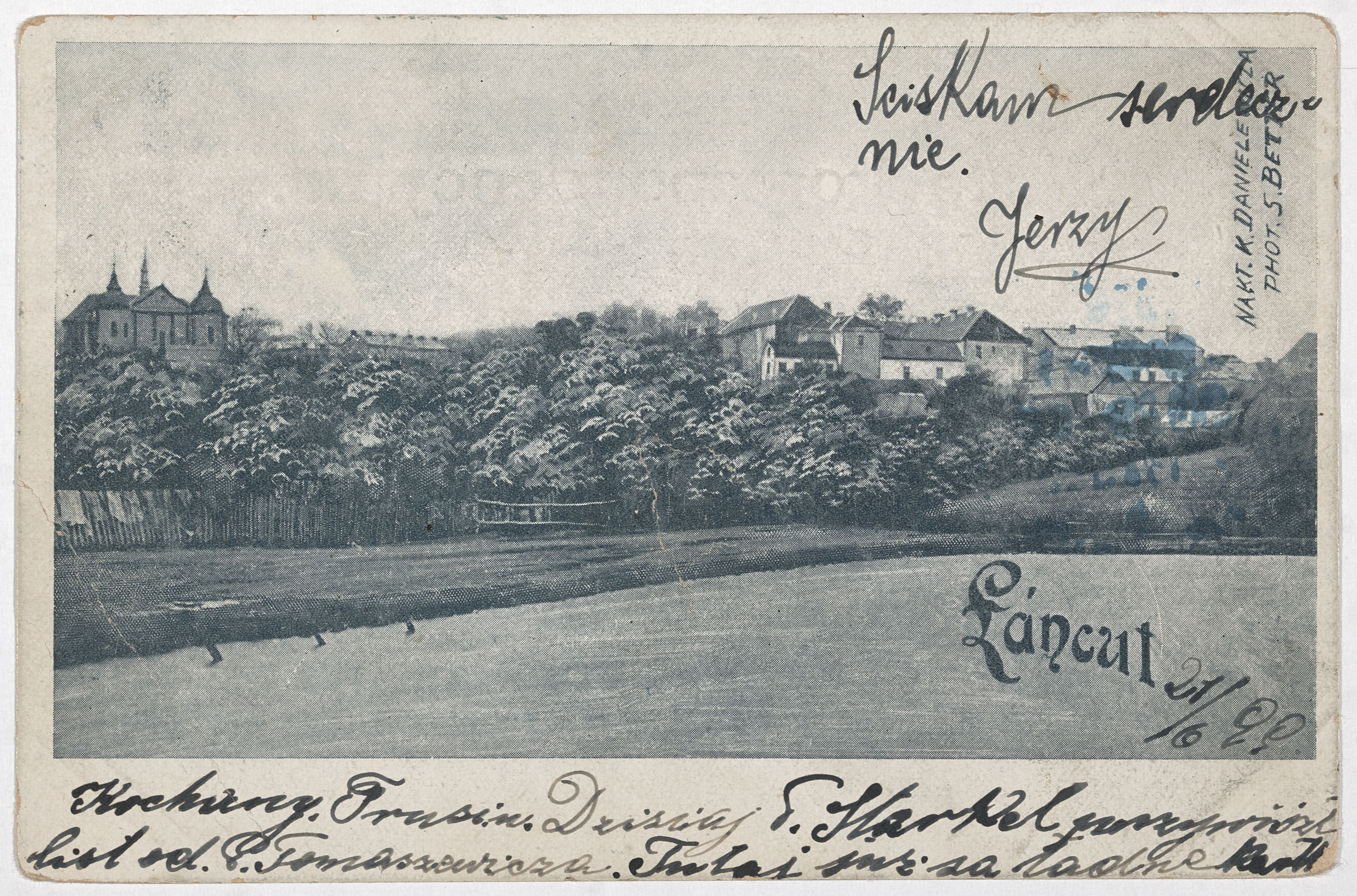 Pocztówka z tzw. długim adresem, zaadresowana na hrabiego Alfreda Potockiego w Wiedniu; wydana ok. 1895 r., nakładem łańcuckiego wydawcy Konstantego Danielewicza. Przedstawia fragment panoramy Łańcuta z widokiem na dwuwieżowy kościół farny i klasztor podominikański, u podnóża których rozciąga się miejska strefa ogrodowa tzw. podwale. Zdjęcie autorstwa S. Bettera wykonane zostało od zachodniej strony miasta tj. od obszaru tzw. Nawsia, stanowiącego centrum podmiejskiej wsi nazywanej Przedmieściem. Na pierwszym planie staw browarny, zawdzięczający swą nazwę położonemu nieopodal najstarszemu zakładowi przemysłowemu Łańcuta. Wśród miejskiej zabudowy, obok wspomnianego kościoła pw. św. Stanisława Biskupa i Męczennika, a także dawnego klasztoru, będącego wówczas siedzibą szpitala wojskowego, widoczna część murowanej zabudowy rynkowej oraz fragment drewnianych zabudowań osadzonych w miejskich ogrodach obwiedzionych drewnianymi płotami.