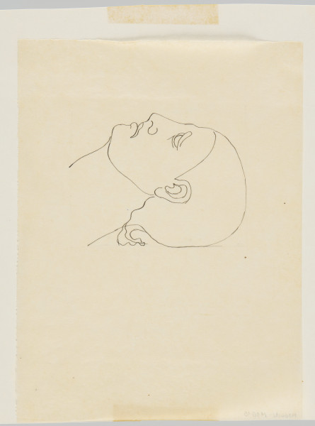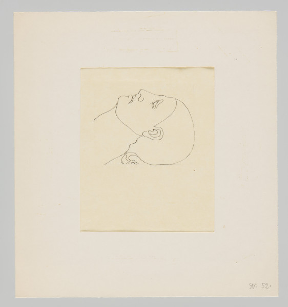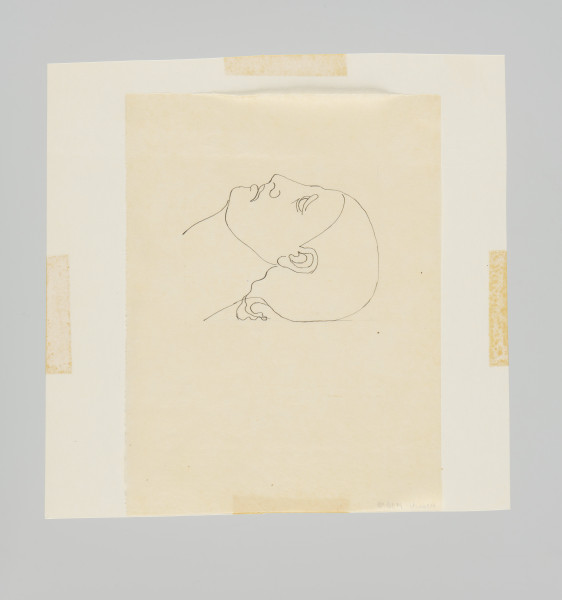Rysunek leżącej głowy kobiecej ujętej z profilu, z otwartymi oczami i opadłym kącikiem ust. Pozioma linia płaszczyzny, na której leży głowa, zarysowana delikatnie ołówkiem, a w jednym miejscu, po prawej, także tuszem. Jest to głowa zmarłej więźniarki Auschwitz narysowana jako ilustracja opowiadania „Szczury” Marii Zarębińskiej-Broniewskiej. Rysunek w tomie „Ręka umarłej” otwiera to opowiadanie. Bohaterka-narratorka widzi w nim w jednym z baraków dla chorych ciało kobiece, które – co nie zostało uwidocznione na ilustracji – nosi ślady po nadjedzeniu przez szczury. Fragment tekstu: „Dwie więźniarki z obsługi szpitalnej ściągały koszulę z trupa. Trup był potwornie chudy. Strasznie rozwarte, szklane oczy patrzyły prosto w niebo. Dół twarzy był jedną potworną, wielką raną. Brzuch też. To był pierwszy trup, jakiego widziałam w Oświęcimiu” (s. 53). W momencie przekazania obiektu do zbiorów Muzeum POLIN znajdował się on na podklejce i w passe-partout; na passe-partout ołówkiem w lewym dolnym rogu (w orientacji ku bocznej krawędzi) Olga Siemaszko wskazała miejsce druku ilustracji: „Str. 52” (ilustracja faktycznie znalazła się właśnie na tej stronie, w jej górnej części).
