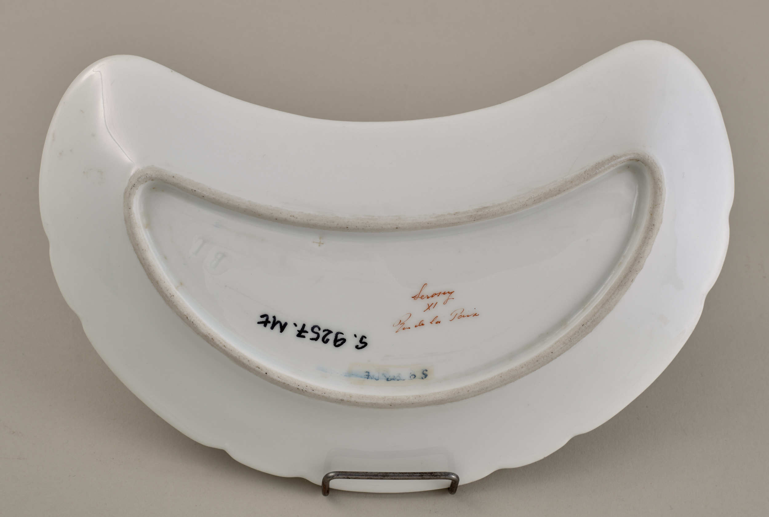 Talerzyk przystawkowy z hrabiowską koroną Talerzyk z dosyć grubej mlecznobiałej porcelany, kształtem zbliżony do półksiężyca bądź nerki, nieckowato zagłębiony z wąskim parapetowym brzegiem, który z jednej strony tj. na większym, niemal półkolistym łuku półksiężyca, wyróżnia się dziewięcioma zaokrąglonymi wyzębieniami, na przemian dłuższymi i krótszymi. Talerzyk zdobi złocista korona hrabiowska umiejscowiona pośrodku tj. na krótszej osi, poniżej brzegu. Jest ona malowana z szablonu w kolorach żelazowej czerwieni. Talerzyk tworzy komplet razem z pozostałymi 23 sztukami w tym typie. Francja, Paryż, 2 poł XIX w.