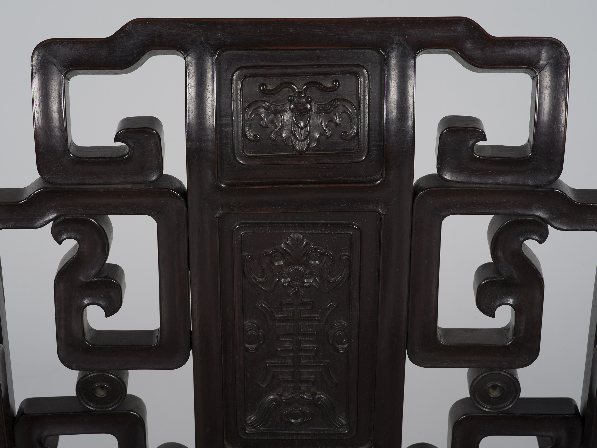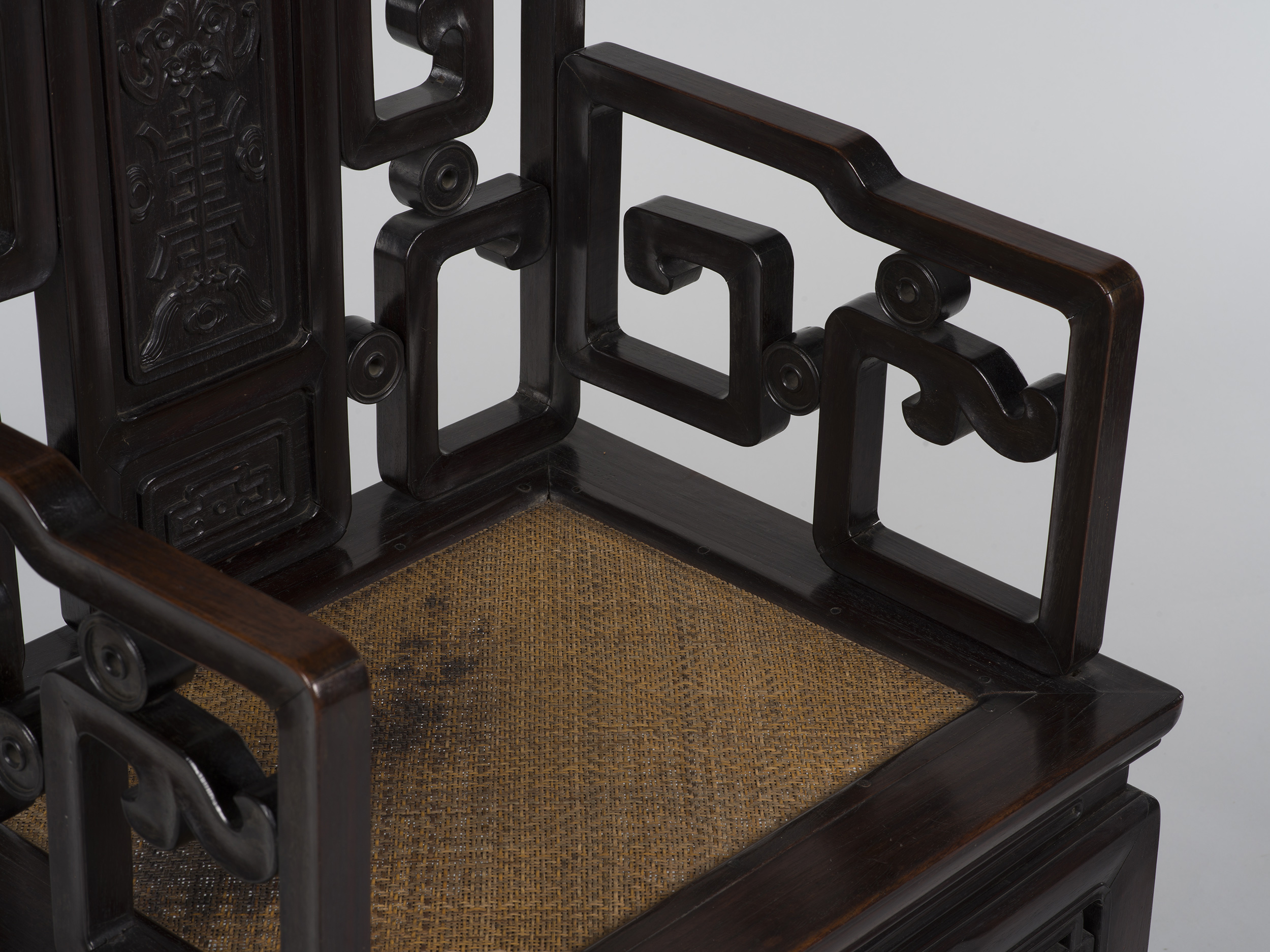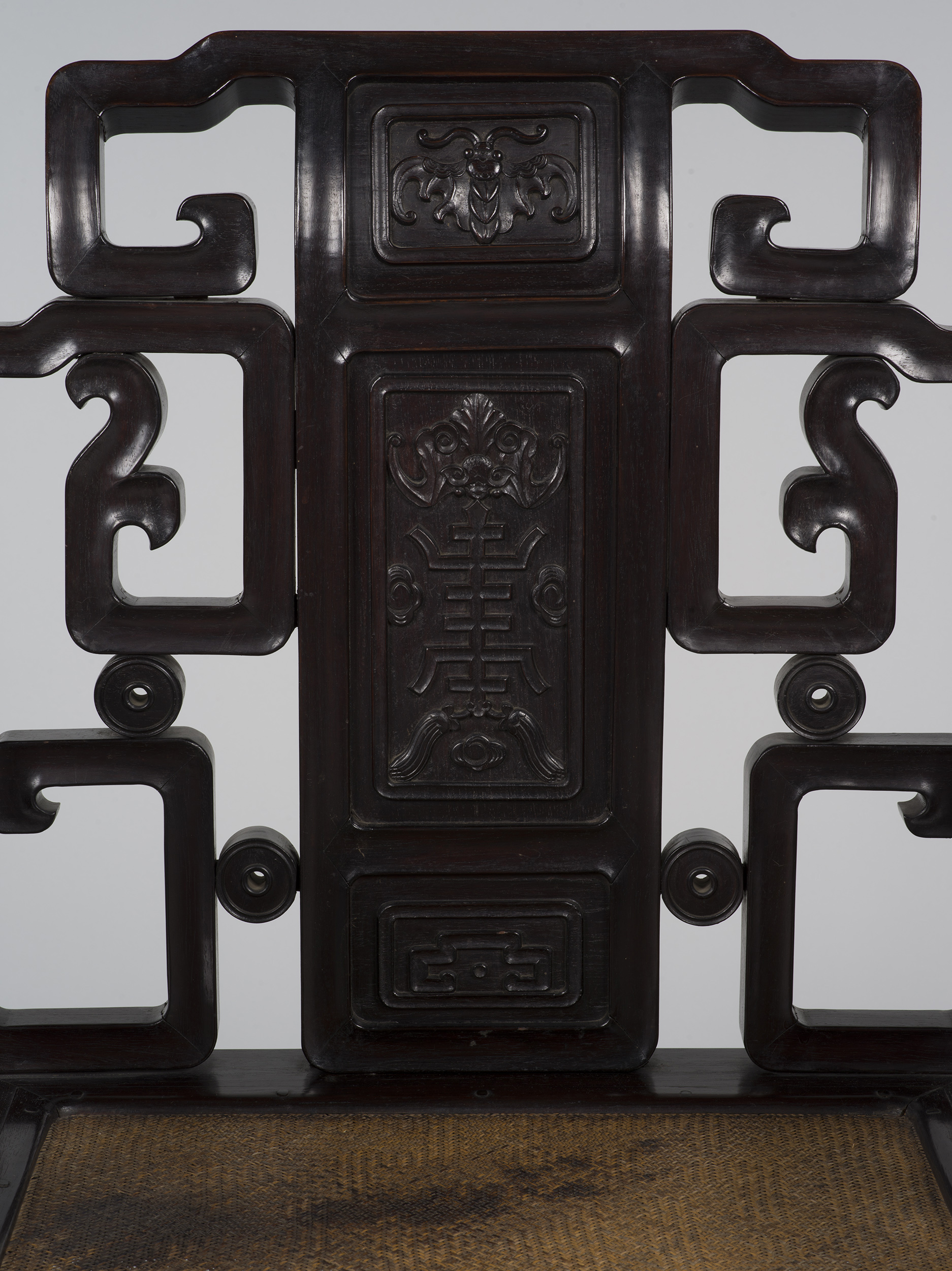 Siedzisko fotela gęsto plecione trzciną. Oparcie o konstrukcji trzyczęściowej – środkowej pełnej, i bocznych ażurowych. Część zagłówka łukowato odchylona ku tyłowi. Środkowa część oparcia podzielona na trzy pola, każde wypełnione reliefową dekoracją. Pierwsza przedstawia motyla, środkowa nietoperza, a trzecia, u dołu, uproszczony motyw chmury. Znaczenie tych symboli odnosi się do pomyślności, miłości i radości oraz szczęścia. Boczne panele oparcia i podłokietniki zostały wykonane ażurowym ornamentem o formie zaczerpniętej z meandra, z wykończeniem uproszczonym motywem floralnym.