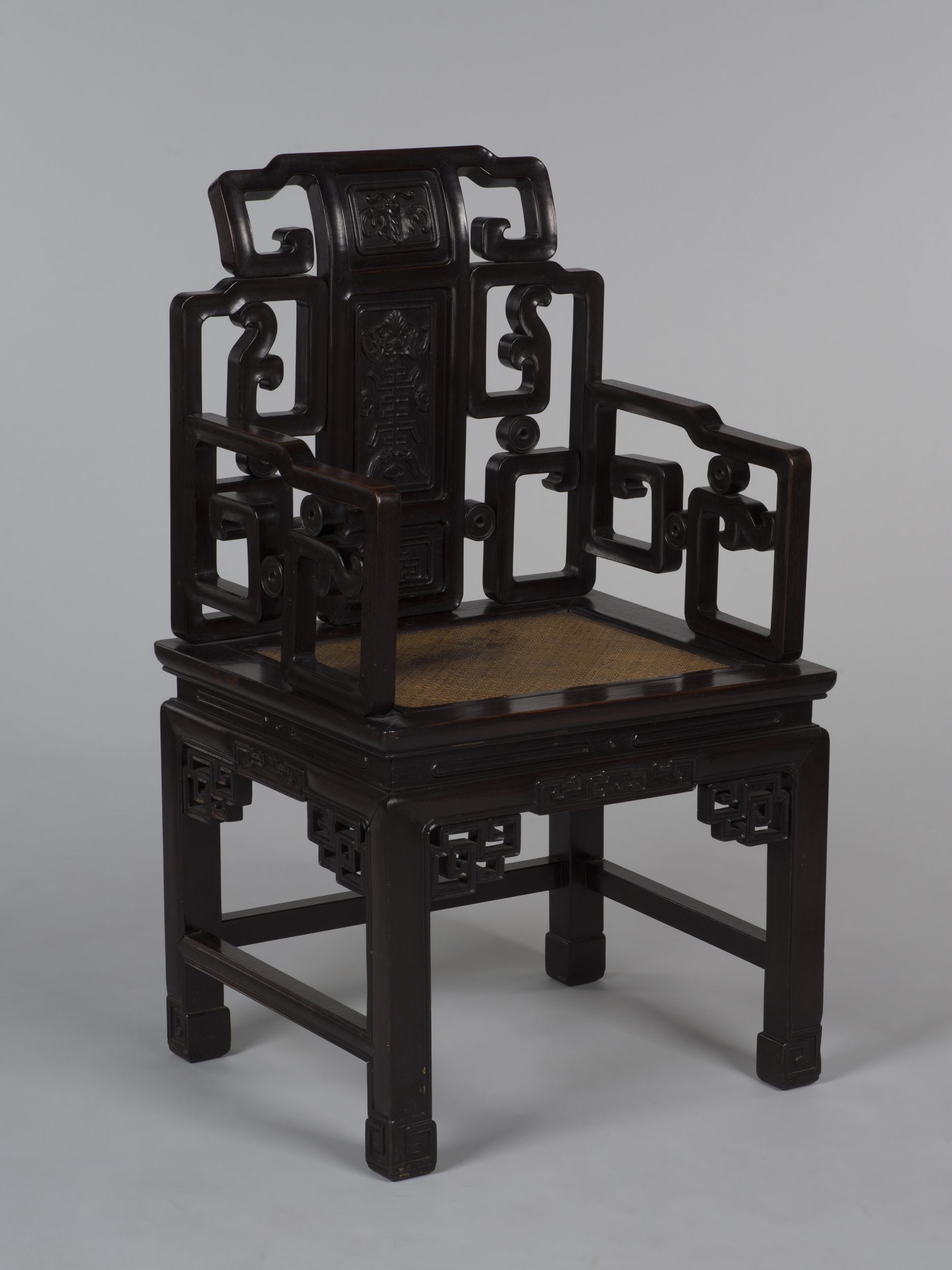 Drewniany rzeźbiony fotel z plecionym siedziskiem. Konstrukcja fotela składa się z dwóch części – taboretu z przewężeniem znajdującym się tuż pod siedziskiem oraz górnej części stanowiącej siedzisko z oparciem i podłokietnikami. Górna część nakładana na dolną, łączenie na czopy. Dolna część wsparta na czterech nogach o przekroju kwadratowym, zakończonych kostką zdobioną ornamentem meandrowym - na nogach przednich z przodu i na boku zewnętrznym, na nogach tylnych – jedynie na boku zewnętrznym. Nogi tylne i tylne z przednimi zostały połączone wiązaniem, którego łączyny w formie prostych listew, boczne zdobione na zewnętrznych krawędziach wklęską. Carga pod siedzeniem płaska z dwiema spłaszczonymi rezerwami w formie prostokąta z wyoblonymi narożami, z guzem pomiędzy nimi. Kąty proste między nogami fotela i łączynami pod siedziskiem zdobione ażurowym ornamentem o motywie zaczerpniętym z meandra - być może będącym nawiązaniem do chińskiego motywu chmur.