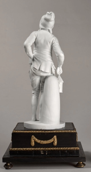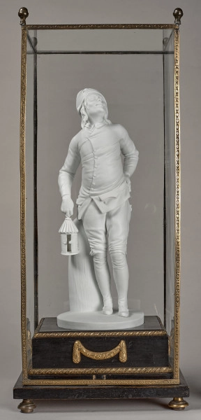 Figurka aktora Volange`a w roli Jeannota Biskwitowa figurka młodego mężczyzny o gminnych rysach twarzy, odgrywającego Jeannota, jedną z postaci z francuskich fars bulwarowych. Aktor stoi w lekkim kontrapoście, głowę zwraca ku górze z uśmiechem zadowolenia na twarzy. W prawej ręce trzyma lampę, którą podnosi ku górze. W okrągłej lampie z daszkiem, otwartej, widoczna jest świeczka. Drugą rękę wspiera na biodrze i odsłania kieszeń spodni, z której wystaje nieokreślony przedmiot. Ubrany jest w strój osiemnastowieczny: obcisły kaftan i spodnie do kolan, na głowie ma wysoką czapkę. Z tyłu postaci podpora w kształcie słupa. Figurka umieszczona jest w prostopadłościennej gablocie o przeszklonych ściankach ujętych w brązowe ramki, z drewnianym cokołem malowanym na brązowo, dekorowanym klasycystycznymi ozdobami z brązu. Biskwit wykonany został w manufakturze porcelany w Sèvres słynącej z wyrobu plastyki biskwitowej, głównie figurek, wyróżniających się wysokimi walorami artystycznymi. Jego modelerem był Joseph Le Riche, od 1757 r. zatrudniony w manufakturze porcelany w Sèvres, od 1780r. mistrz modelerski. Obiekt pochodzi z kolekcji księżnej Izabeli Lubomirskiej (1736-1816), właścicielki łańcuckiego zamku.