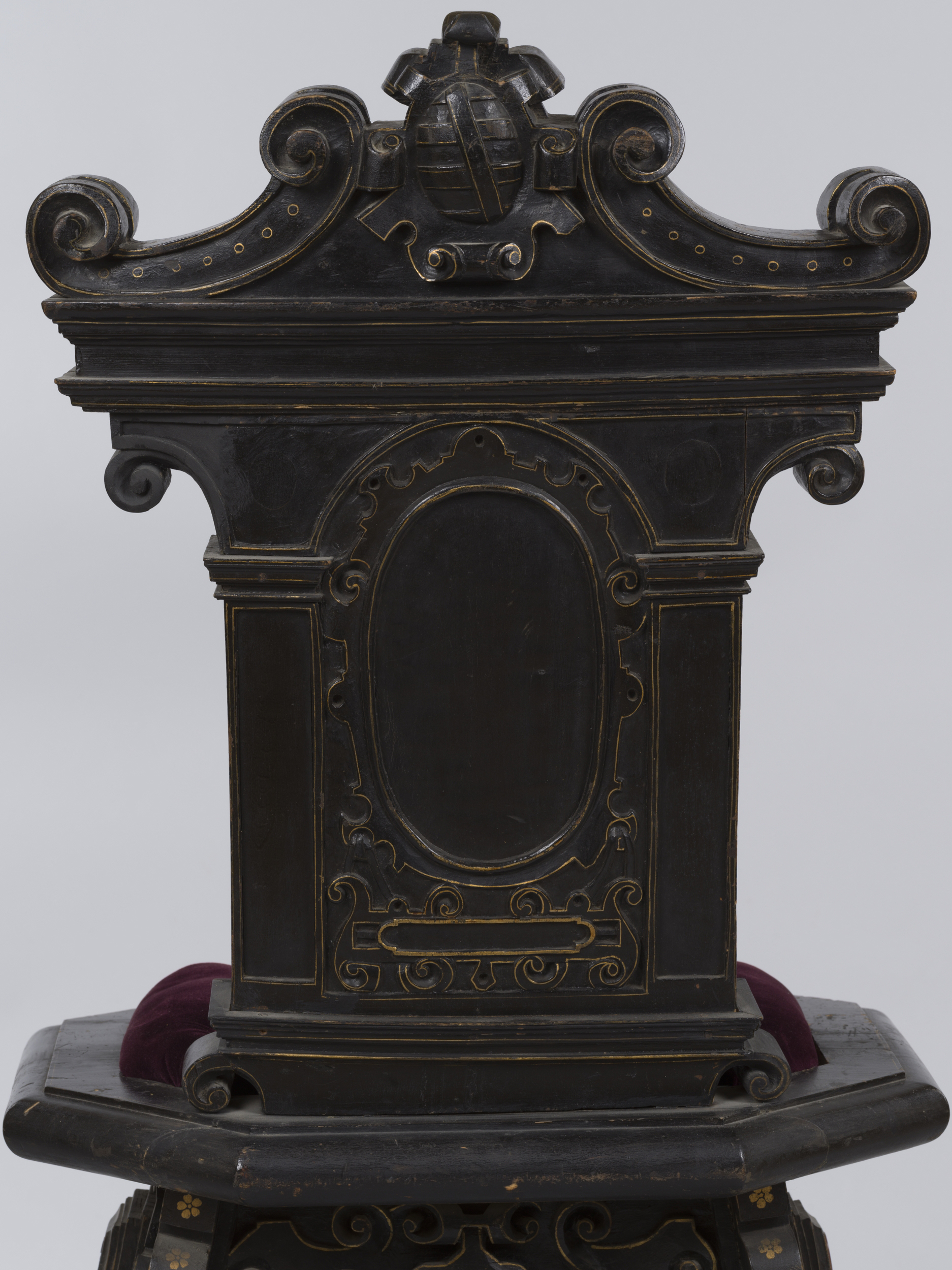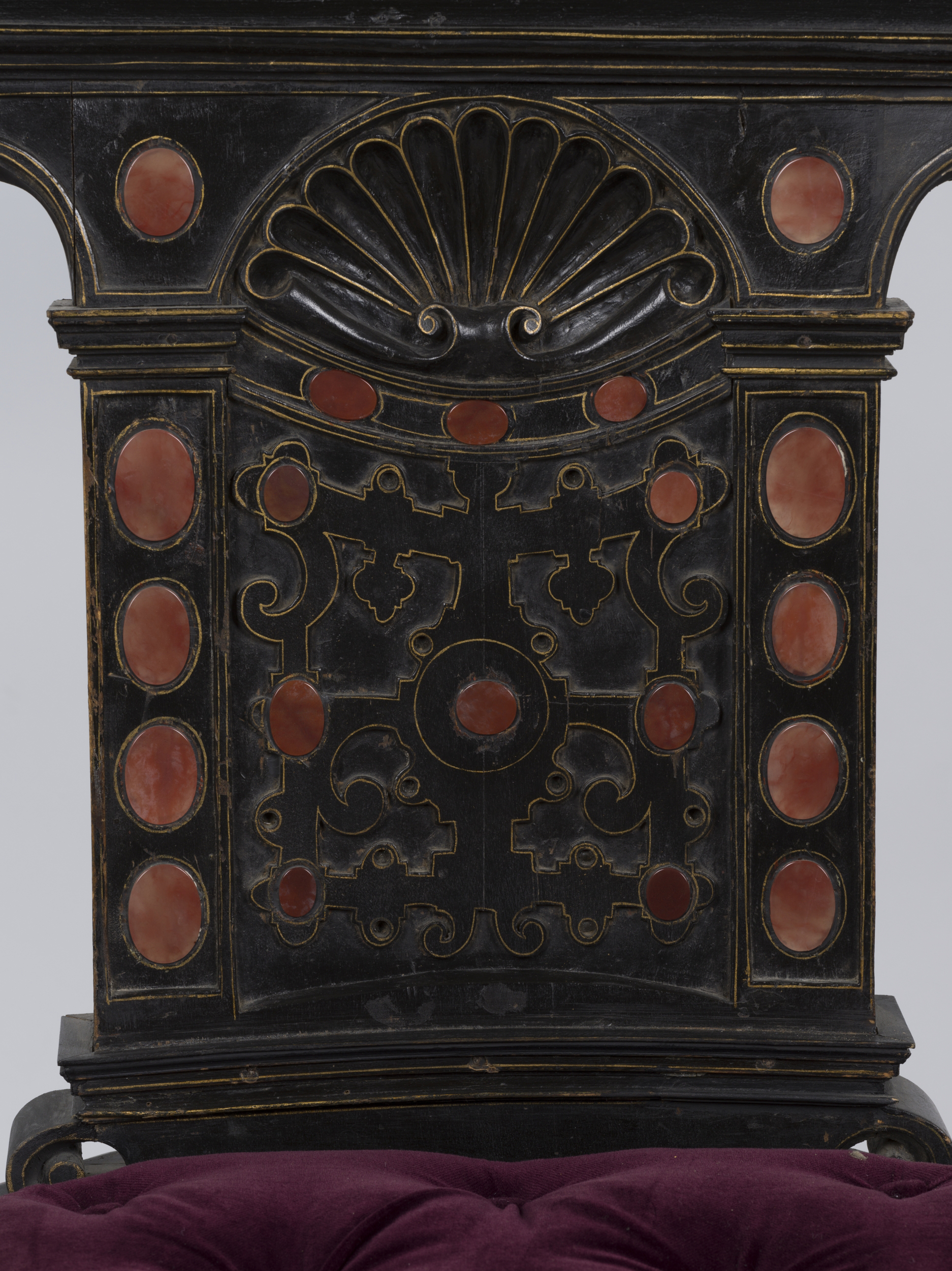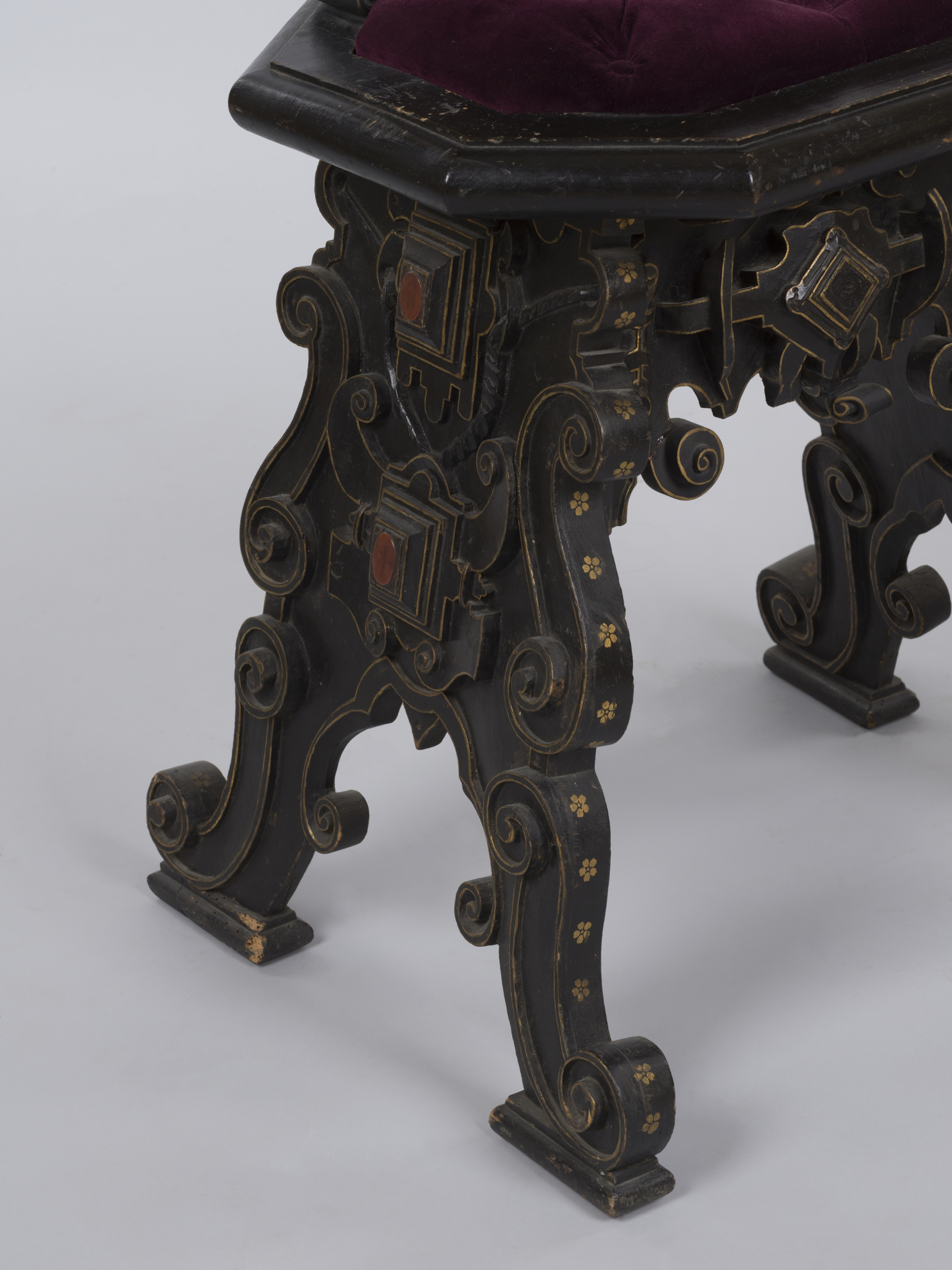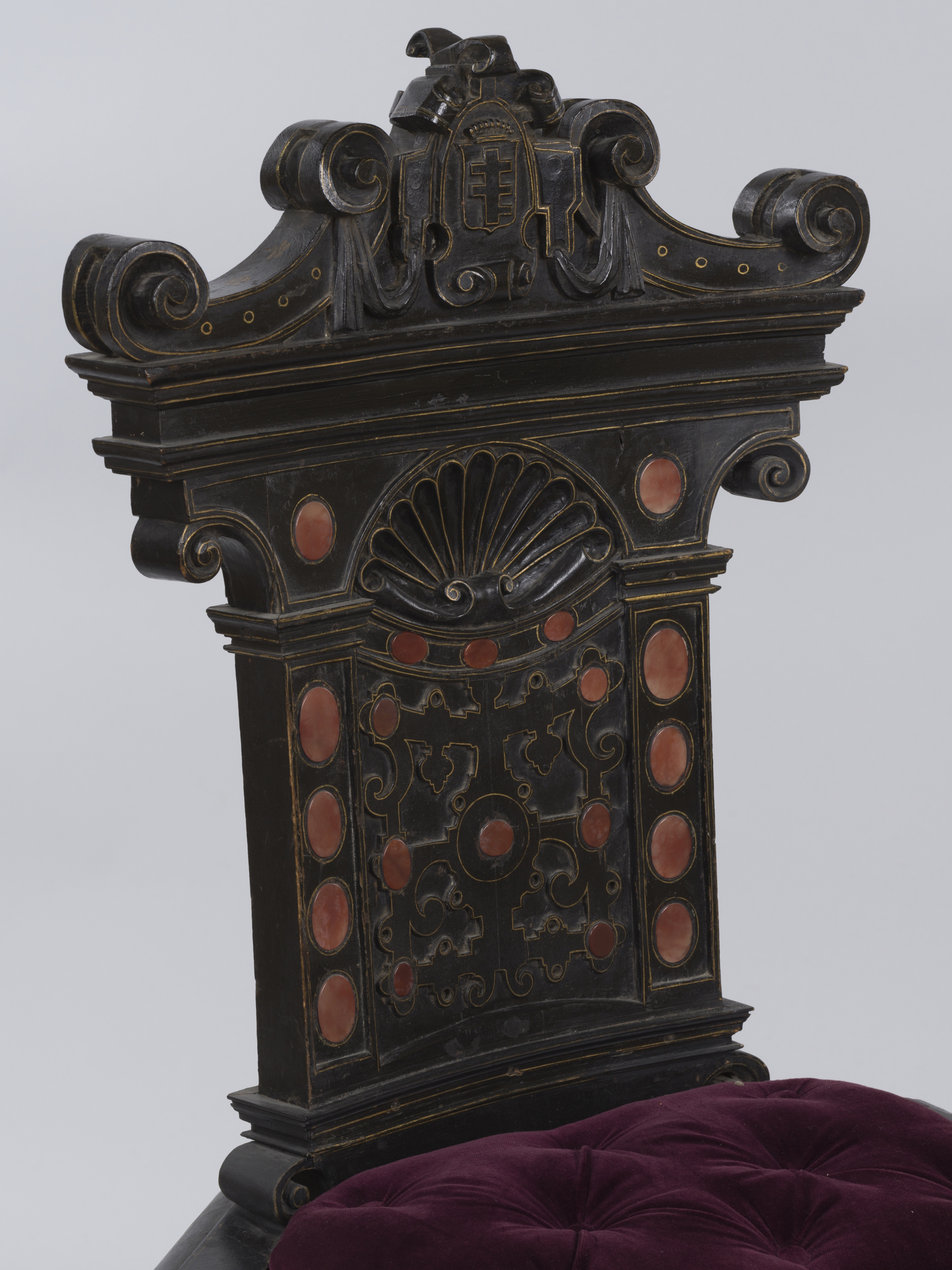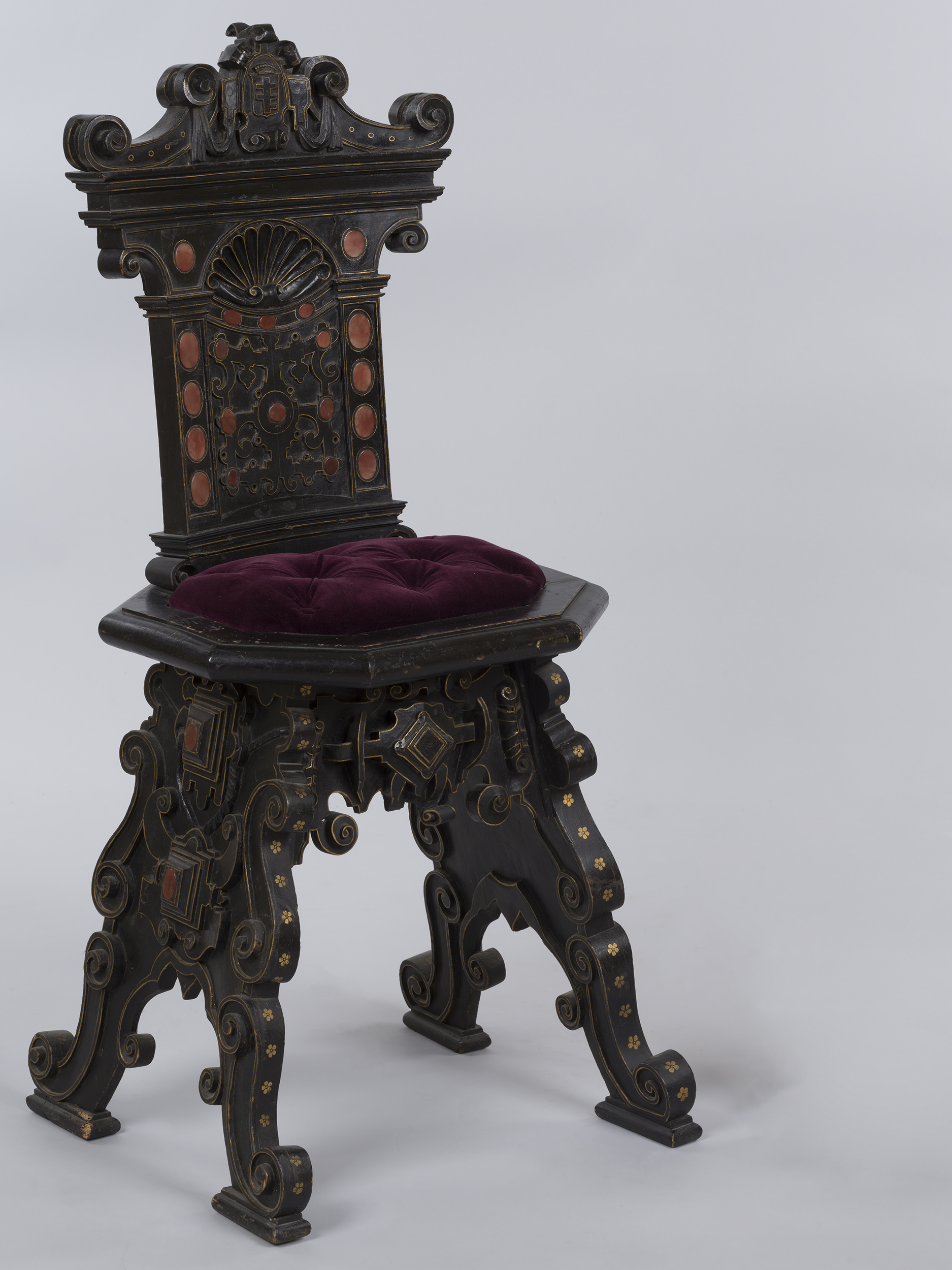 Zydel, jeden z sześciu „krzeseł wysadzanych kamieniami” (Wil.3904-Wil.3909) zakupionych przez hr. Aleksandra Potockiego we wrześniu 1844 r. w drezdeńskim magazynie handlowym Mejera. Jest to typ mebla o charakterystycznej konstrukcji; z pełnym oparciem pleców, ośmiokątnym siedziskiem wspartym na bocznych deskach zwanych policzkowymi przechodzącymi w pary nóg w Polsce zwany zydlem, we Włoszech scabello. Cała powierzchnia mebla jest bogato dekorowana pełnoplastyczną rzeźbą renesansowych motywów okuciowo-cęgowych barwionych na czarno. Kształty dekoracji podkreśla cienka złocona linia. Głównym elementem dekoracyjnym umieszczonym na oparciu i kartuszach podstawy są karnality w kształcie owalnym o zabarwieniu czerwonym. Zydel, podobnie jak cały komplet, jest kopią scabello wykonanych wg projektu Giovanniego Marii Nosseni w drerezdeńskiej pracowni rzeźbiarskiej i stolarskiej ok. 1580 r. zachowanych w zbiorach Kunstgewerbemuseum Dresden, Schloβ Pilnitz. Mebel wilanowski dość wiernie powtarza formę i motywy dekoracji stołków Nosseniego, wprowadzając odmienność w herbie znajdującym się w zwieńczeniu oparcia; umieszczono tam herb rodziny Potockich Pilawę na odwrocie zostawiając herb „saski”. Na tyle oparcia pleców umieszczono płaskie medaliony bez wizerunków rzymskich cesarzy, jak to jest w meblach z Pilnitz i automatycznie nie uwzględniono napisów na profilowanym gzymsie oparcia oraz podpisów pod medalionami. Dekoracja zydli kamieniami również się różni; w wilanowskich meblach wydrążone gniazda kamieni mają kształty w znacznej większości owalne w odróżnieniu od saskich, w których kwadratowe lub prostokątne kamienie mają oprawy metalowe. Część kamieni i poduszka na siedzisku są rekonstruowane. Zydle Aleksander Potocki przeznaczył do ekspozycji w muzeum wilanowskim.