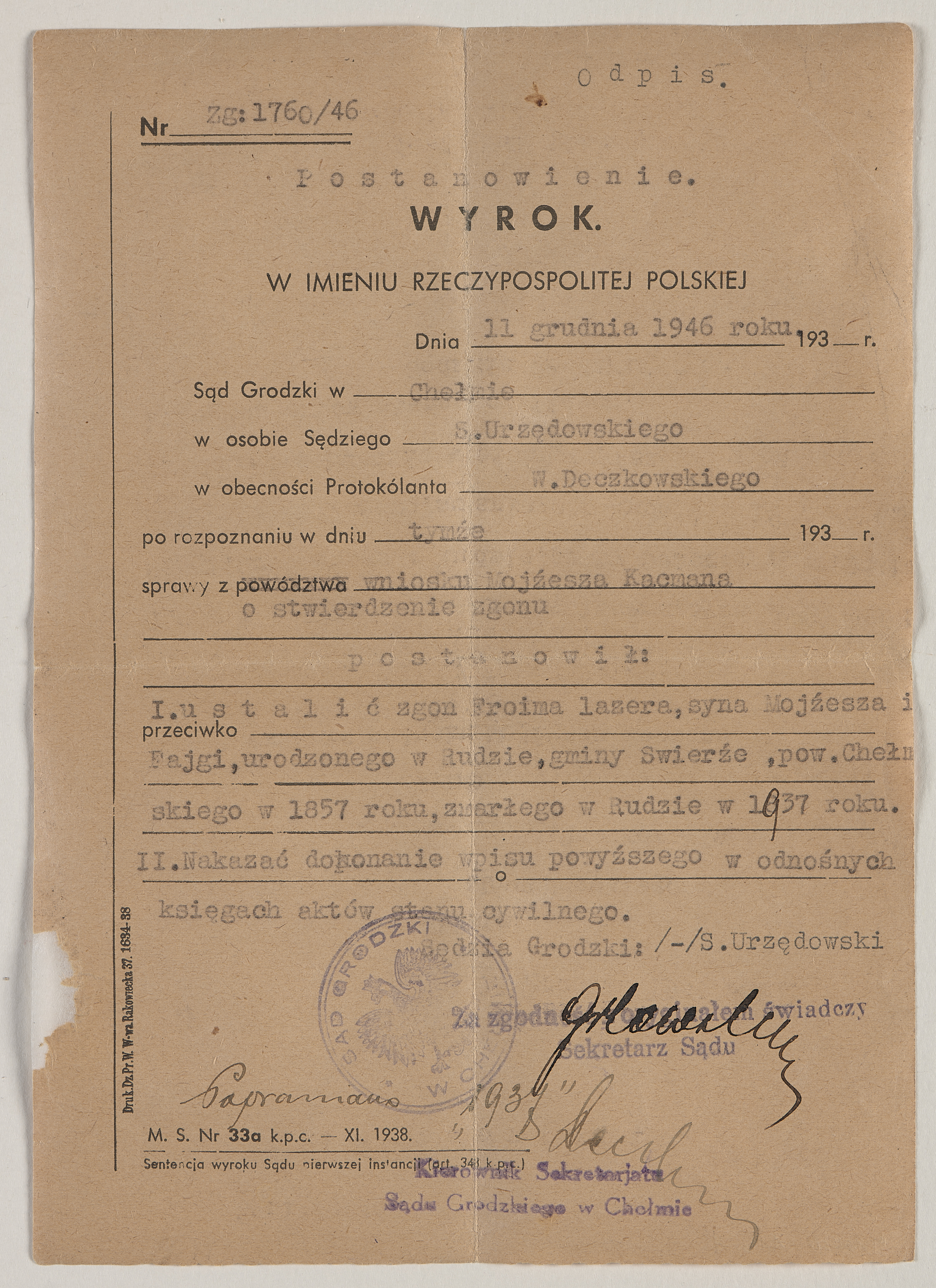 Postanowienie sądowe - ustalenie zgonu Froima Lazera, syna Fajgi i Mojżesza, urodzonego w Rudzie w powiecie chełmskim w 1857 - który zmarł w Rudzie 1937. Nr: zg:1760/46; na szablonie druku wykroku sądowego z lat 30.; z pieczątką okrągłą Sądu Grodzkiego w Chełmie.