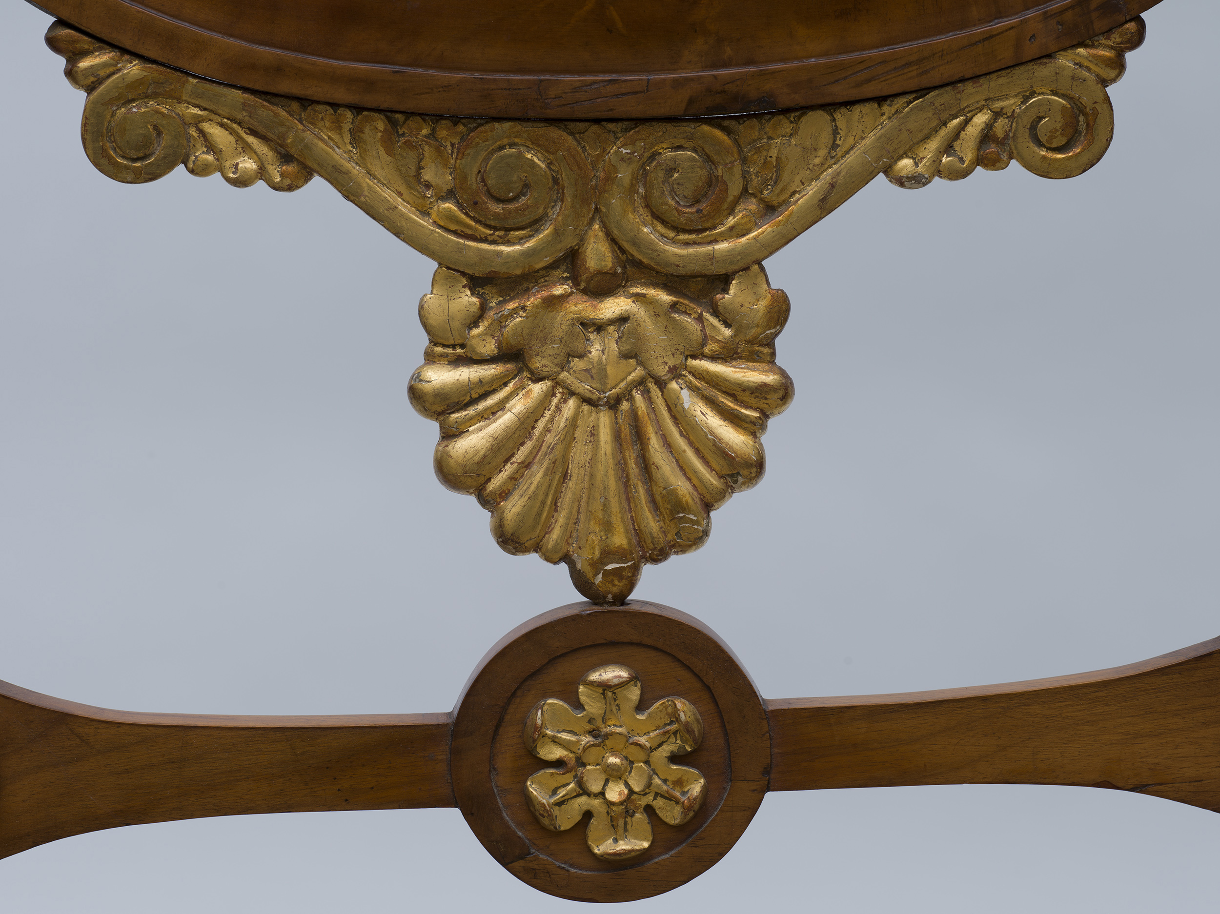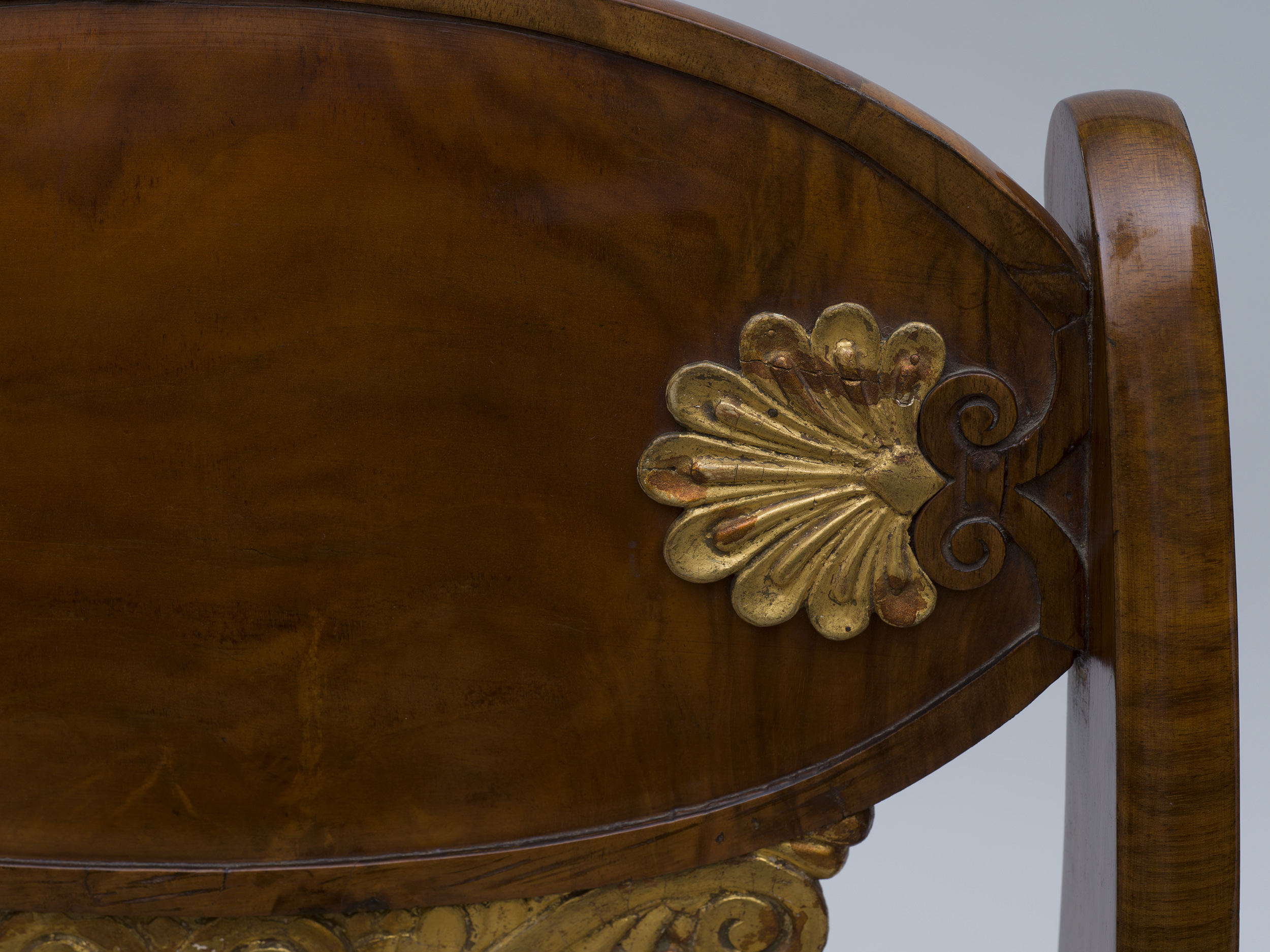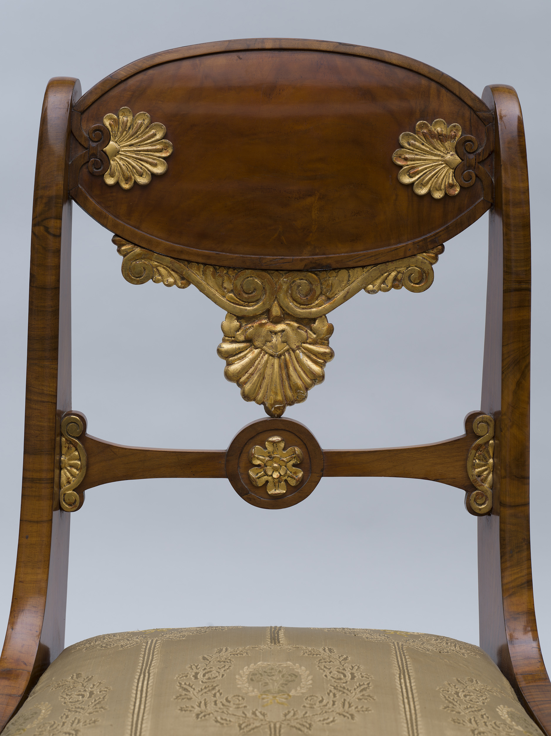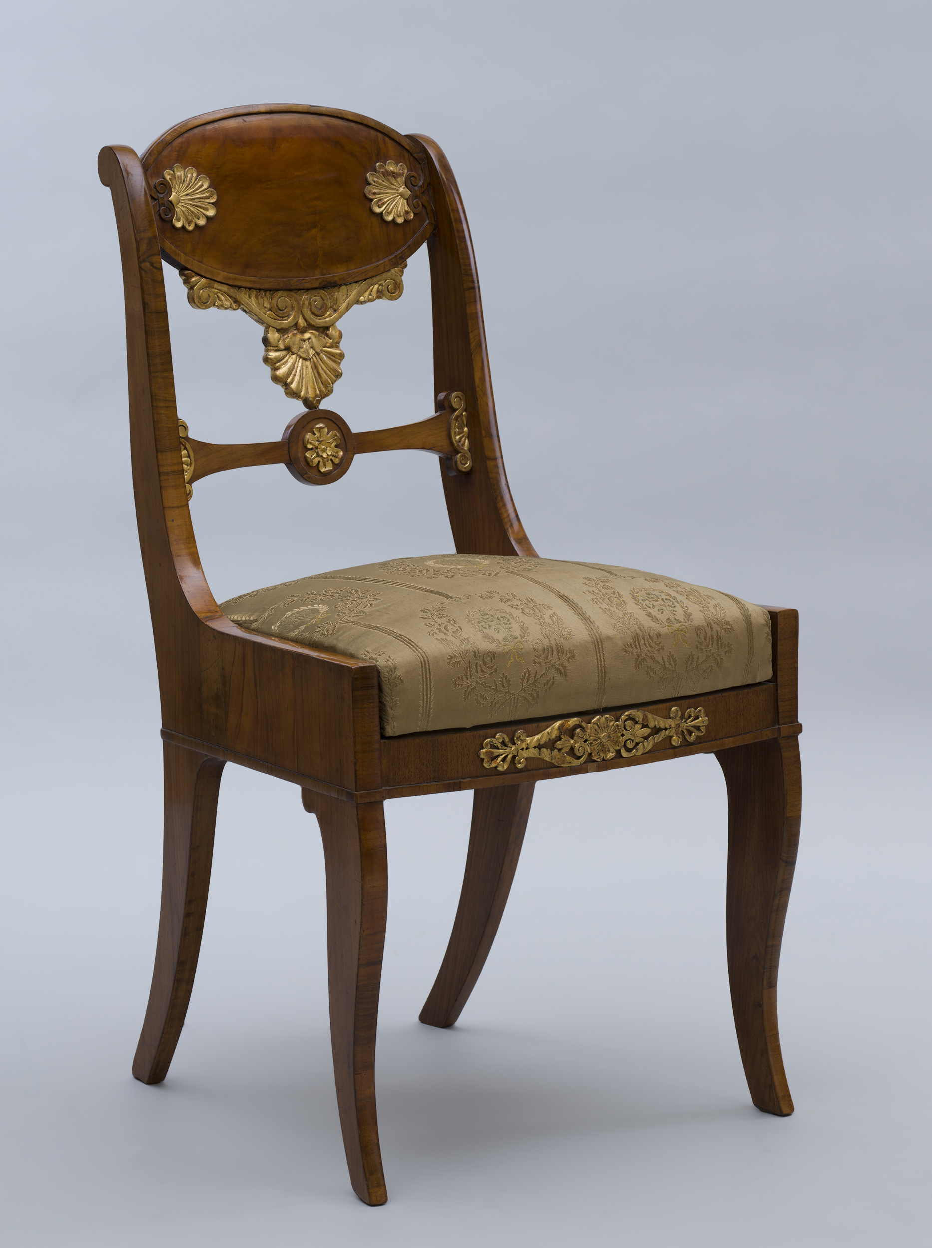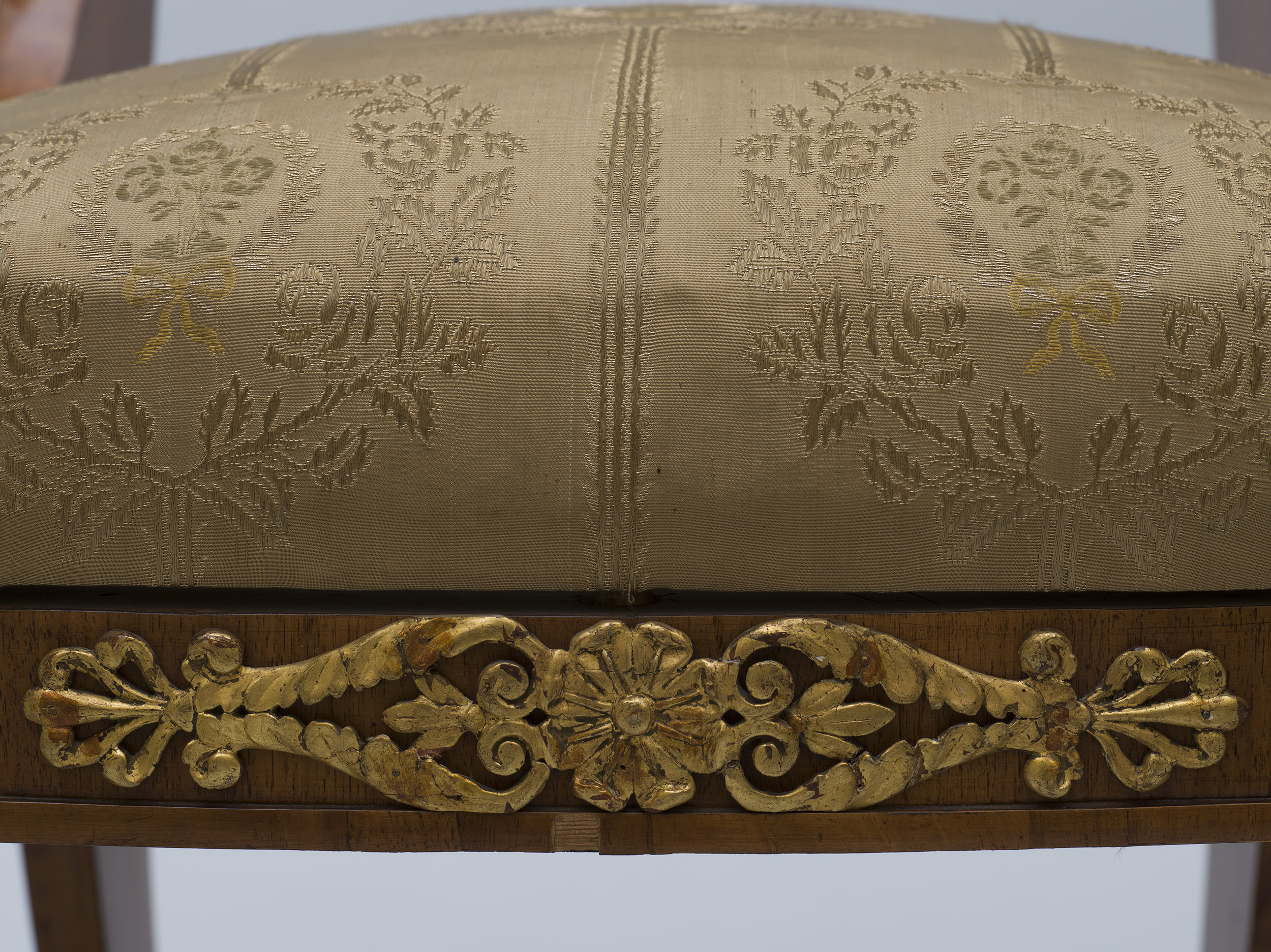 Krzesło o trapezoidalnym siedzisku, na czterech wąskich szablastych nogach o przekroju prostokątnym, lekko zbieżnych, przednich wygiętych do przodu, a tylnych nieco odgiętych ku tyłowi. Oparcie lekko odchylone do tyłu, płynnie przechodzące w ramiaki boczne siedziska, dwukrotnie szersze od ramiaków przedniego i tylnego. U góry oparcia znajduje się pozioma, owalna płycina ujęta w wąską ramkę, po bokach wolutowo zwiniętą do środka od góry i od dołu. Z połączenia wolutek wyrastają ku środkowi dwie złocone palmetki. Do dolnej krawędzi płyciny przymocowana została płaskorzeźbiona złocona palmeta oparta na dwóch połączonych ze sobą pośrodku symetrycznych wolutach. Poniżej niej wąska, pozioma przewiązka, na której pośrodku umieszczona została niewielka okrągła płycina wypełniona złoconą rozetką. Na przednim ramiaku pod siedziskiem umieszczono płaskorzeźbiony motyw złoconej rozety liściastej ujętej po obu stronach przez zwinięte na kształt liry liście akantu. Siedzisko tapicerowane, obite złocistym adamaszkiem w wąskie paski na których rozłożone są naprzemiennie duże różane wieńce.