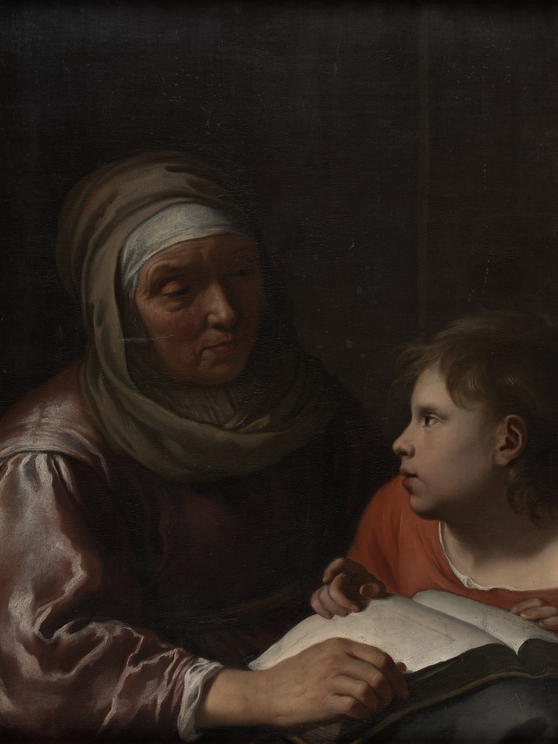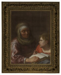 Obraz z kolekcji zamkowej przedstawia starszą kobietę uczącą dziewczynkę czytać z rozłożonej między nimi księgi. Wg tradycji jest to św. Anna ucząca czytać Marię - Matkę Boską, czyli córkę. Obraz jest XVII – wieczny, sygnowany w prawej górnej części „ J. v. Bronkhorst”. Jan Gerritsz van Bronckhorst (ur w 1603 r w Utrechcie, zm. w 1661 r w Amsterdamie) to holenderski malarz okresu baroku, był też grawerem. Przez sześć miesięcy pracował jako grawer szkła w hucie szkła w Utrechcie. W 1620 r rozpoczął podróż do Francji, gdzie pracował w Paryżu, również w hucie szkła. Po powrocie do Utrechtu w 1622 r rozpoczął naukę malarstwa (u Cornelisa Poelenburga). W 1647 r przeniósł się do Amsterdamu, gdzie pracował w kalwińskim zborze, wykonując witraże i zdobiąc organy (w protestanckich zborach zdobnictwo jest bardzo ubogie). W jego obrazach uwidacznia się wpływ Caravaggia, tematy przez niego przedstawiane są ukazywane w sposób intymny, a zarazem pełen zmysłowości. Oczywiście nie dotyczy to omawianego przez nas obrazu, którego tematyka niejako „wymusza” odpowiednie pokazanie sceny. Wg tradycji rodzicami Marii byli Joachim i Anna, którzy swą córkę oddali na naukę do świątyni, niemniej malarz mógł przedstawić taką scenę. Jest to o tyle problematyczne, że protestanci, do których należał malarz nie otaczają Marii kultem tak jak w wyznaniu rzymsko – katolickim, czy prawosławiu. W naszym obrazie również widać wpływ Caravaggia, w oświetleniu, którego źródła nie widać na obrazie, a które pada z lewej strony od góry oświetlając całą scenę, wydobywając z mroku jej najważniejsze elementy.