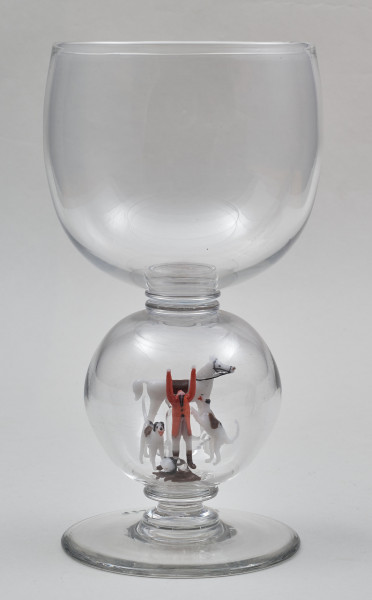 Kielich w typie „Römer” przeznaczony do wina. Posiada półkolistą czaszę z cylindrycznym zwężeniem u góry. Charakterystyczny jest nodus w kształcie kuli. Kielich zakończony jest okrągłą, gładką stopą. Stopa i czara połączone są z nodusem pierścieniami. W nodus wtopiona jest scena myśliwska z tradycyjnego, angielskiego typu polowania par force, wykonana z barwionego szkła. Przedstawiona została stojąca postać myśliwego, unoszącego nad głową w wyciągniętych dłoniach ciało upolowanego lisa. Mężczyzna ubrany jest w brązowe buty z cholewkami, białe spodnie i czerwony żakiet. Obok widoczne są dwie figurki chartów; jeden wspiera się przednimi łapami o swojego pana, drugi spokojnie stoi po drugiej stronie myśliwego. Za postacią człowieka umieszczony jest biały koń z brązową uprzężą i siodłem.