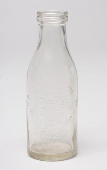 Przed 1945 rokiem w Szczecinie mleko sprzedawane było w półlitrowych, szklanych butelkach. Takich właśnie rozmiarów pojemniki trafiają do zbiorów Muzeum Historii Szczecina, odnalezione przypadkiem przez mieszkańców poniemieckich domów lub archeologów, szczególnie na obszarze Starego Miasta i jego okolic. Spośród kilku muzealnych egzemplarzy interesująca jest butelka zawierająca wypukły relief przedstawiający mityczną boginię Sedinę – główną postać ze znanego szczecińskiego pomnika autorstwa Ludwika Manzela (1858–1936), zdobiącego fontannę na Marktplatz (obecnie Plac Tobrucki). Wymyślona pod koniec XIX wieku personifikacja handlowego i morskiego charakteru miasta, stała się w XIX i 1. połowie XX wieku symbolem Szczecina. Jej imię i wizerunek często umieszczane więc były na lokalnych wyrobach rzemieślniczych i produktach przemysłowych.