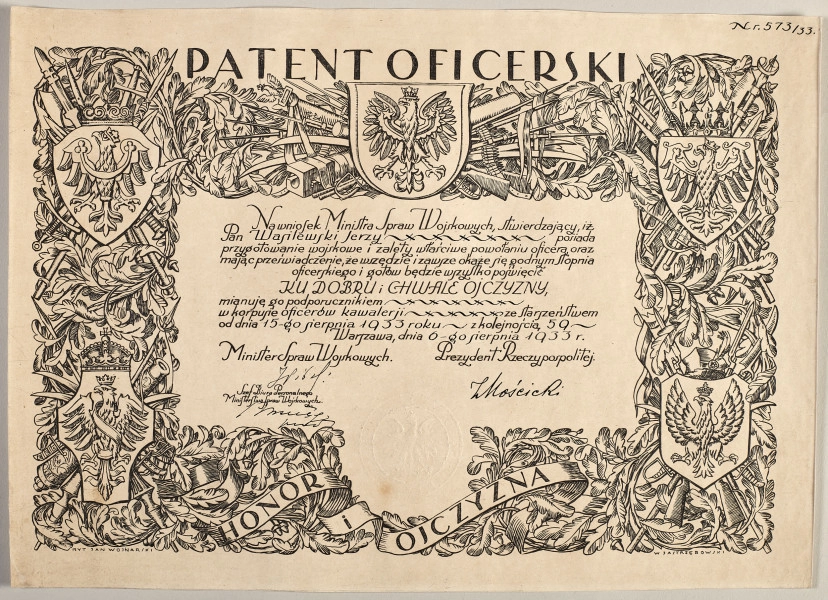 Patent oficerski o nr 573/33, odbity na papierze wg projektu graficznego J. Jastrzębowskiego. Nadany ostatniemu dowódcy 10 Pułku Strzelców Konnych Jerzemu Wasilewskiemu w 1933 r., podpisany przez prezydenta Ignacego Mościckiego i marszałka Józefa Piłsudskiego. Historia patentów oficerskich w II RP rozpoczyna się dekretem Rady Regencyjnej z 12 października 1918 r. Dokument stwierdzał, że wojsko, z chwilą zaprzysiężenia przechodzi pod władzę Rady, która podpisuje wszystkie nominacje oficerskie. Rada zatwierdzała też dotychczasowe mianowania i awanse oficerów walczących na różnych frontach I wojny światowej. Od 11 listopada 1918 r. stopnie wojskowe oficerów nadawał początkowo naczelny wódz Wojska Polskiego, a później naczelnik państwa, wydając w tej sprawie odpowiednie dekrety. W następnych latach funkcja ta należała do Prezydenta RP i Ministra Spraw Wojskowych. Patentem potwierdzany był pierwszy awans. Widniała na nim data, liczba starszeństwa i korpus osobowy. Patenty z tego okresu były wykonane na pergaminie, a później na papierze czerpanym i bogato zdobione symbolami wojskowymi. Na środku u góry mieścił się napis „Patent oficerski” i herb państwa. Na dole zaś okrągła pieczęć wojskowa i dewiza „Honor i Ojczyzna”. Środek patentu wypełniała treść uzasadniająca nominację, obejmująca zalety właściwe powołaniu oficera oraz zdolności do spełniania obowiązków nadanego mu stopnia oficerskiego i gotowość poświęcenia wszystkiego ku Dobru i Chwale Ojczyzny. Od 1936 r. obok patentów zaczęto wydawać oficerom dyplomy nominacyjne z podpisem Prezydenta RP, Ministra Spraw Wojskowych i szefa Biura Personalnego. Ponadto wszystkie awanse były ogłaszane w „Dzienniku Personalnym Ministerstwa Spraw Wojskowych”.