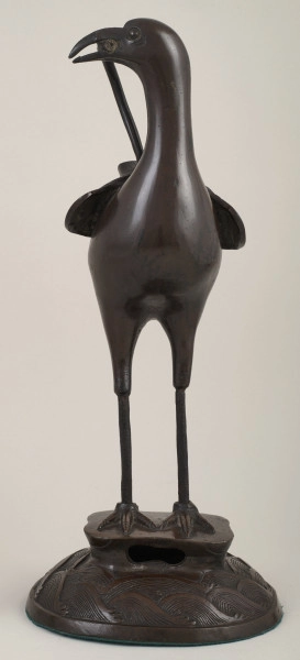Kadzielnica w kształcie stojącego żurawia, odlew z brązu, cyzelowany. Wysokie nogi ptaka wskazują podobieństwo do dropia, w dziobie trzyma gałązkę. Stoi na półokrągłej podstawie zdobionej rzeźbieniem przedstawiającym fale. Głowa ukazana jest w trzech/czwartych, przechylona. Na grzbiecie – na złożonych skrzydłach znajduje się okrągły otwór, ozdobiony liśćmi wawrzynu. Chiny, XIX wiek. Kadzielnica to naczynie przeznaczone do spalania kadzidła lub perfum w postaci stałej. Naczynia te w różnych kulturach czy krajach różniły się znacznie rozmiarem, formą i materiałem konstrukcyjnym. Znajdowały zastosowanie typowo użytkowe w obszarze świeckim jak i sakralnym już od czasów starożytnych. Służyły do oczyszczania powietrza z patogenów w przypadku zagrożenia epidemiologicznego, perfumowania pomieszczeń podczas uczt lub uroczystości, a nawet odmierzania czasu podczas rytuałów i ceremonii – mierzono wówczas postęp spalania kadzideł stożkowych. Kadzidełka są spalane przez umieszczenie ich bezpośrednio na źródle ciepła lub na gorącej metalowej płycie w kadzielnicy. Dla domowego użytku sprzedawane były małe, wklęsłe brykiety z węgla drzewnego. Zapalało się róg brykietu, a następnie umieszczało go w kadzielnicy i gasiło płomień. Po tym, jak świecące iskry przemierzyły cały brykiet, gotowy do umieszczenia na nim kadzidła.