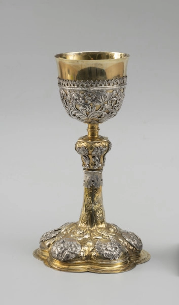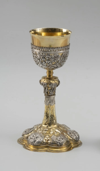 Barokowy kielich mszalny ufundowany został, zgodnie z inskrypcją na stopie, dla kościoła w Chełmsku Śląskim. Cechuje go smukłość form i wyważone proporcje. Korpus naczynia jest trybowany, rytowany, a także zdobiony kontrastującymi ze złotym tłem srebrnymi reliefowymi plakietkami i ażurowymi nakładkami. Sześciolistną stopę zdobią owalne plakietki ze scenami Narodzin Jezusa, Hołdu Trzech Króli i Ostatniej Wieczerzy, na przemian z uskrzydlonymi główkami anielskimi. Dekorację kielicha tworzą ponadto charakterystyczne dla 2. połowy XVII wieku kwiaty na ulistnionych łodyżkach, w tym tulipany oraz irysy. Szczególnie interesujące jest wkomponowanie w ażurowy koszyczek czary hierogramów Chrystusa, Marii oraz św. Józefa. O ile zwyczaj umieszczania na kielichu znaków Chrystusa i Marii jest znany od średniowiecza, o tyle dodanie liter symbolizujących św. Józefa wskazuje na charakterystyczny dla Śląska czasów kontrreformacji kult Świętej Rodziny. Zapoczątkował go teolog i filozof, opat klasztoru cysterskiego w Krzeszowie, Bernard Rosa (1624–1696). Założone przez niego w 1669 roku świeckie Bractwo Świętego Józefa miało na celu odnowę wiary katolickiej na Śląsku. Oprócz św. Józefa szczególną czcią darzono też Świętą Rodzinę, nazywaną wówczas Trójcą Stworzoną. Bractwo zyskało w niedługim czasie ogromną popularność – na początku XVIII wieku miało ponad 100 tysięcy członków. Na terenach należących do opactwa Bernard Rosa budował liczne kościoły i kaplice, w tym wzniesiony w latach 1670–1680 barokowy kościół św. Rodziny w Chełmsku Śląskim. Pochodzący z jego wyposażenia kielich, z dekoracją nawiązującą do wezwania świątyni, został wykonany zapewne w ostatniej ćwierci XVII wieku przez nieznanego śląskiego złotnika.