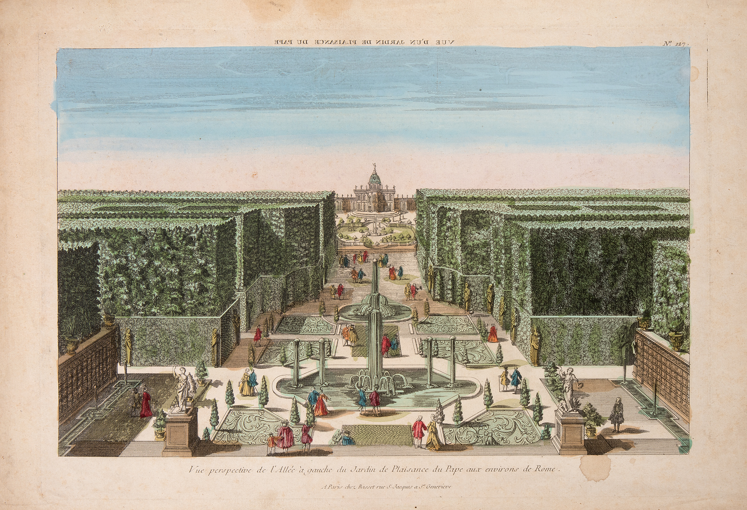 Prezentowana odbitka posiada u góry tytuł zapisany w lustrzanym odbiciu: VUE D’UN JARDIN DE PLAISANCE DU PAPE. Mimo prób identyfikacji jaką rezydencję papieską przedstawia XVIII-wieczna rycina, nie udało się wskazać konkretnego miejsca.