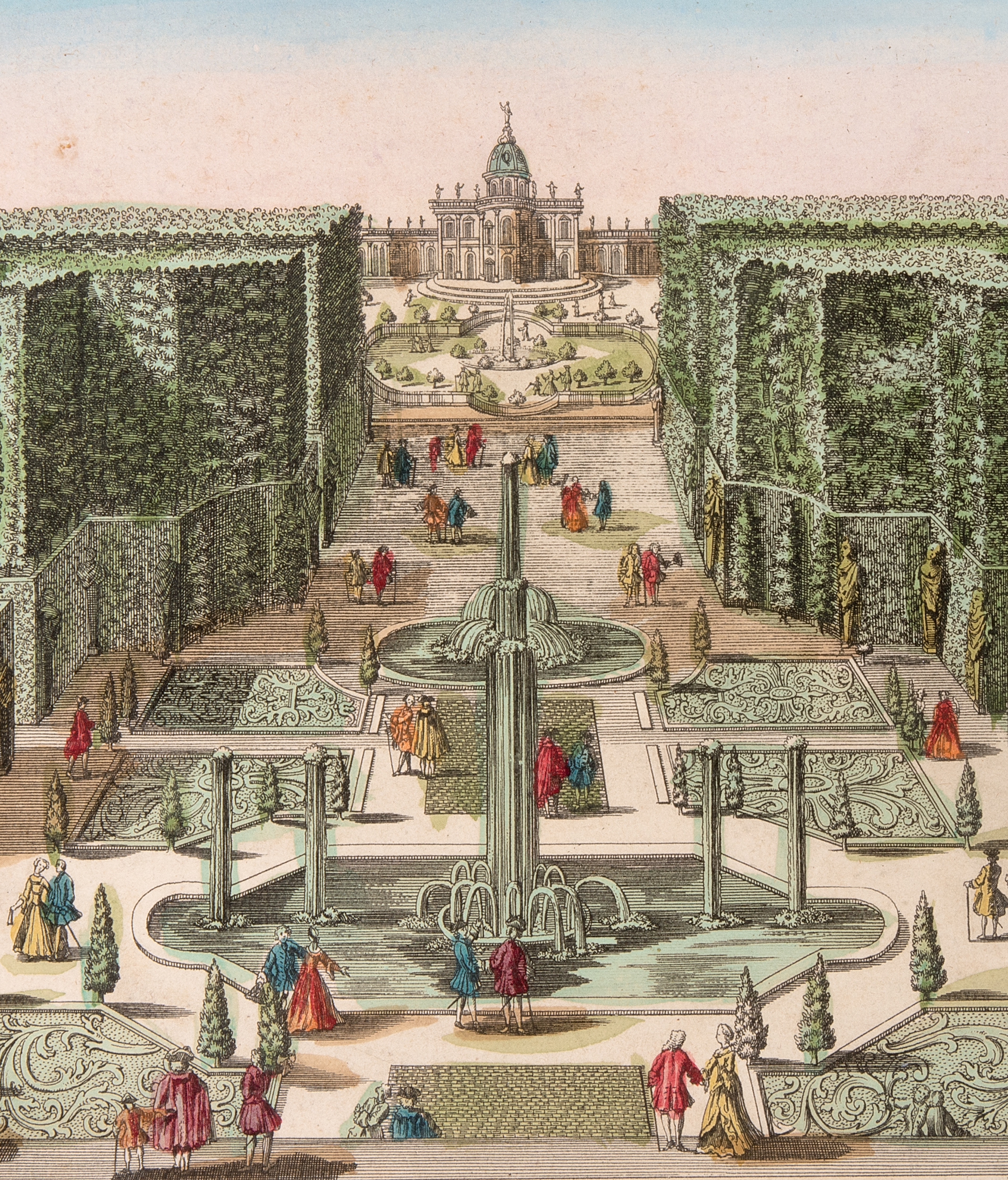 W samej scenie zwracają uwagę wysokie boskiego geometryczne, które – niczym w teatrze – kulisowo zamykają obustronnie kompozycje. Teatralny w istocie jest oglądany widok, w którym nakładają się kolejne plany; fontanny, rzeźby, dekoracyjne kwatery ogrodowe i krzewy, pomiędzy którymi – jak aktorzy na scenie – spacerują grupy ludzi. Jest to typowy ogród w typie francuskim, w którym roślinność podporządkowana została kompozycji artystyczno-przestrzennej według geometrycznych form i symetrii.