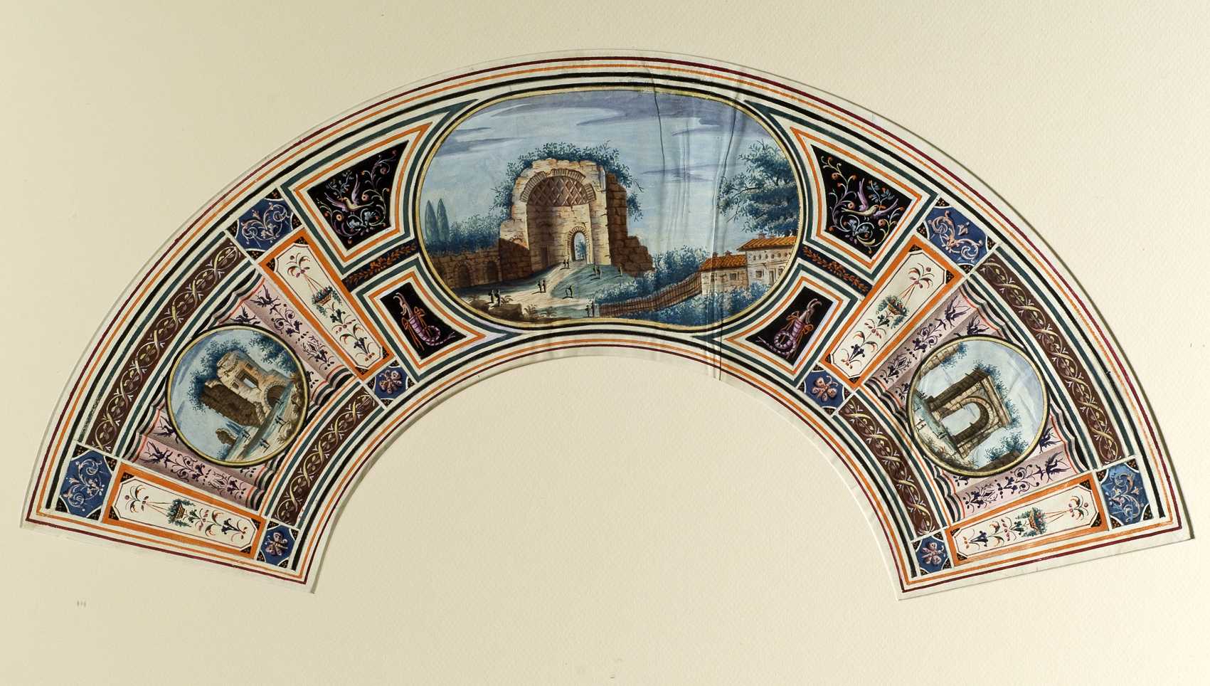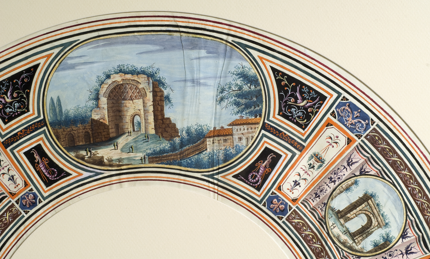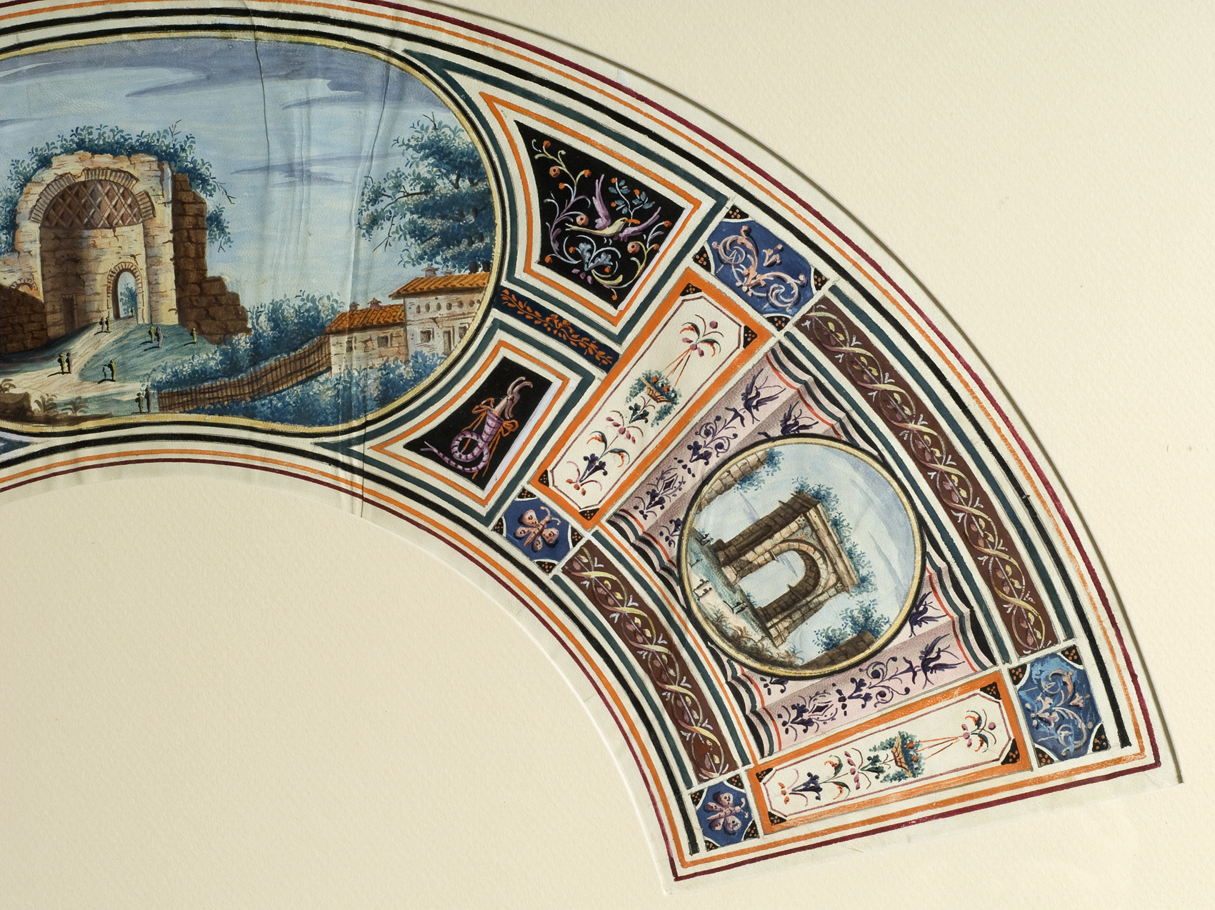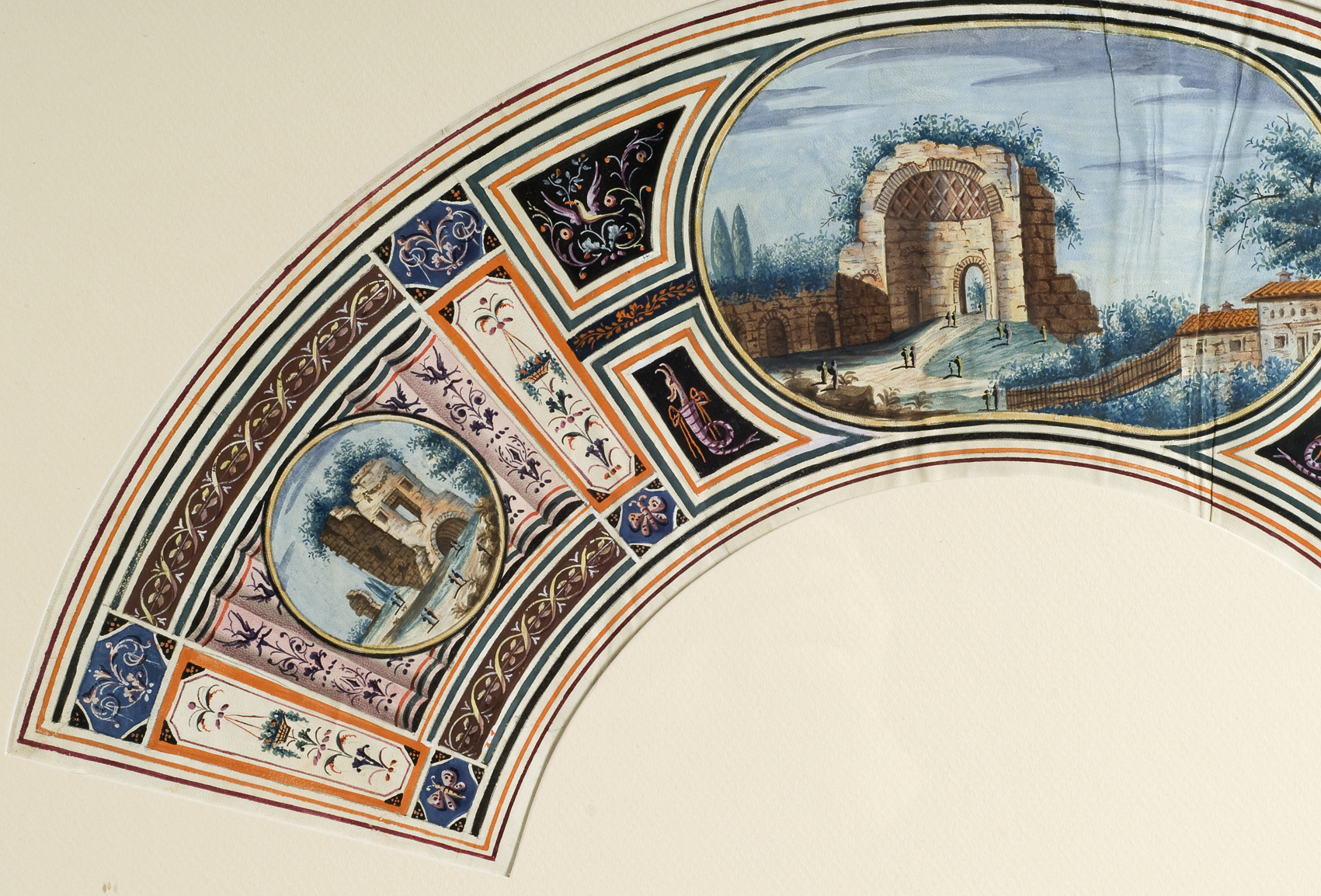 Pokrycie wachlarza składanego, plisowanego (nie zamocowanego nigdy na żeberkach stelażu) wykonane z białej, koźlęcej skóry dekorowanej gwaszem. Dekorację stanowią trzy kompozycje z widokami ruin rzymskich ze sztafażem. Centralny, owalny i największy, przedstawia ruiny Świątynię Wenery i Romy(?), zaś małe, boczne, w tondach, ruiny niezidentyfikowanych budowli. Widok centralny ujęty jest w wąskie liniowe żółte i czarne ramki, w narożach z barwną groteskę na czarnym tle w pomarańczowych wąskich, liniowych ramkach. Tą środkową dekorację z widokiem ruin Świątyni Wenery i Romy flankują dwie analogiczne kompozycje złożone z widoku ruin w tondzie w wąskich liniowych żółtych i czarnych ramkach, których tłem jest zmultiplikowany kandelabrowy ornament groteskowy, od góry i dołu ujęty pseudoplecionką na brązowym tle, flankowany kandelabrowymi, barwnymi groteskami na kremowym tle w pomarańczowych liniowych ramkach, na górze i na dole groteską na ciemnoszafirowym tle. Wszystkie trzy kompozycje ujęte są w dwie wąskie liniowe ramki, w kolorze pomarańczowym i brązowym.