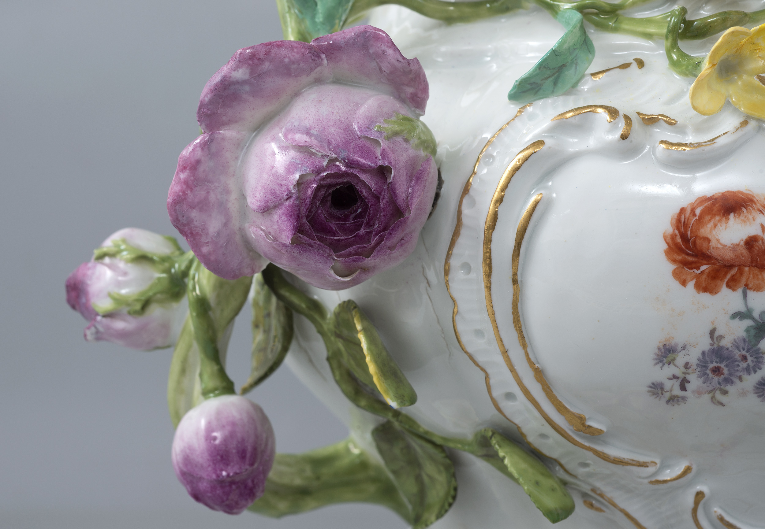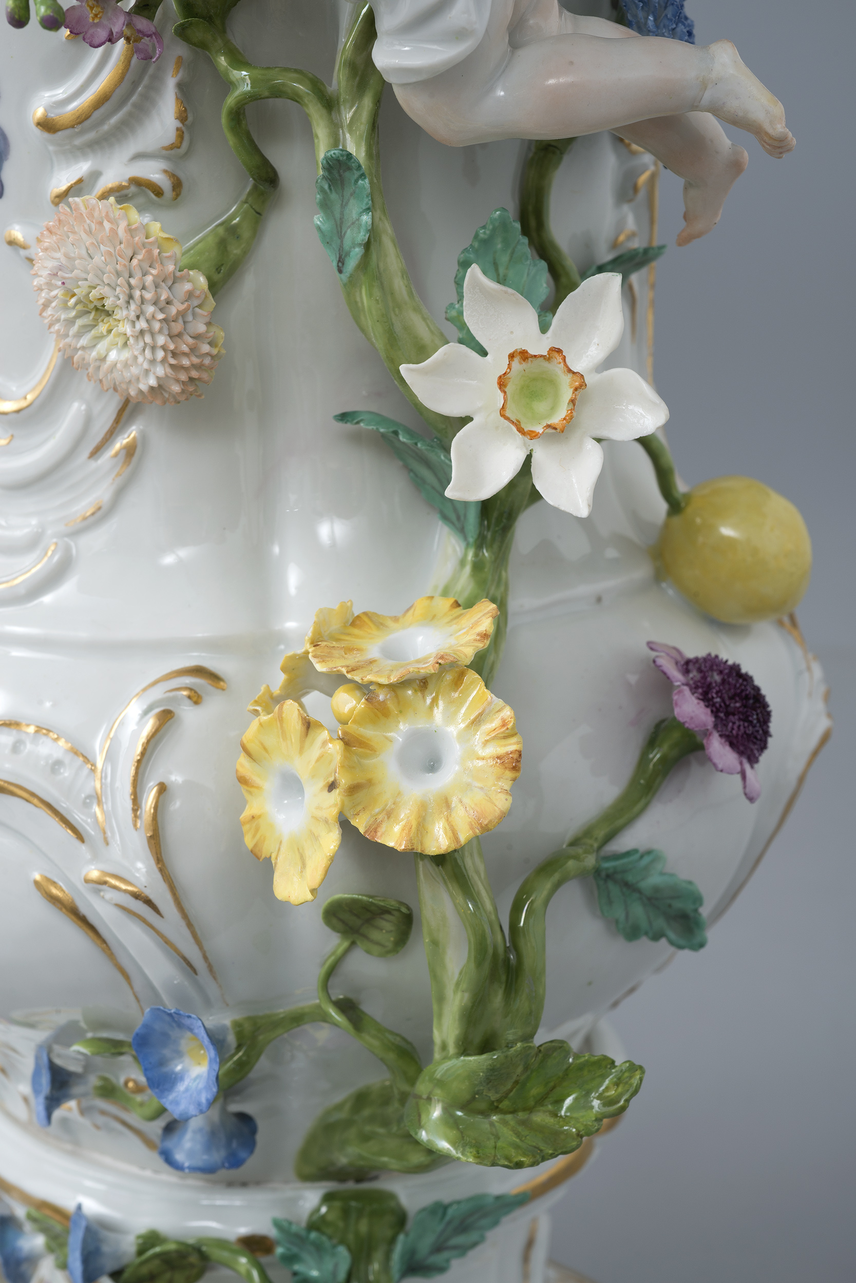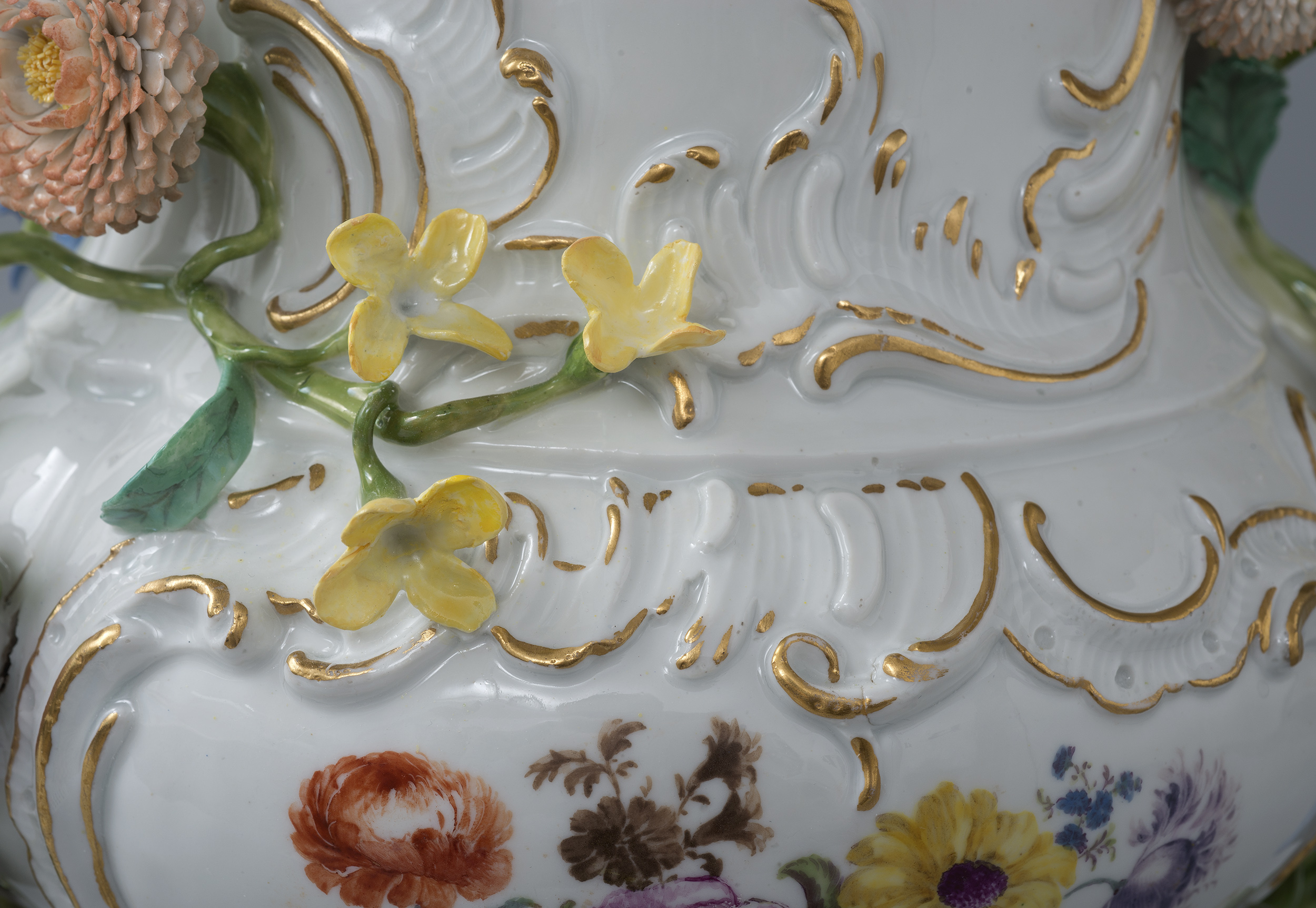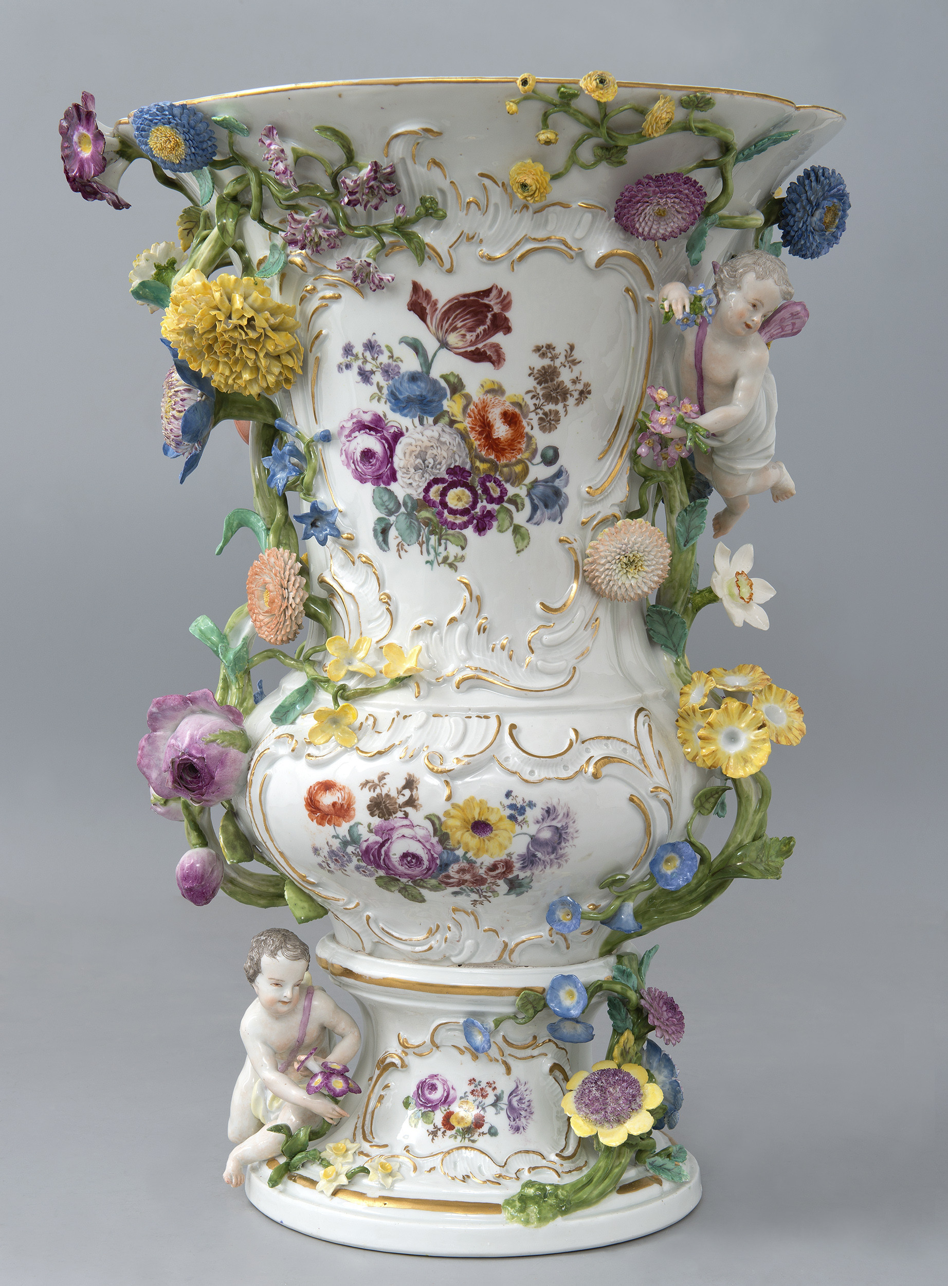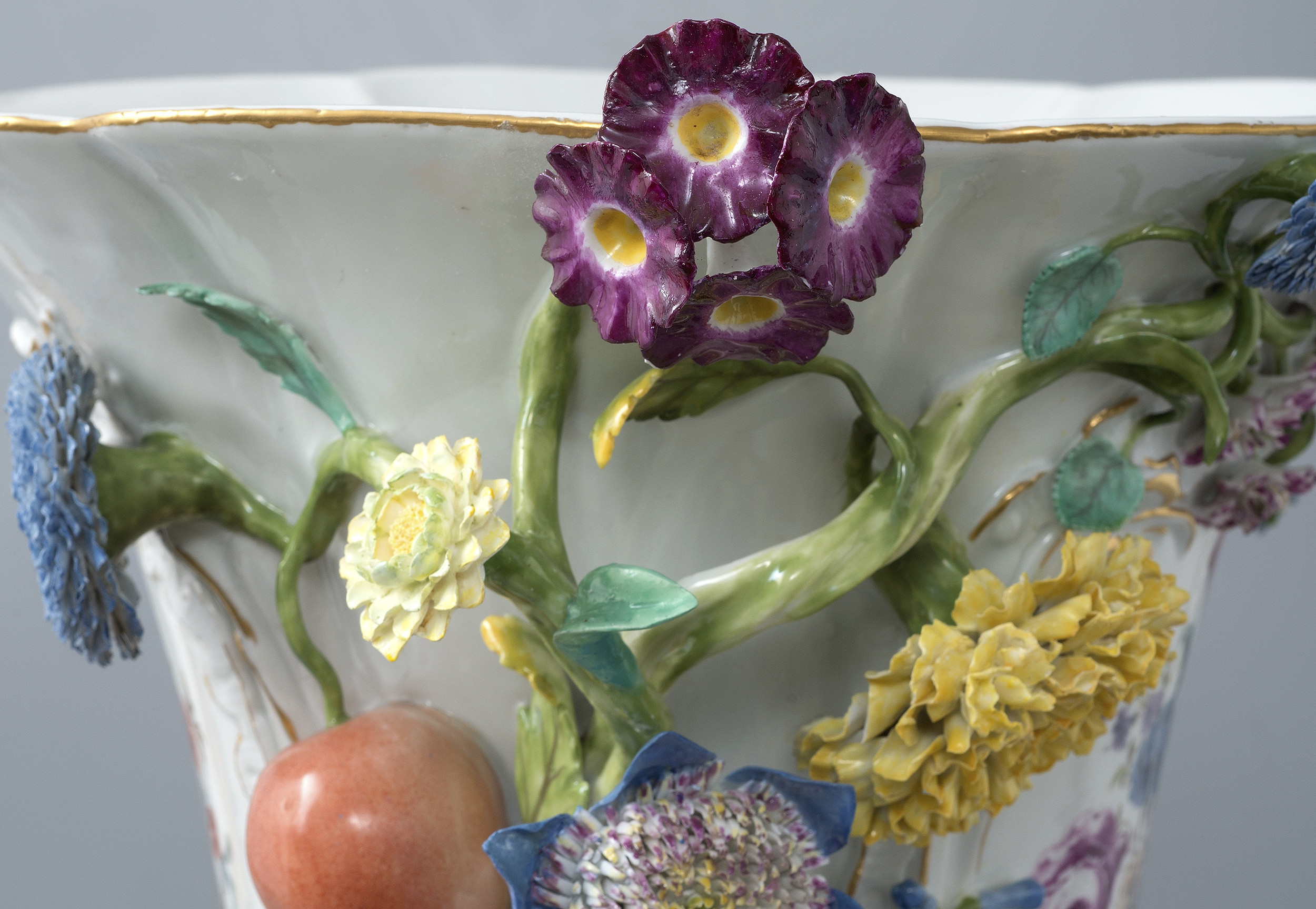 Porcelanowy wazon o kielichowatym kształcie należący do kompletu pięciu wazonów (Wil.3136-Wil.3140), który składa się z trzech naczyń z pokrywami, służących jako pojemniki na pot-pourri oraz pary bez pokryw w typie opisywanego. Takie komplety naczyń o podobnej dekoracji ustawiano w reprezentacyjnych wnętrzach na gzymsach kominków czy stołach. Delikatne, plastyczne kwiaty i owoce, a także cięte ażurowo pokrywy wazonów, stanowiły wyzwanie technologiczne dla wytwórni, miały jednak zadziwiać swą misternością i kunsztem wykonania. Wazon ozdobiono pełnoplastycznymi delikatnymi kwiatami oraz dwoma puttami. Wśród roślin rozpoznać można takie gatunki jak róża, prymulka goździk, i narcyz, dodano także brzoskwinię i cytrynę. Dodatkowo w polach obrazowych obramowanych złoconymi motywami rocaille'owymi, charakterystycznymi dla sztuki rokoka, z przodu i z tyłu wazonu namalowano okazałe bukiety kwiatowe.