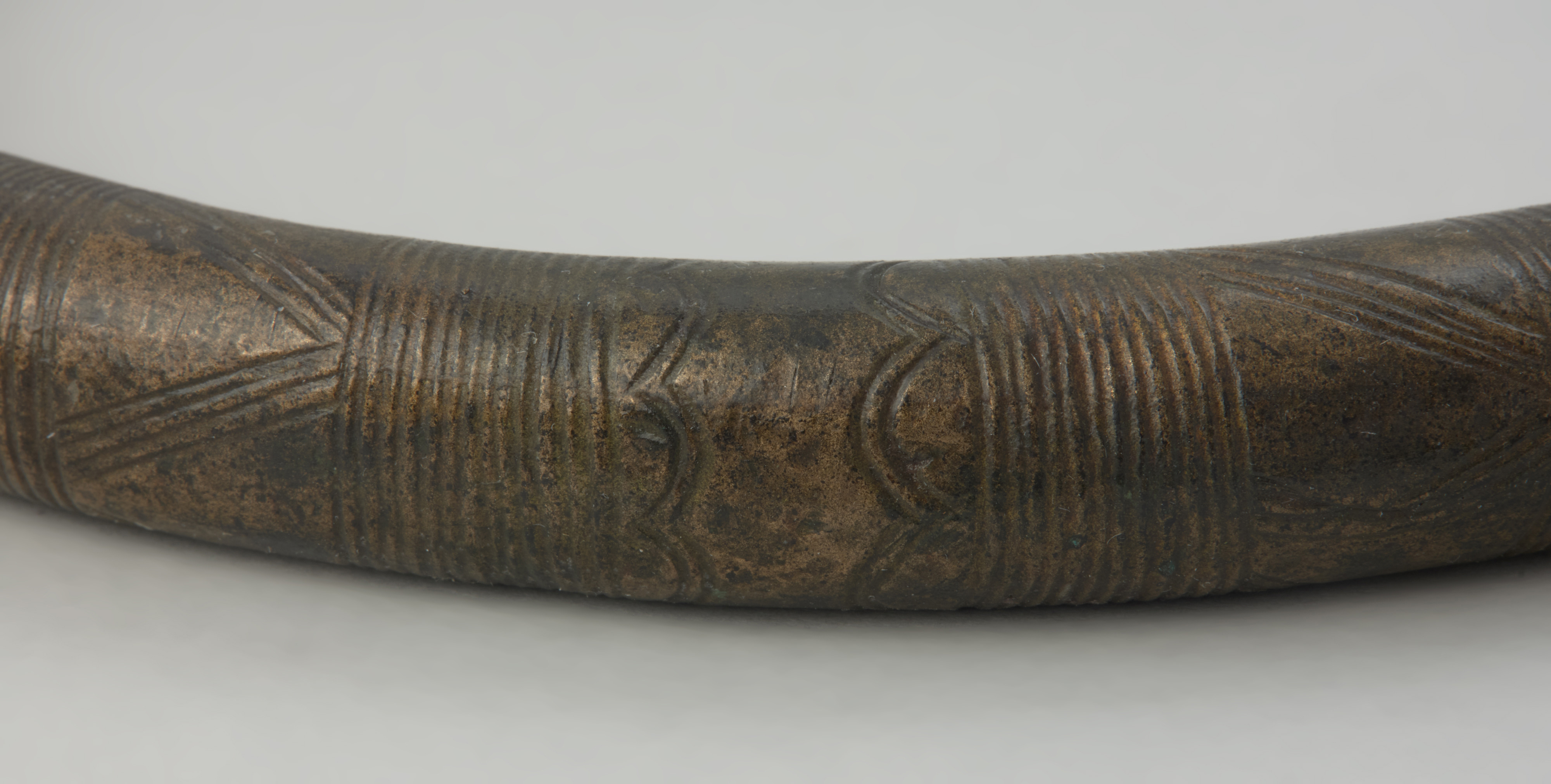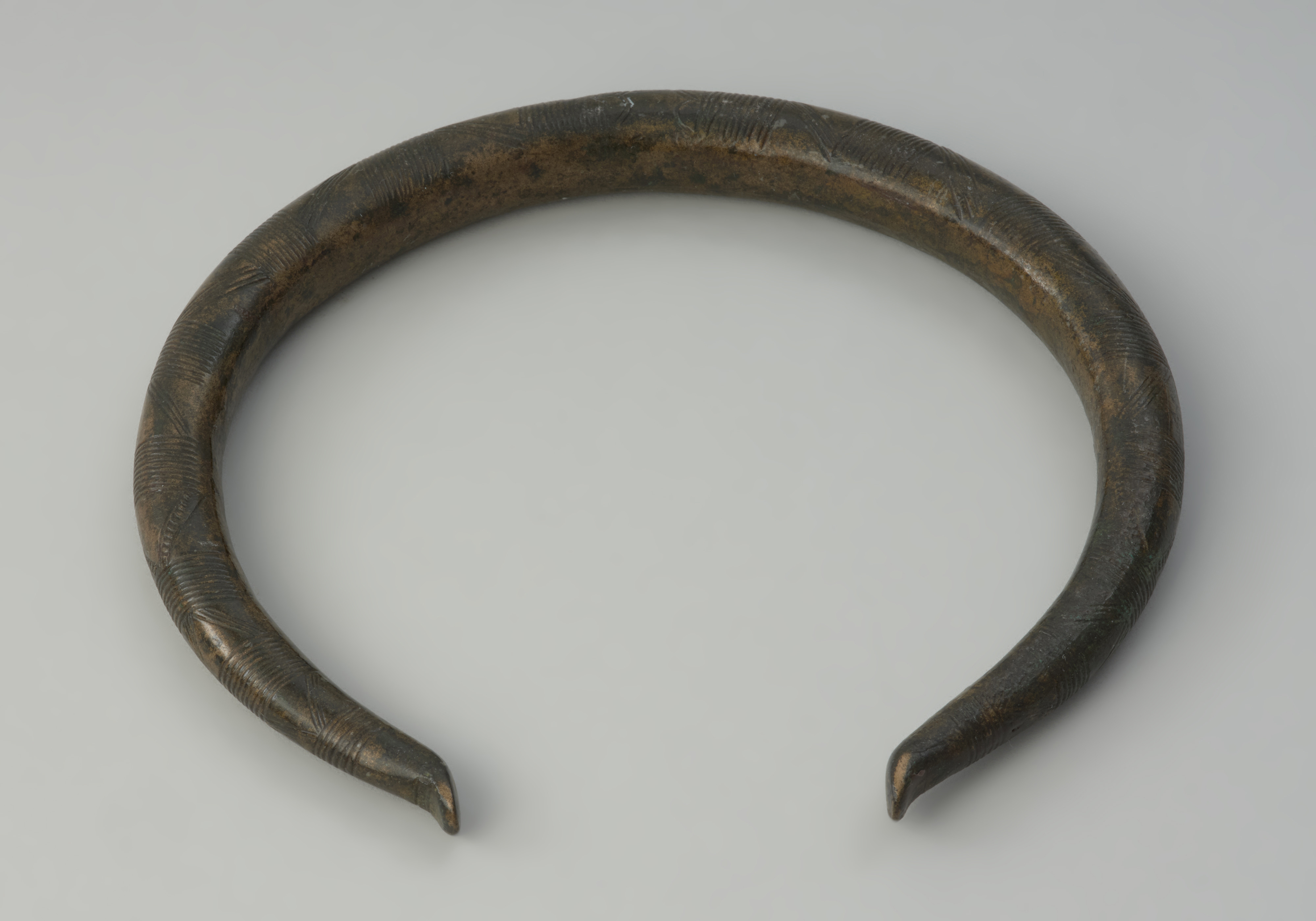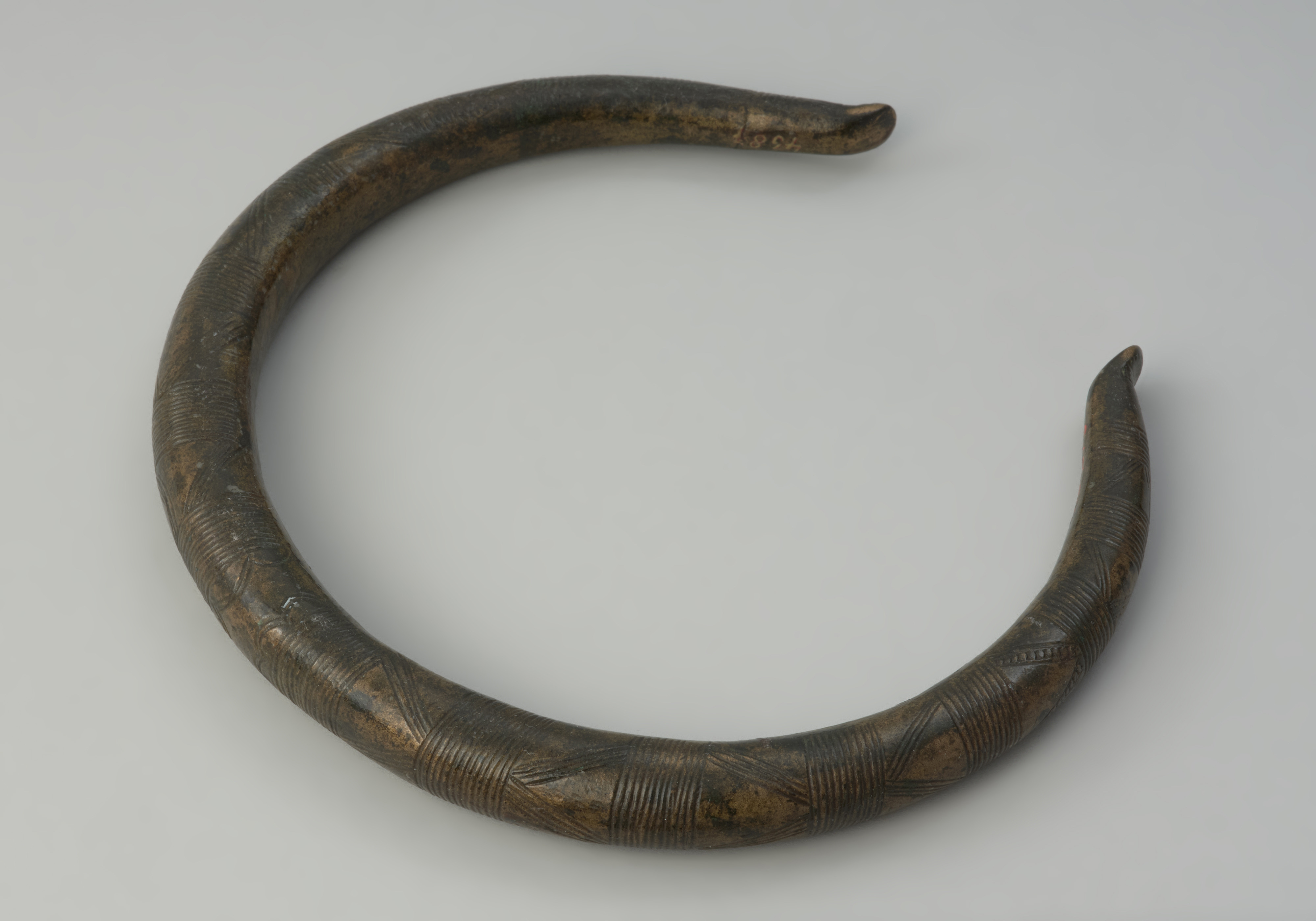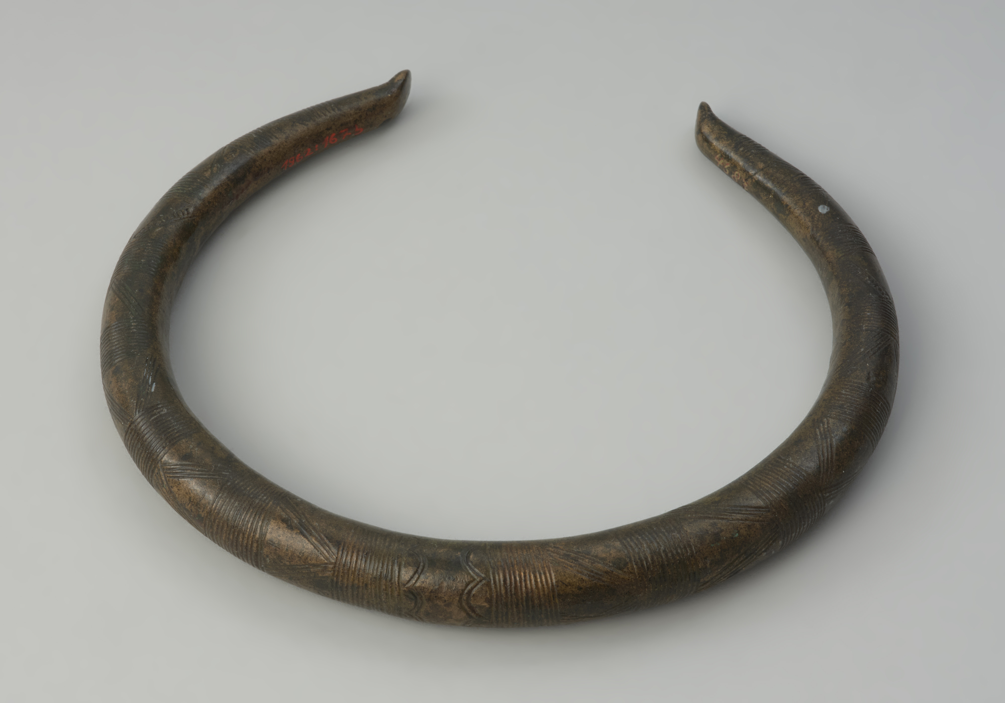 Naszyjnik znaleziony w 1900 roku w miejscowości Czarnówko jest elementem skarbu przedmiotów brązowych, na który natrafiono w torfie podczas kopania rowów. Depozyt zawierał ponadto naszyjnik kołnierzowaty, dwa sierpy, wisiorek oraz dwa spiralne nagolenniki. Prezentowany naszyjnik wykonano z grubego okrągłego pręta, którego zakończenia są odgięte na zewnątrz. Jest zdobiony poprzecznymi kreskami, trójkątami oraz łukami. Datowany jest na środkową epokę brązu (ok. 1300–1200 p.n.e.).