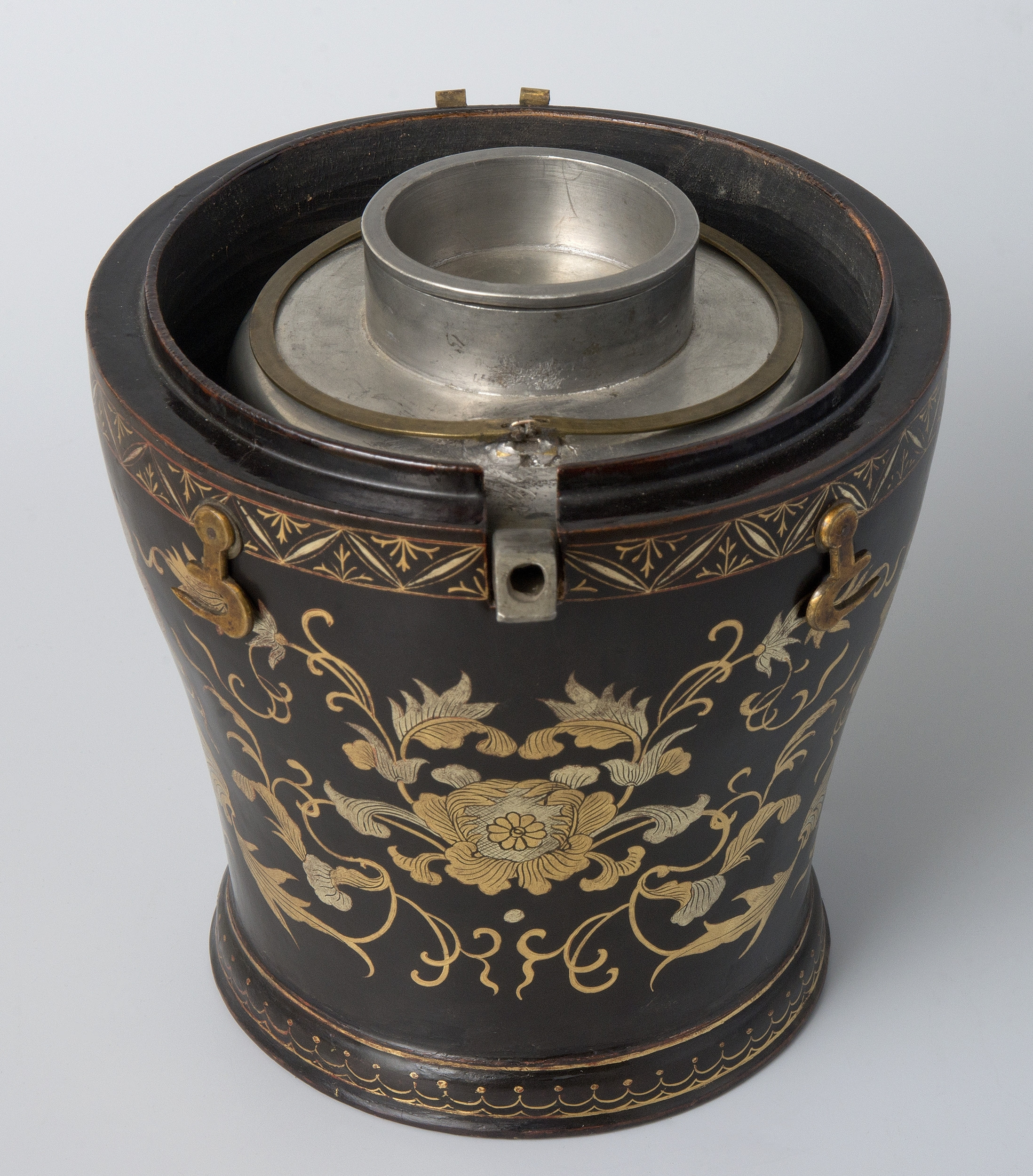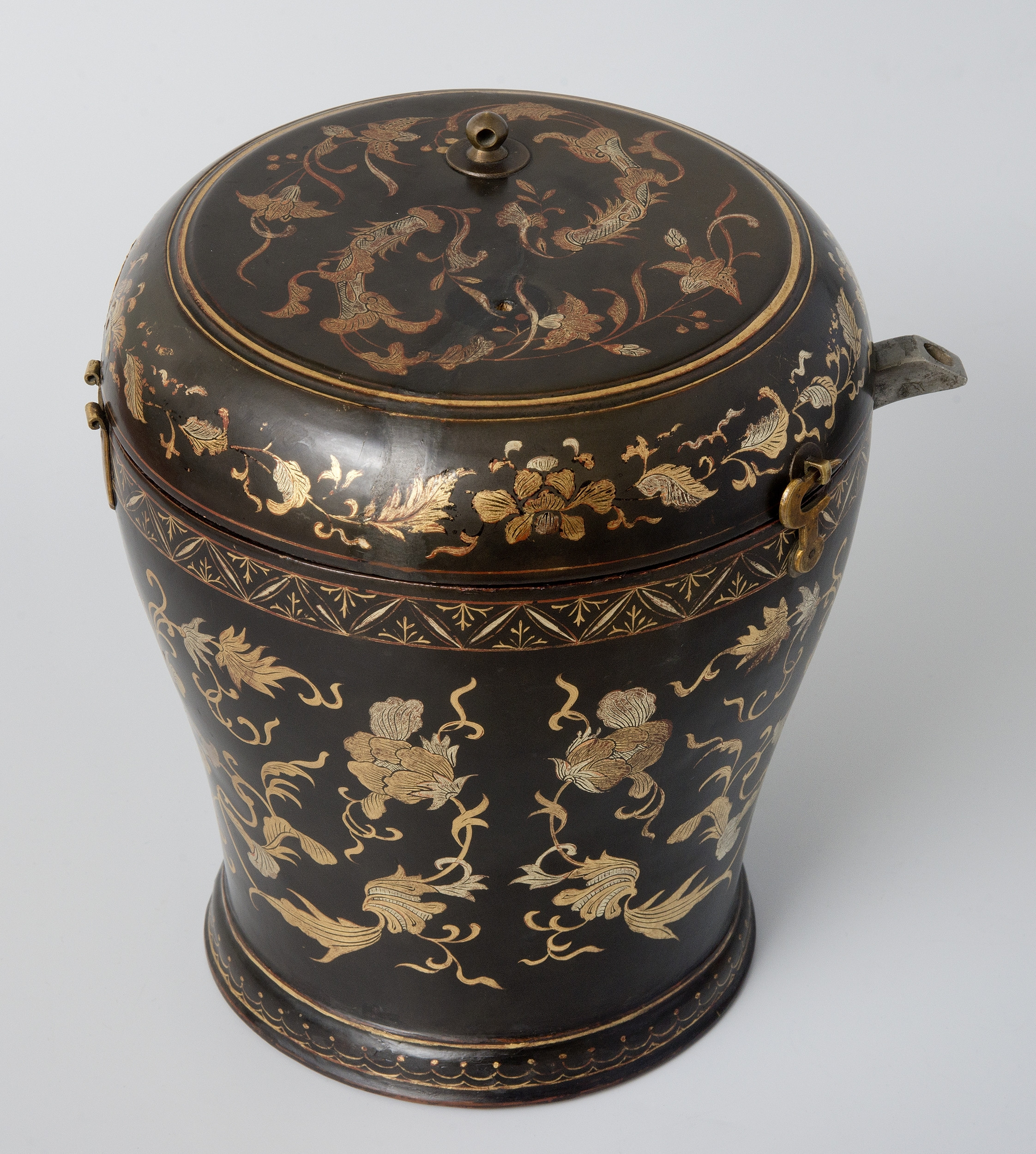 Cylindryczne naczynie rozszerzające się w górnej części, z pokrywą z elementem dawnego uchwytu. Pojemnik został wykonany z drewna i pokryty wieloma warstwami laki i dodatkowo ozdobiony delikatną, w głównej mierze floralną ornamentyką. Podstawa i górna krawędź pojemnika została obwiedziona ciągłym ornamentem o powtarzającym się motywie geometrycznym. W górnej części naczynia wycięto kwadratowy otwór na dziobek imbryka. Na pojemniku po bokach wyciętego otworu i powyżej na pokrywie zachowały się mosiężne okucia stanowiące mechanizmu łączącego pokrywę z pojemnikiem. Po przeciwnej stronie wyciętego otworu pozostało jedno okucie, będące elementem zawiasu łączącego pojemnik z pokrywą. Do pojemnika idealnie pasuje prosty, cynowy imbryk, oraz tekstylna osłona ściągana tasiemką w górnej części.