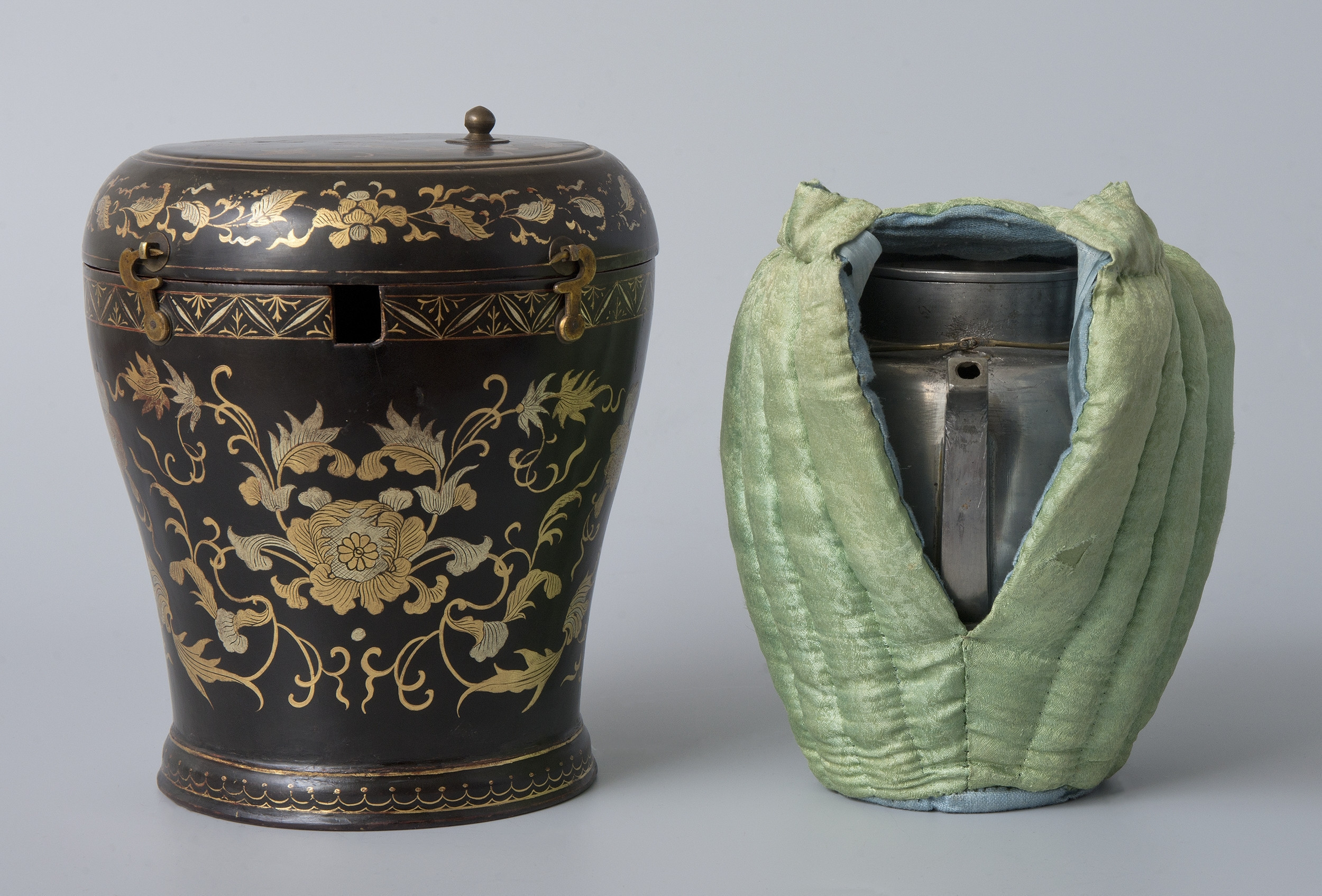 Pojemnik służył niegdyś jako ogrzewacz na imbryk. Lekkie rozpulchnienie drewnianego przedmiotu sugeruje, że faktycznie pojemnik pełnił kiedyś rolę swoistego termosu. Zapisy w dokumentach archiwalnych wskazują na obecność tego przedmiotu w dawnych Pokojach Chińskich w 1. połowie XIX w. W kolekcji wilanowskiej znajduje się jeszcze jeden analogiczny obiekt, bez zachowanego imbryka i tekstylnego pokrowca.